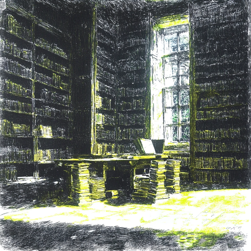 Strong directional light casts deep shadows, enhancing contrast; textures are varied, offering both smooth and intricate details. Yellow highlights carve space, juxtaposing against the monotone hues, emphasizing depth.