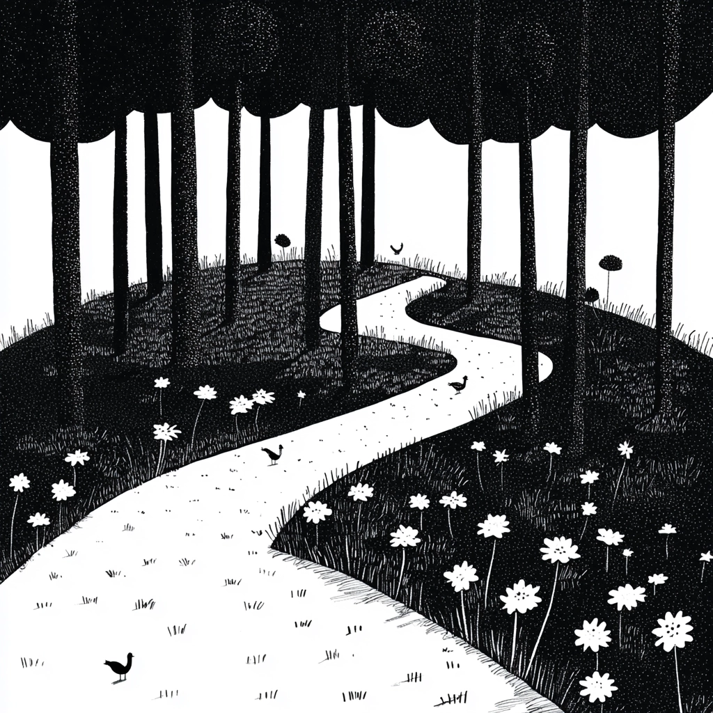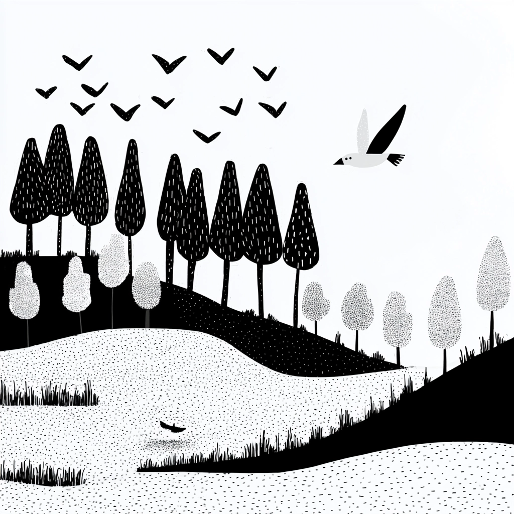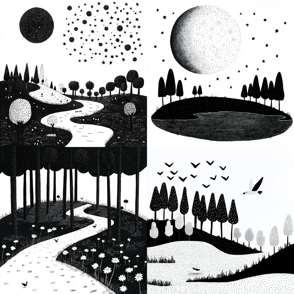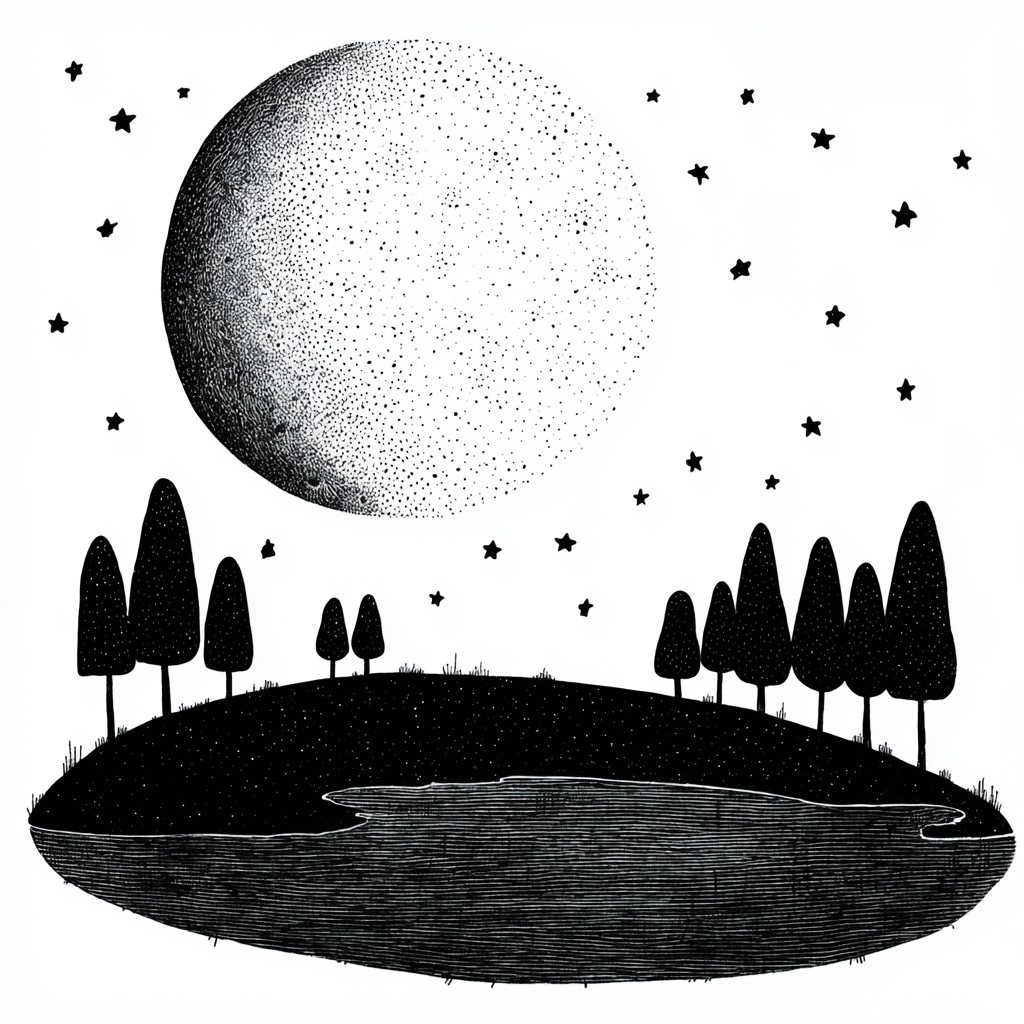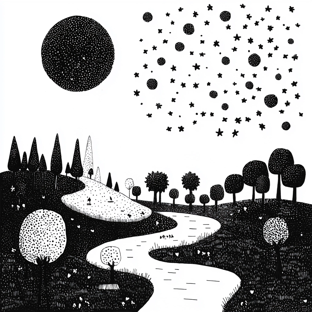 The stippling technique creates textured shading effects, enhancing the realism of the contours. Even lighting results in clear contrasts that delineate the space emphatically. The absence of color focuses attention on shapes, light, and shadows.