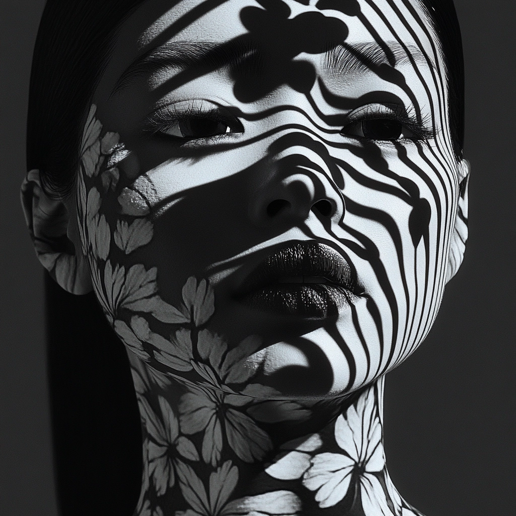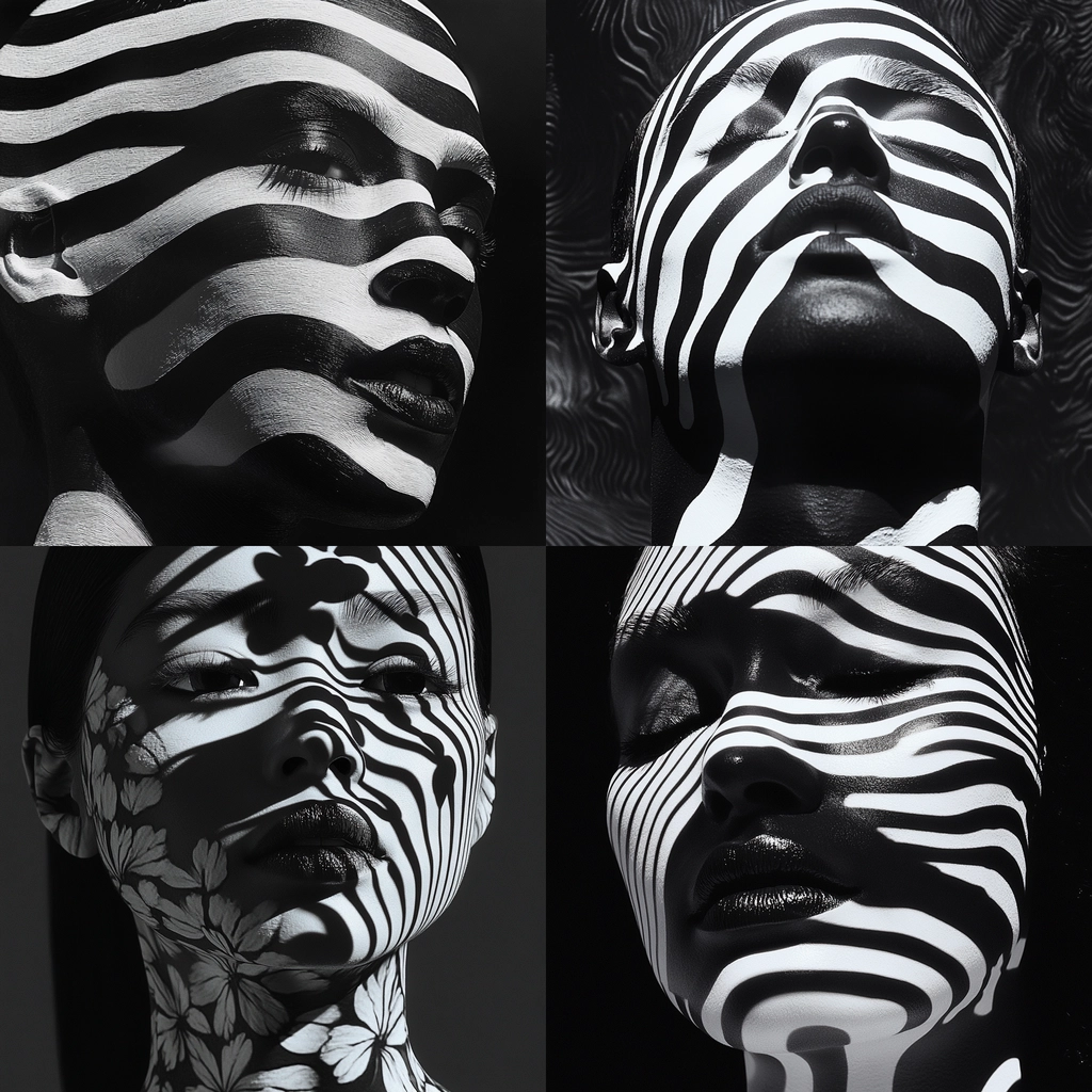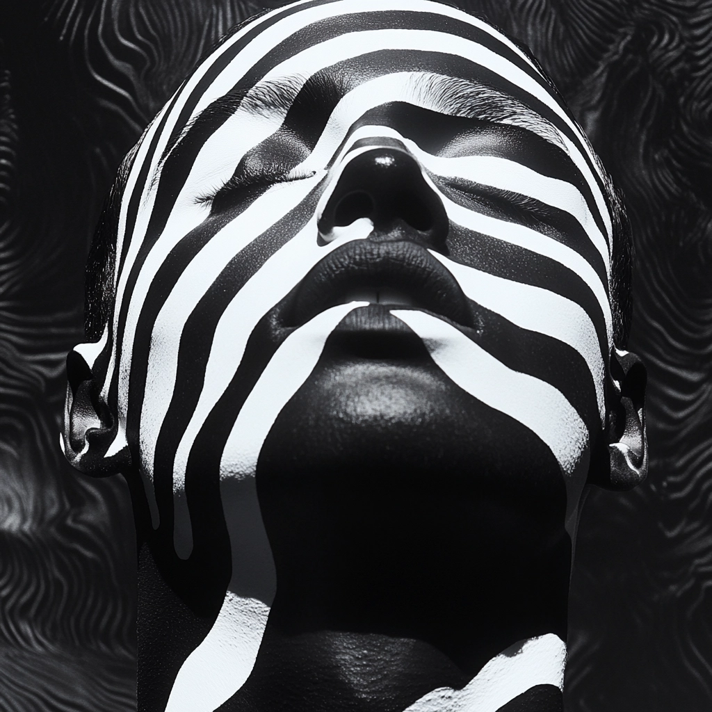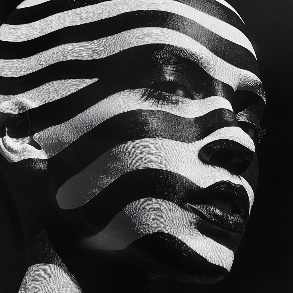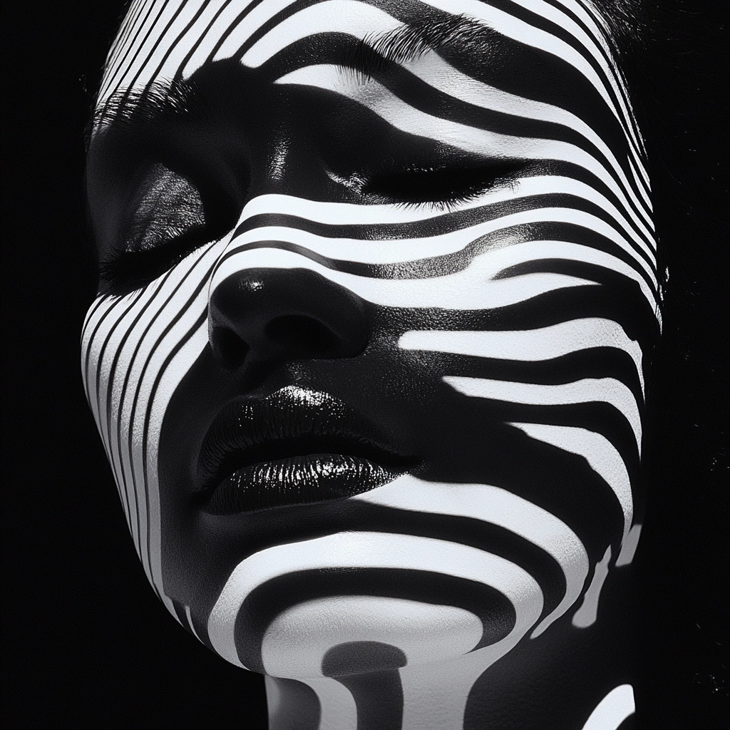 Lighting emphasizes the dynamic interplay between light and shadow across the surfaces. White stripes provide stark contrast against the deep black background, creating depth and a sense of movement. Smooth texture accentuates the sharpness of the lines and contours.