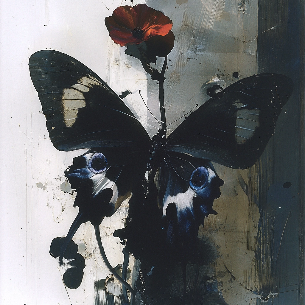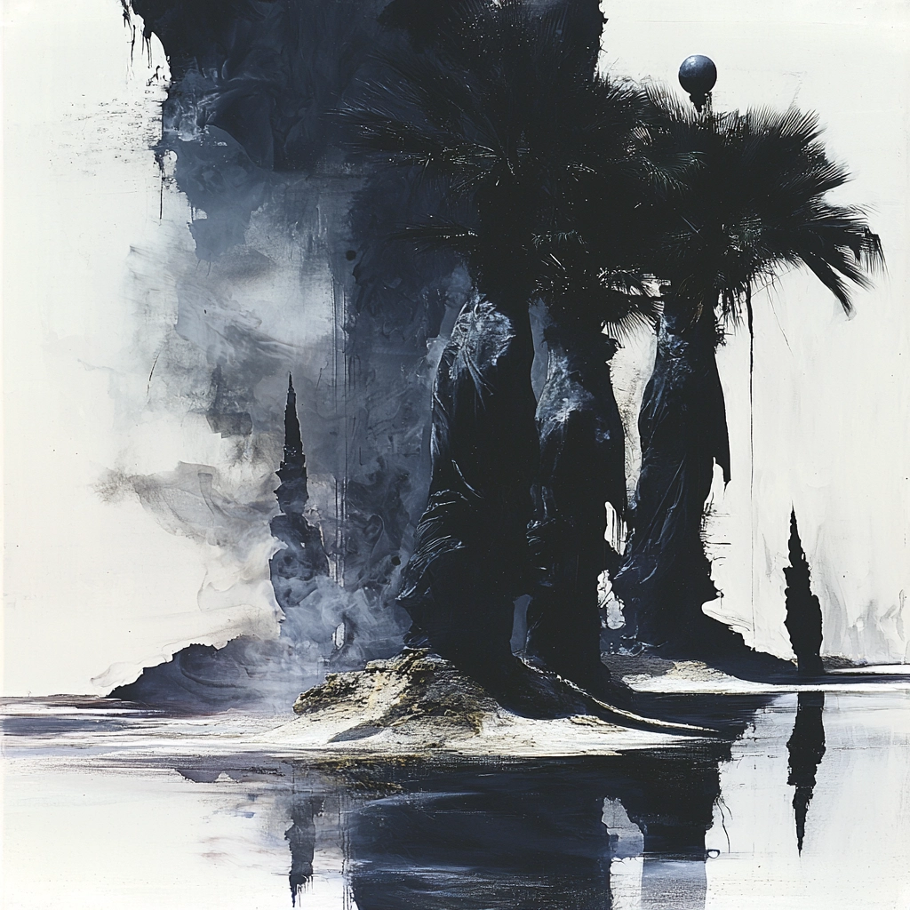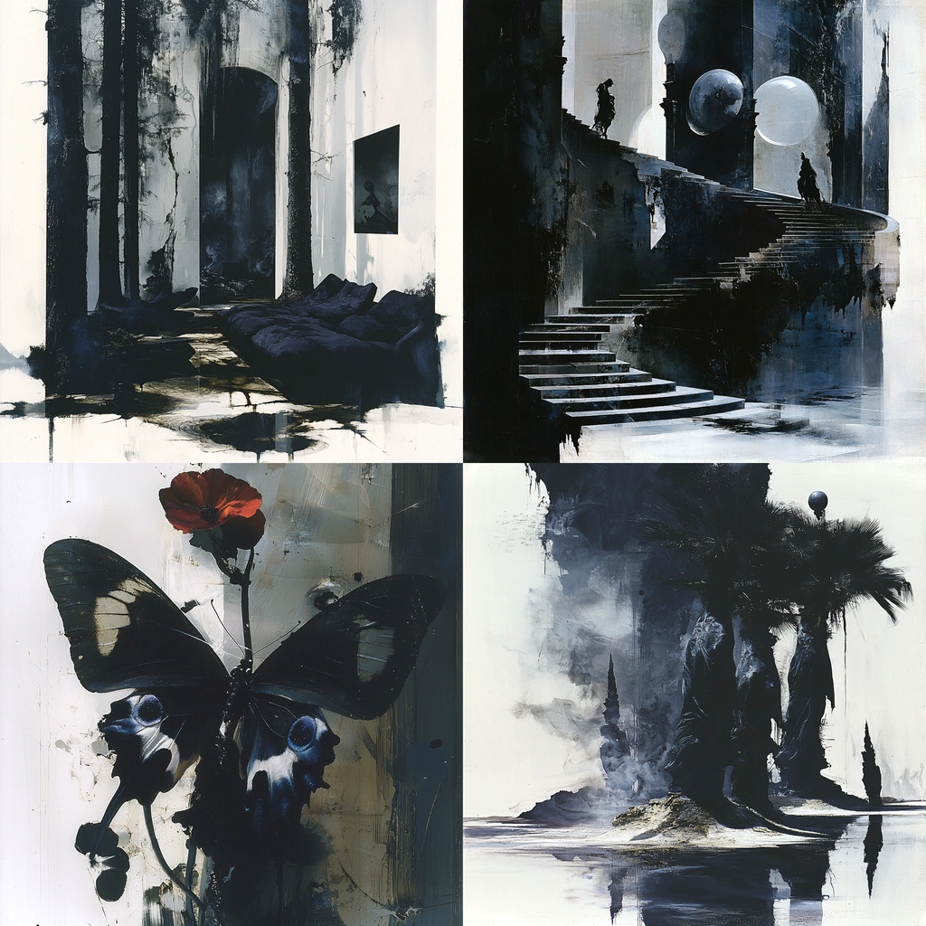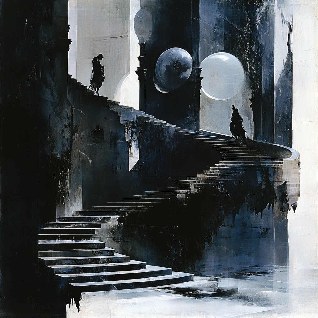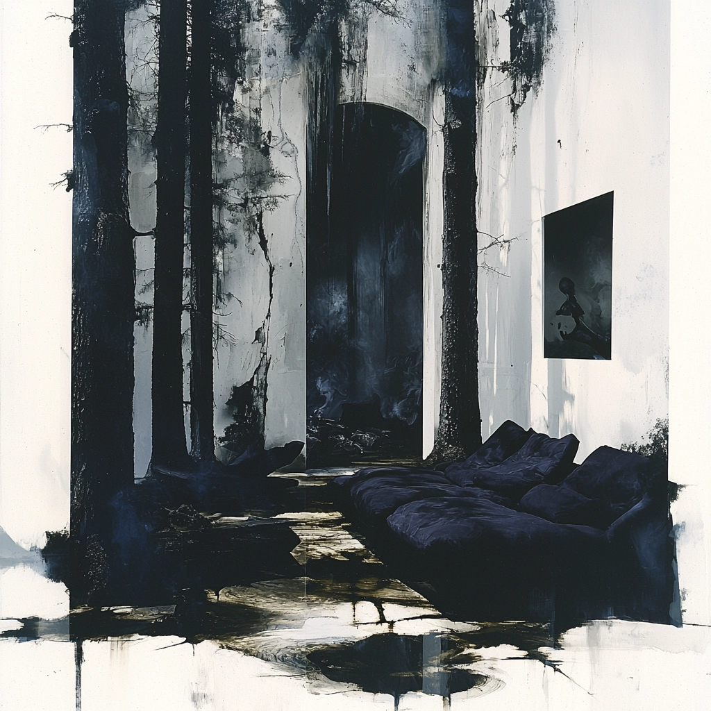 The lighting emphasizes sharp contrasts, casting deep shadows and highlighting objects against muted grays. Black provides strong linear elements, while a splash of red draws attention. The brushwork is textural, suggesting rough surfaces and layered compositions that explore spatial intricacies.