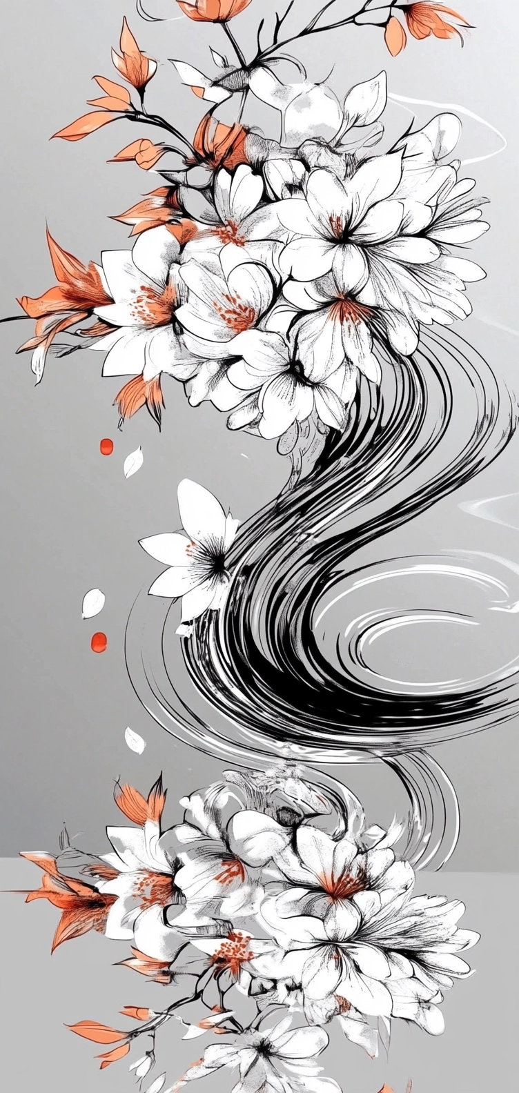 Flowing lines and sharp contrasts enhance bold monochrome with vivid accents.