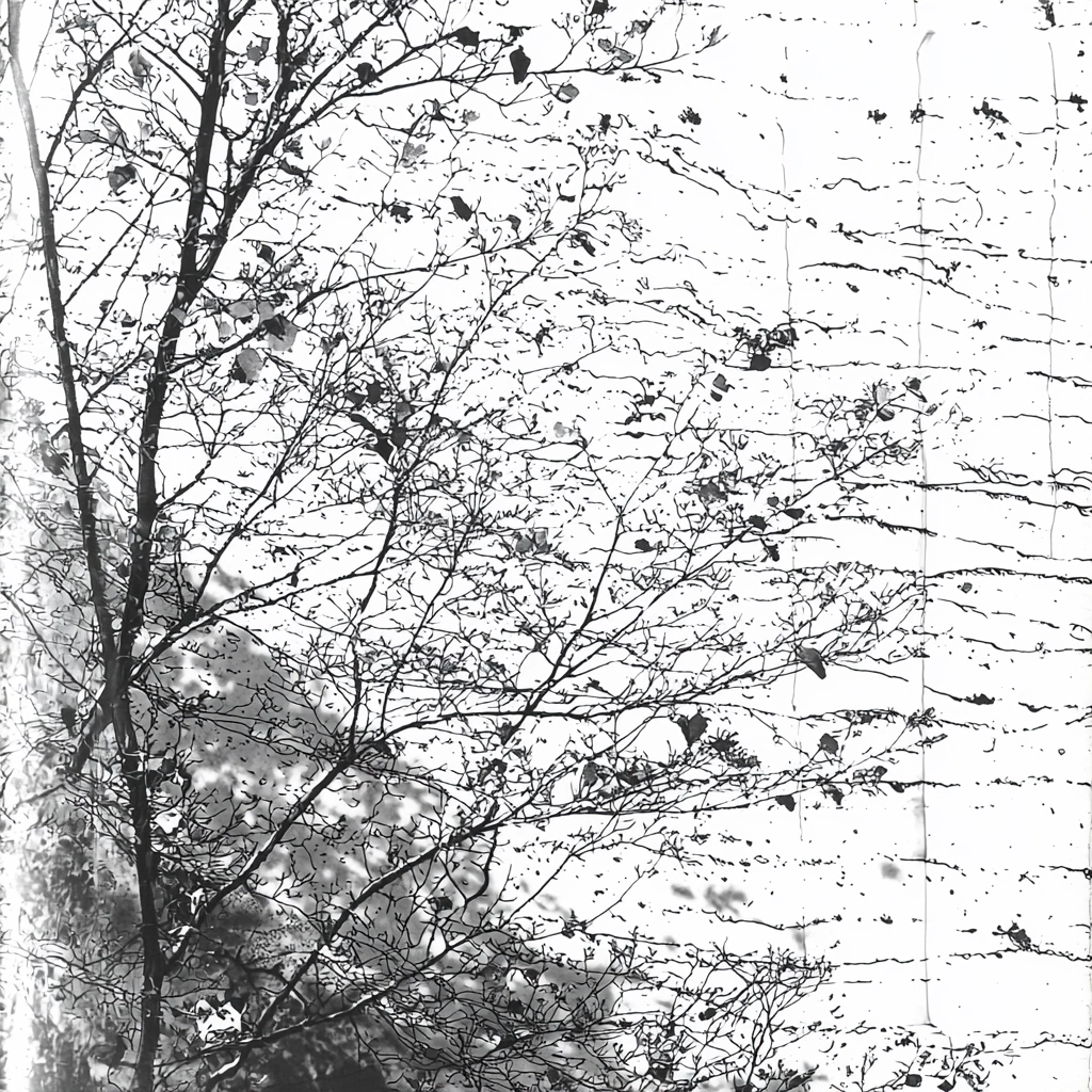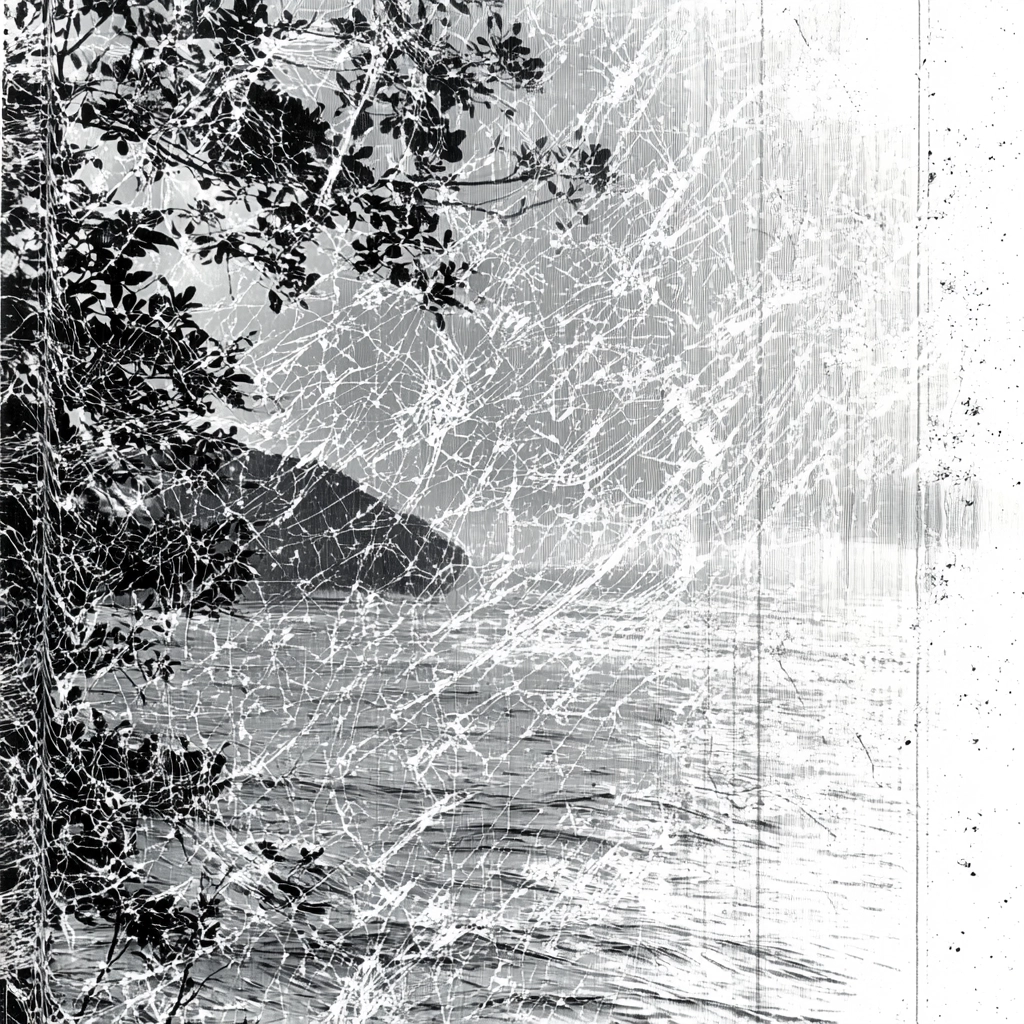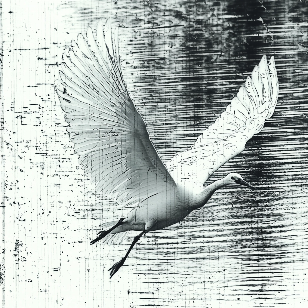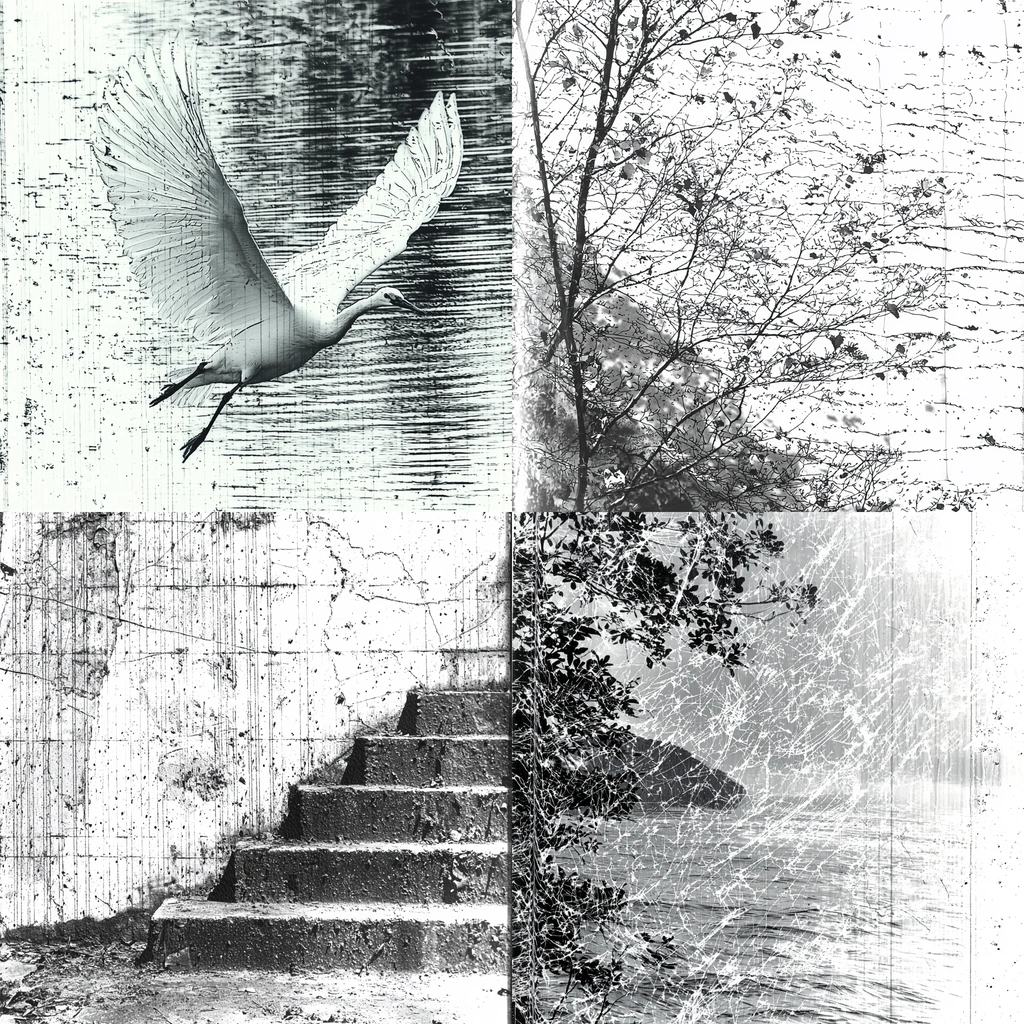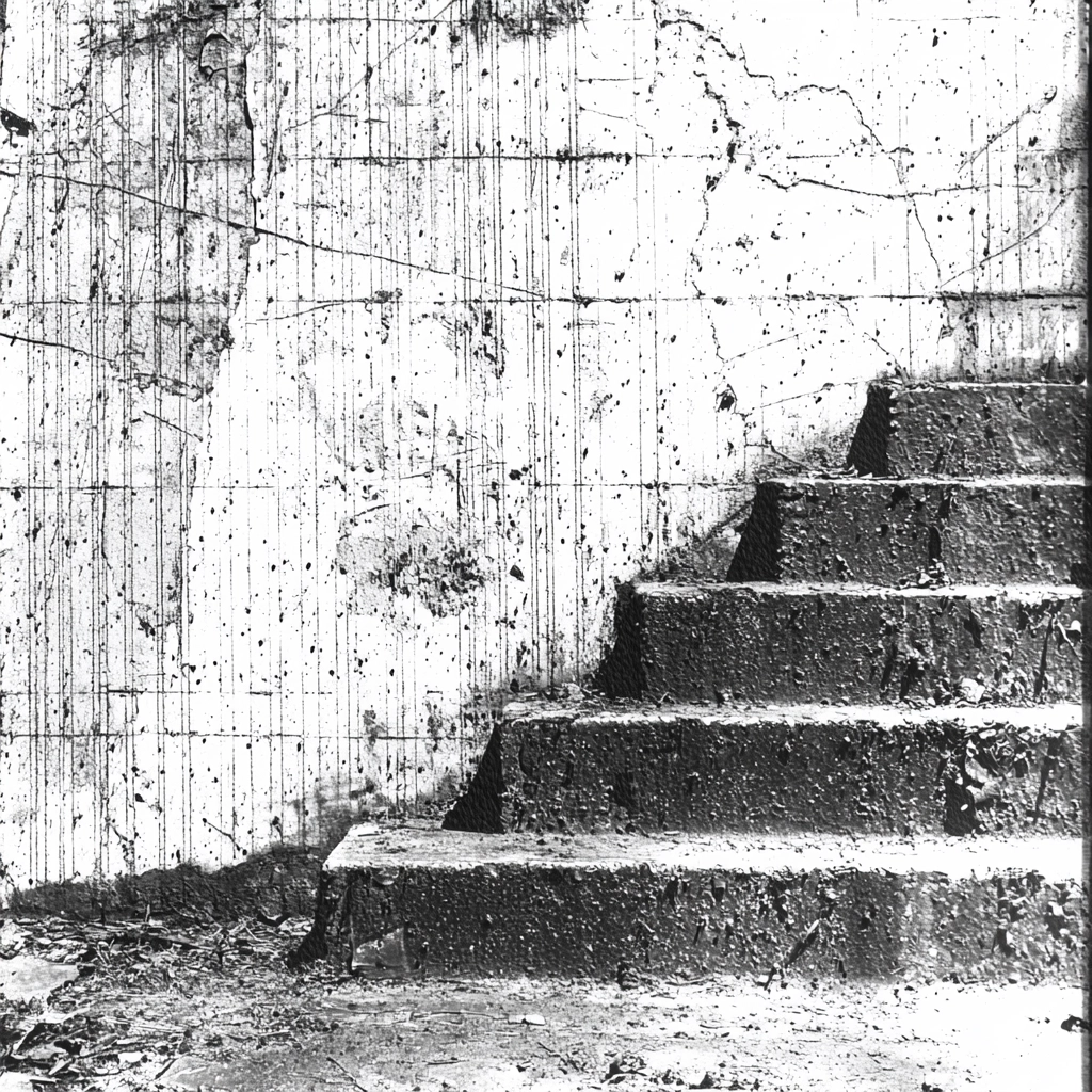 The piece uses stark lighting to create a striking contrast between blacks and whites. The textures are rough, lending a tactile quality, while spatial depth is achieved through layered compositional elements.