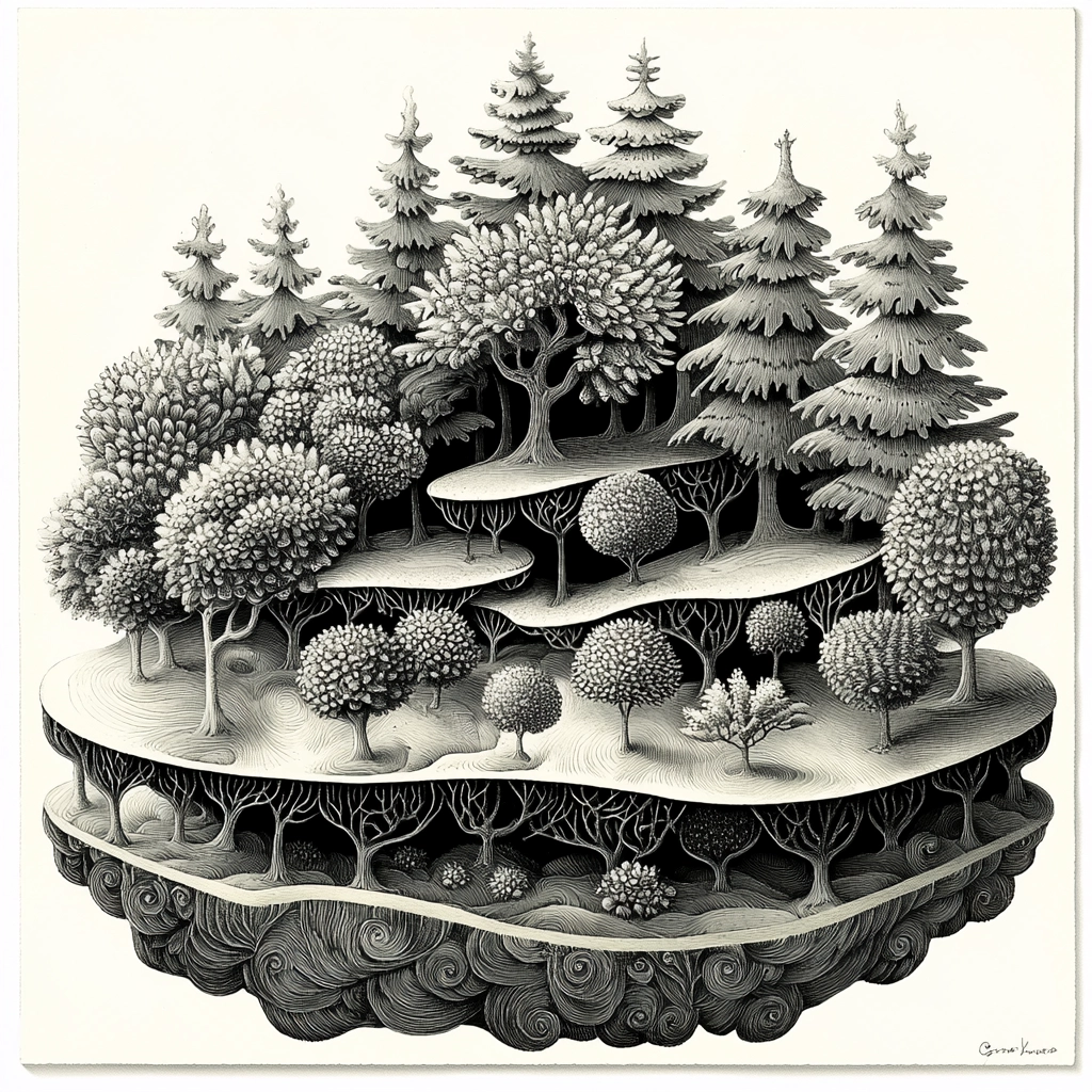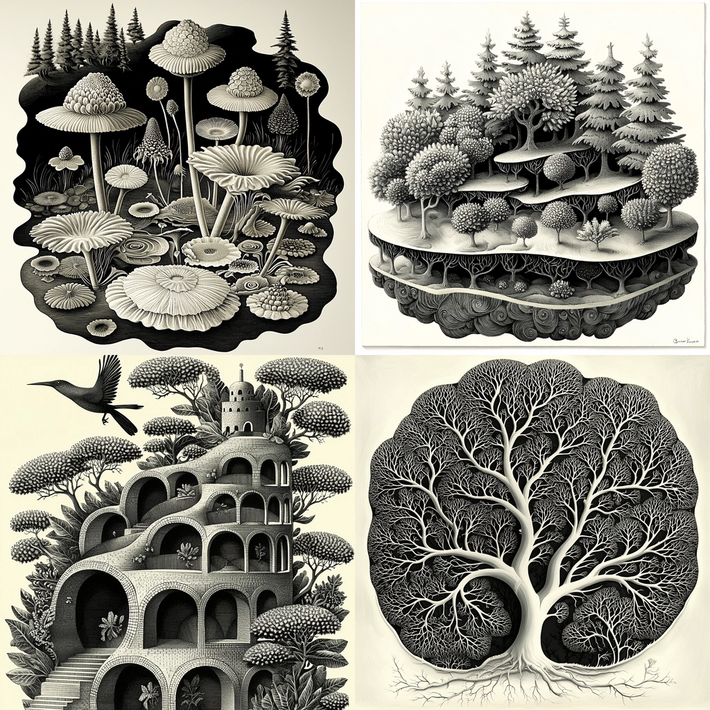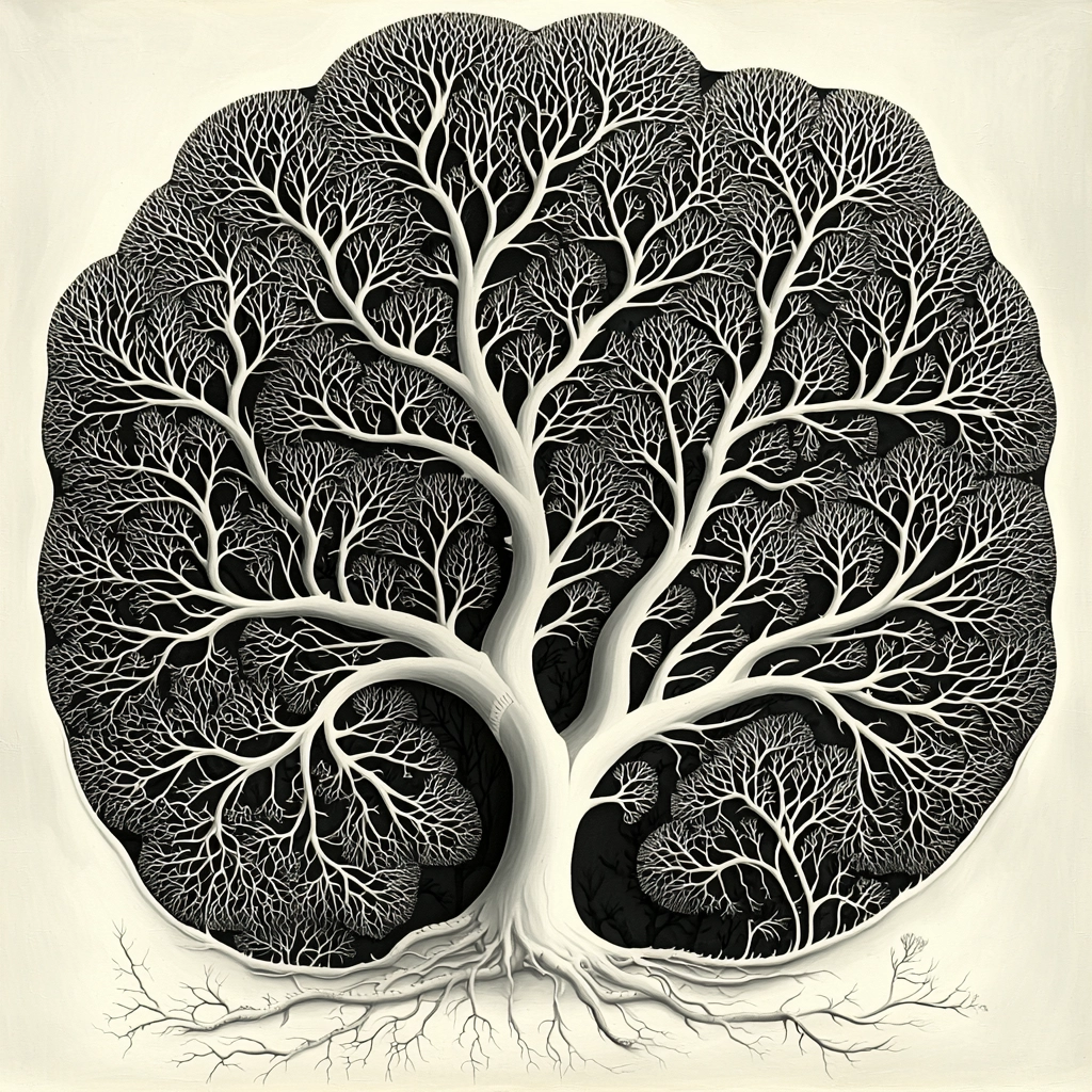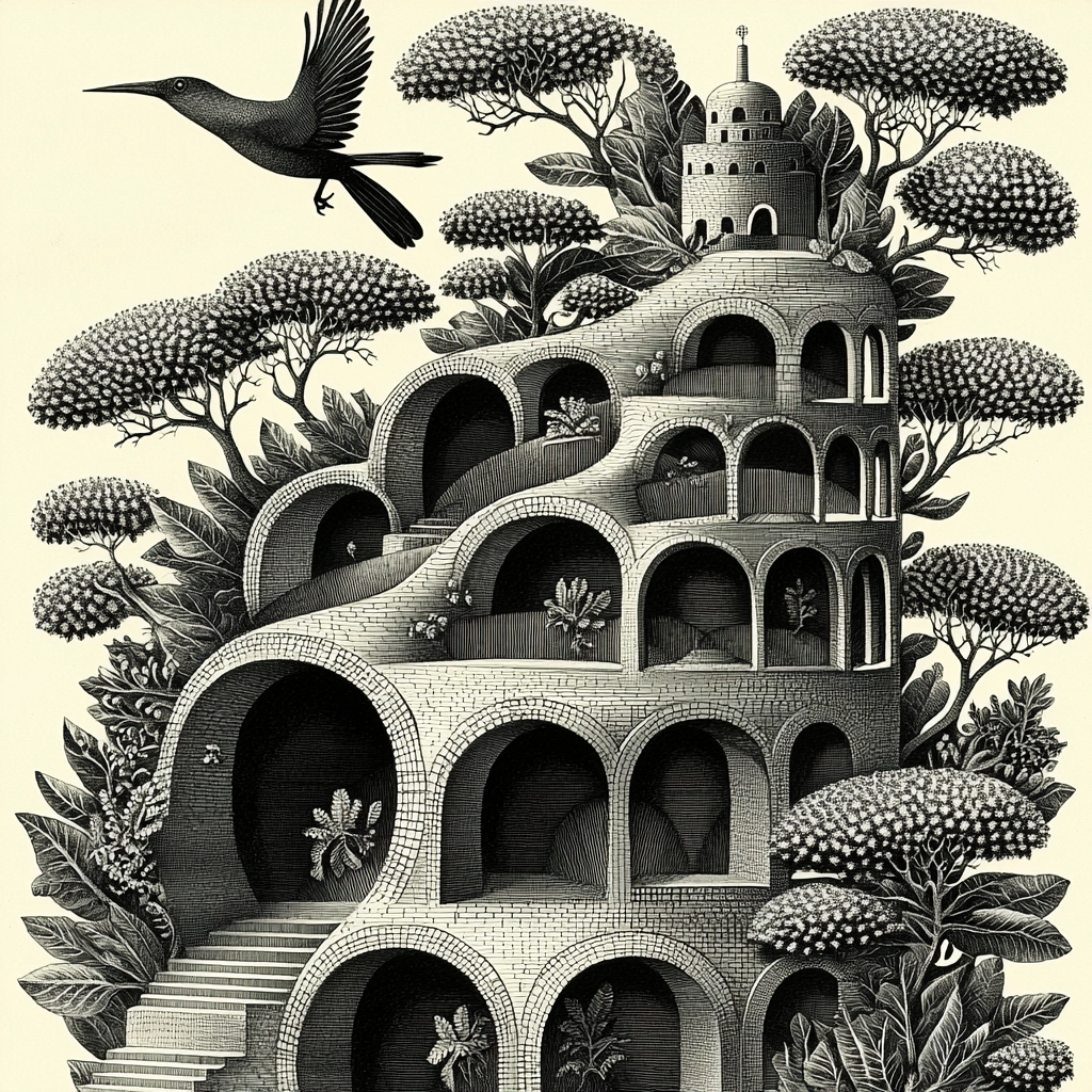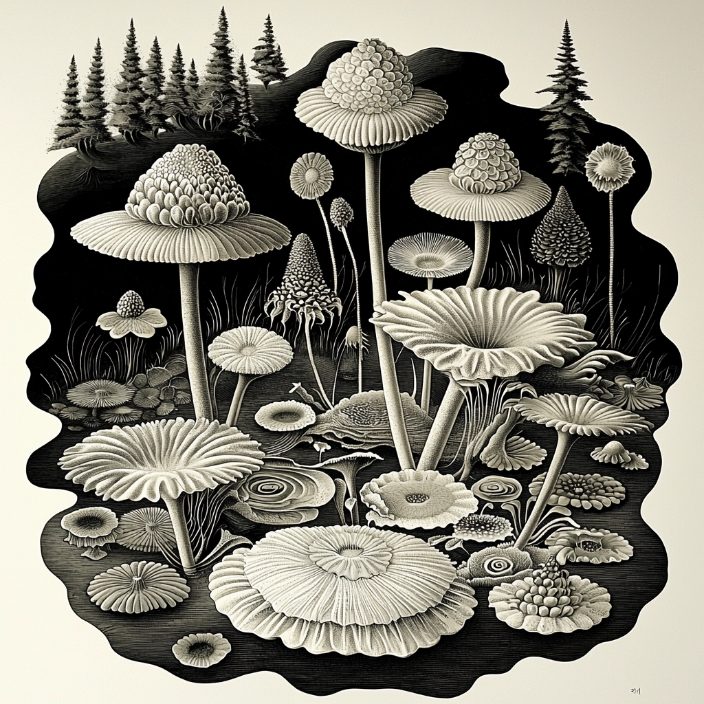 The use of monochrome highlights detailed line work, with intricate textures enhancing depth and spatial relationships. The interplay of light and shadow provides a dynamic, three-dimensional quality, while emphasizing the intricacy of the design elements.