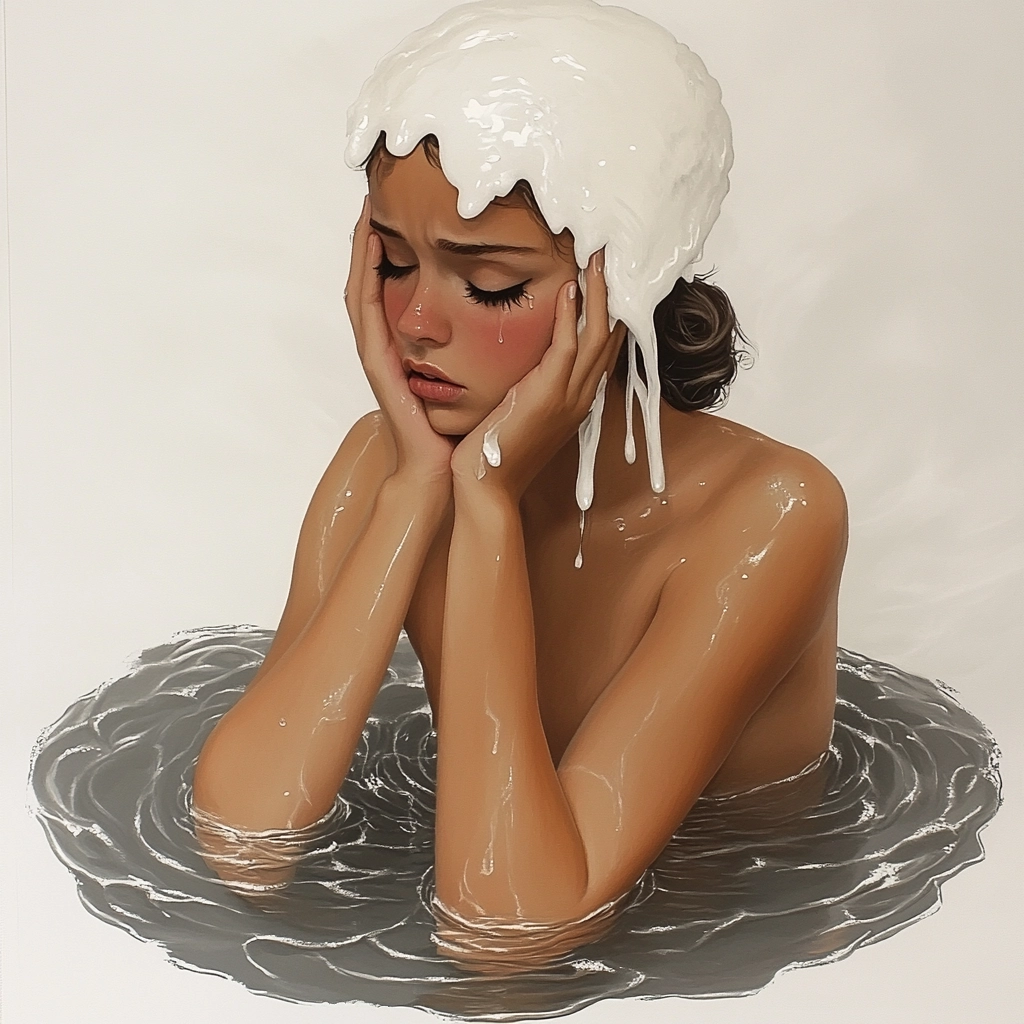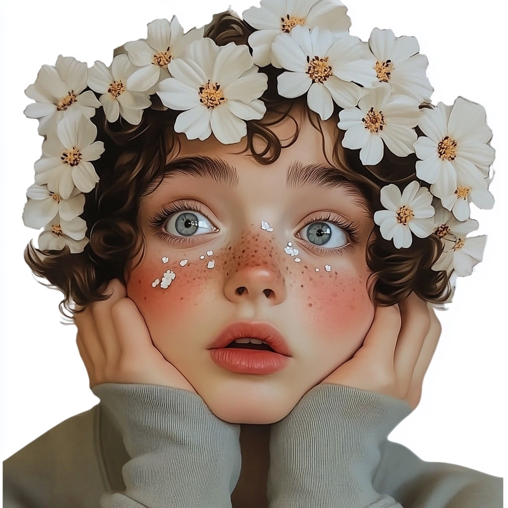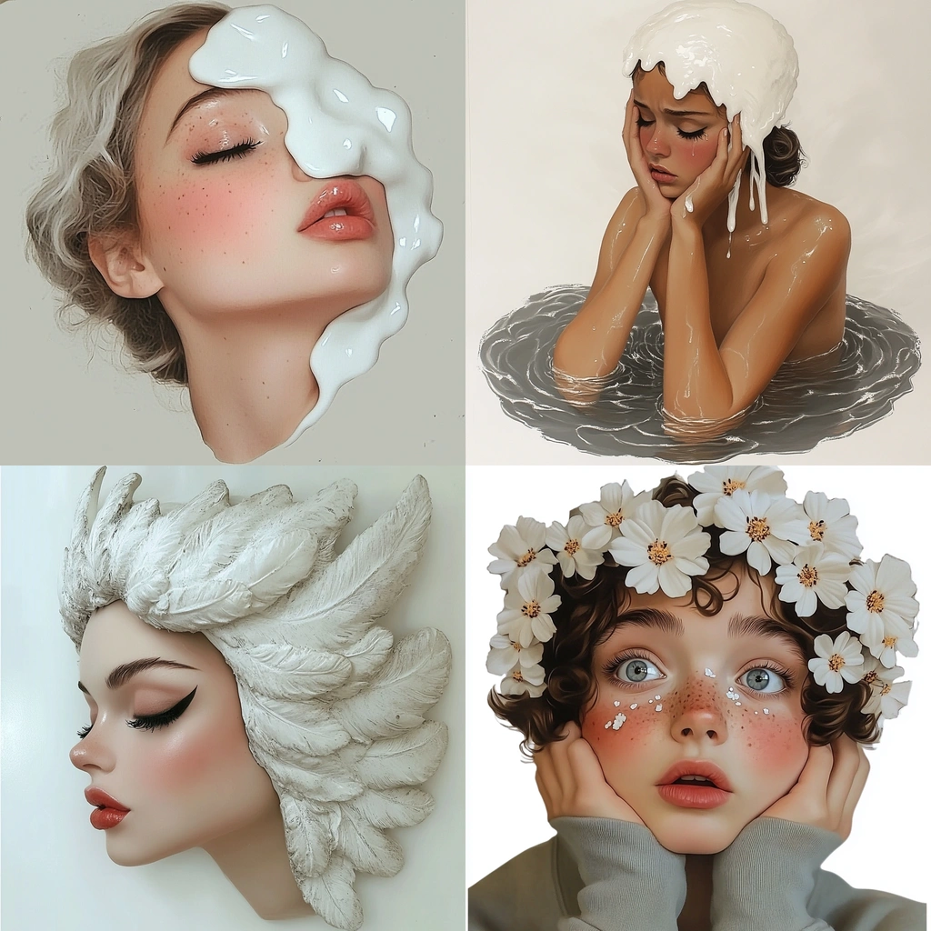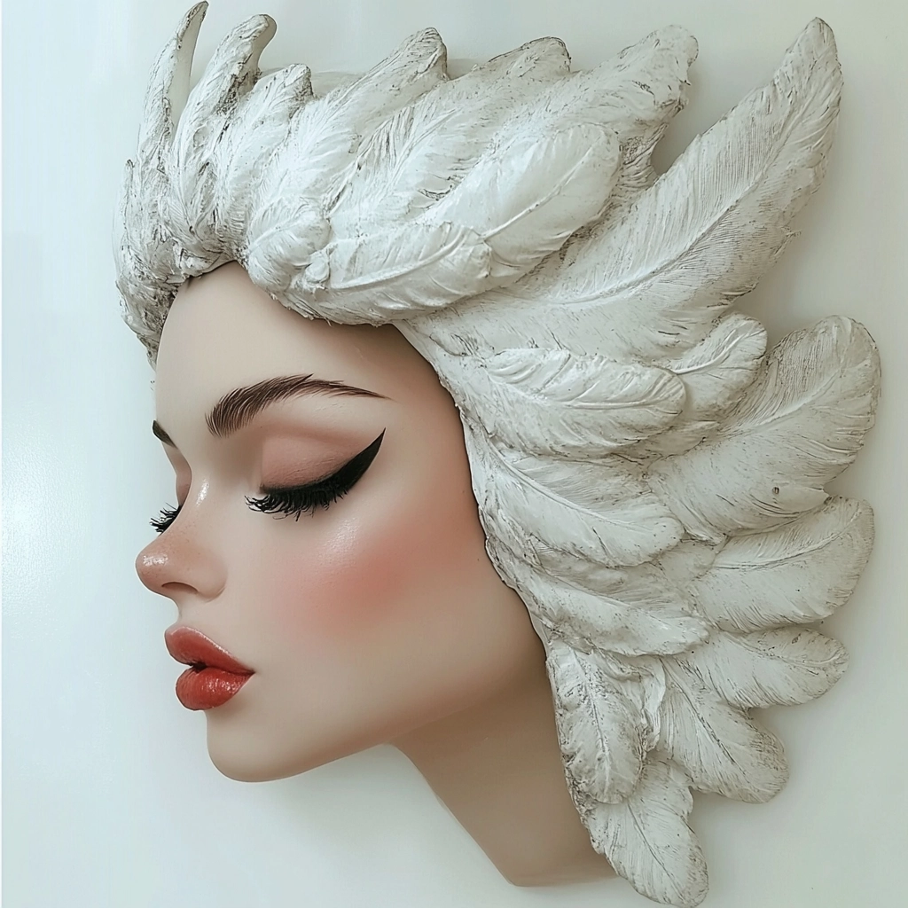 Soft lighting accentuates detailed textures, creating a realistic portrayal. The spatial arrangement is well-balanced, giving a grounded yet ethereal presence. The play of light and shadow adds depth to the forms.