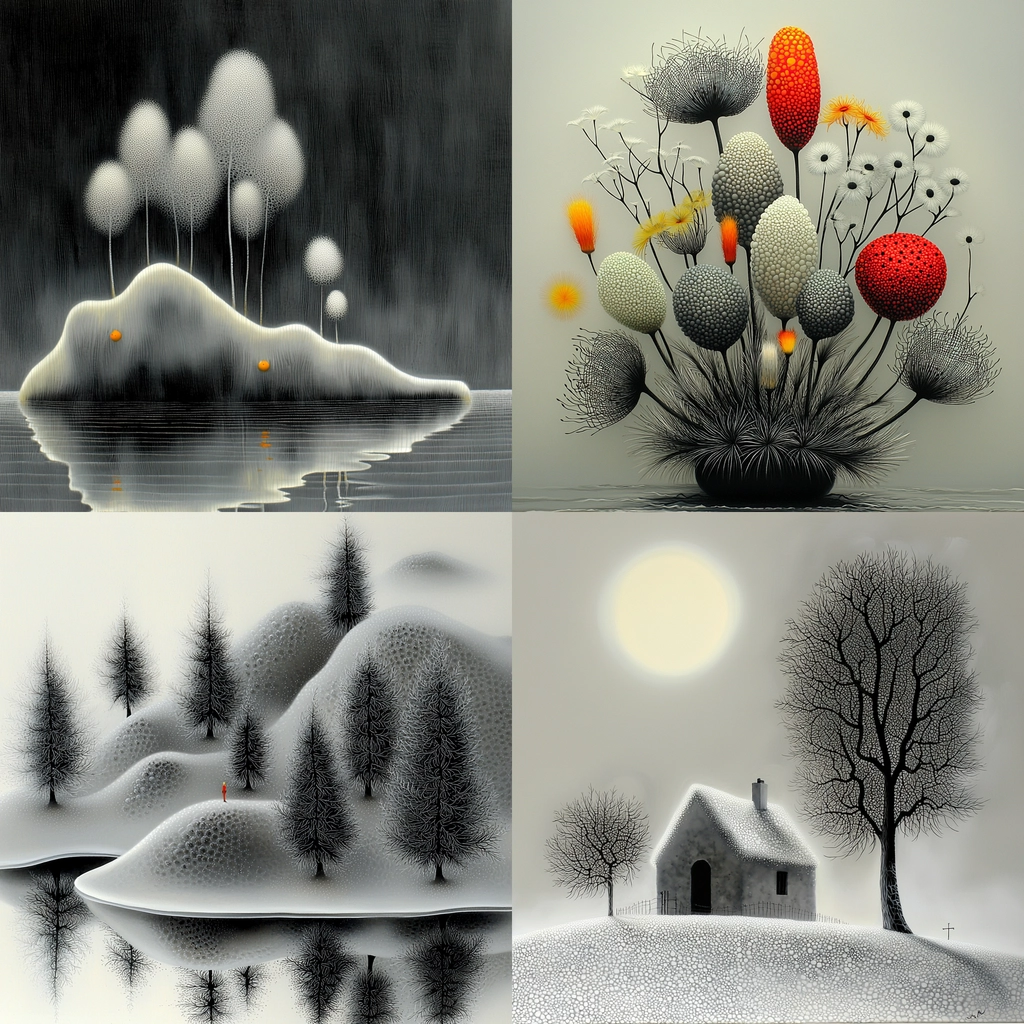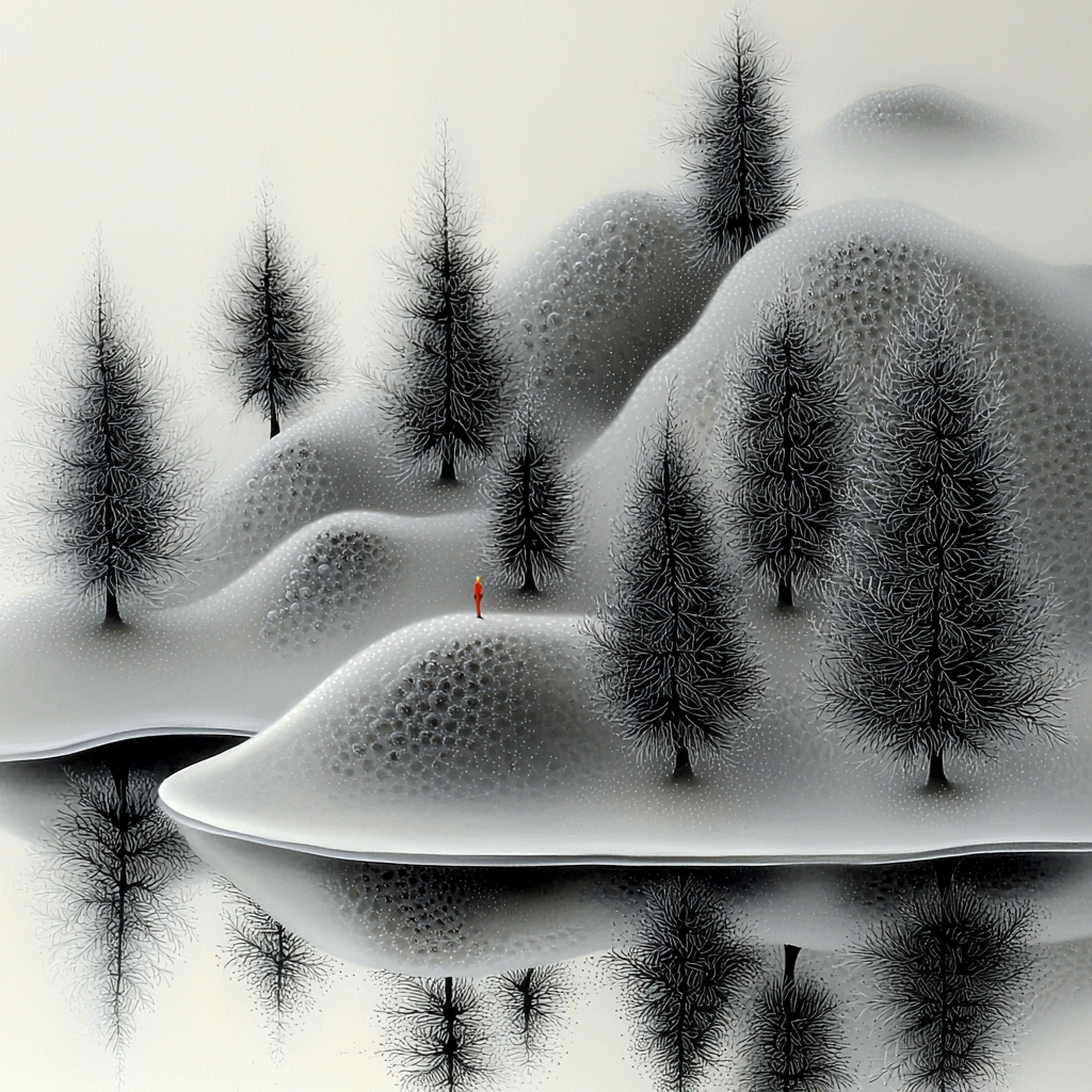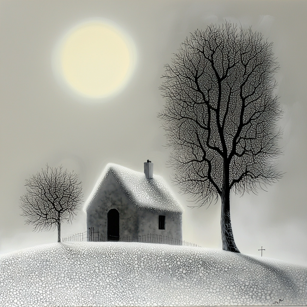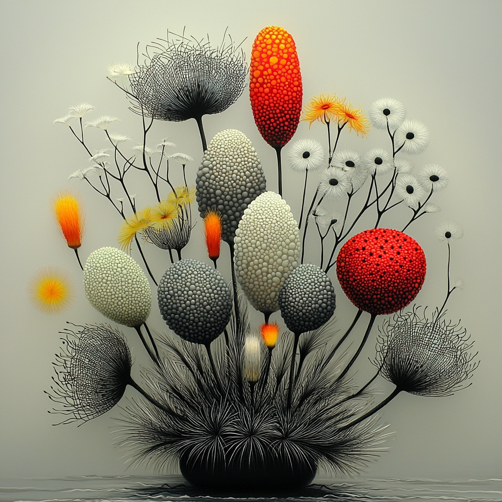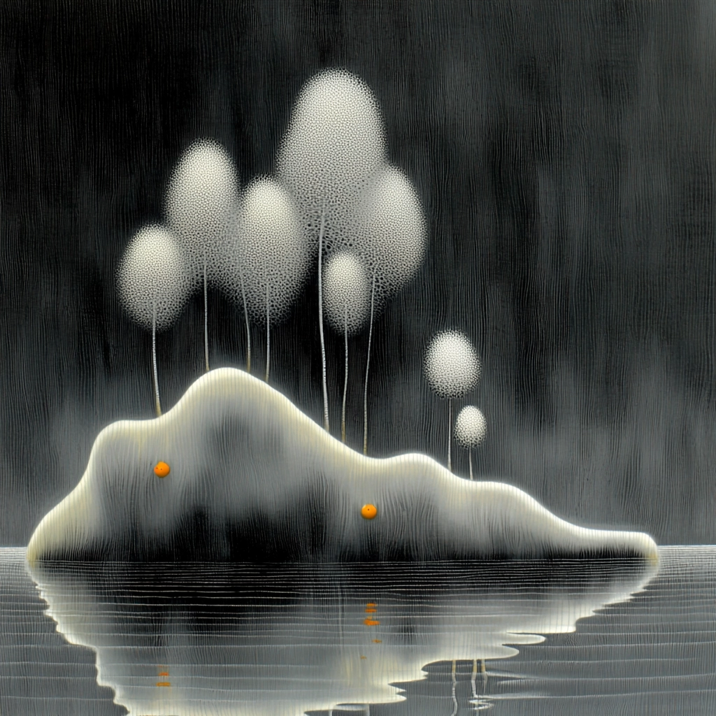 The lighting is diffused, enhancing soft, delicate transitions between black, white, and gray shades. Texture dominates, creating tangible surfaces with intricate detail. The spatial arrangement is balanced, emphasizing uninterrupted visual flow.