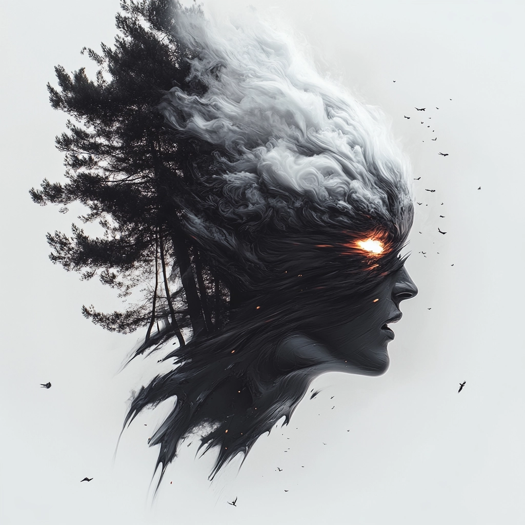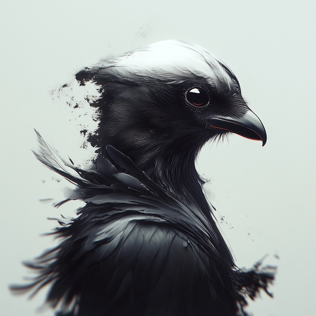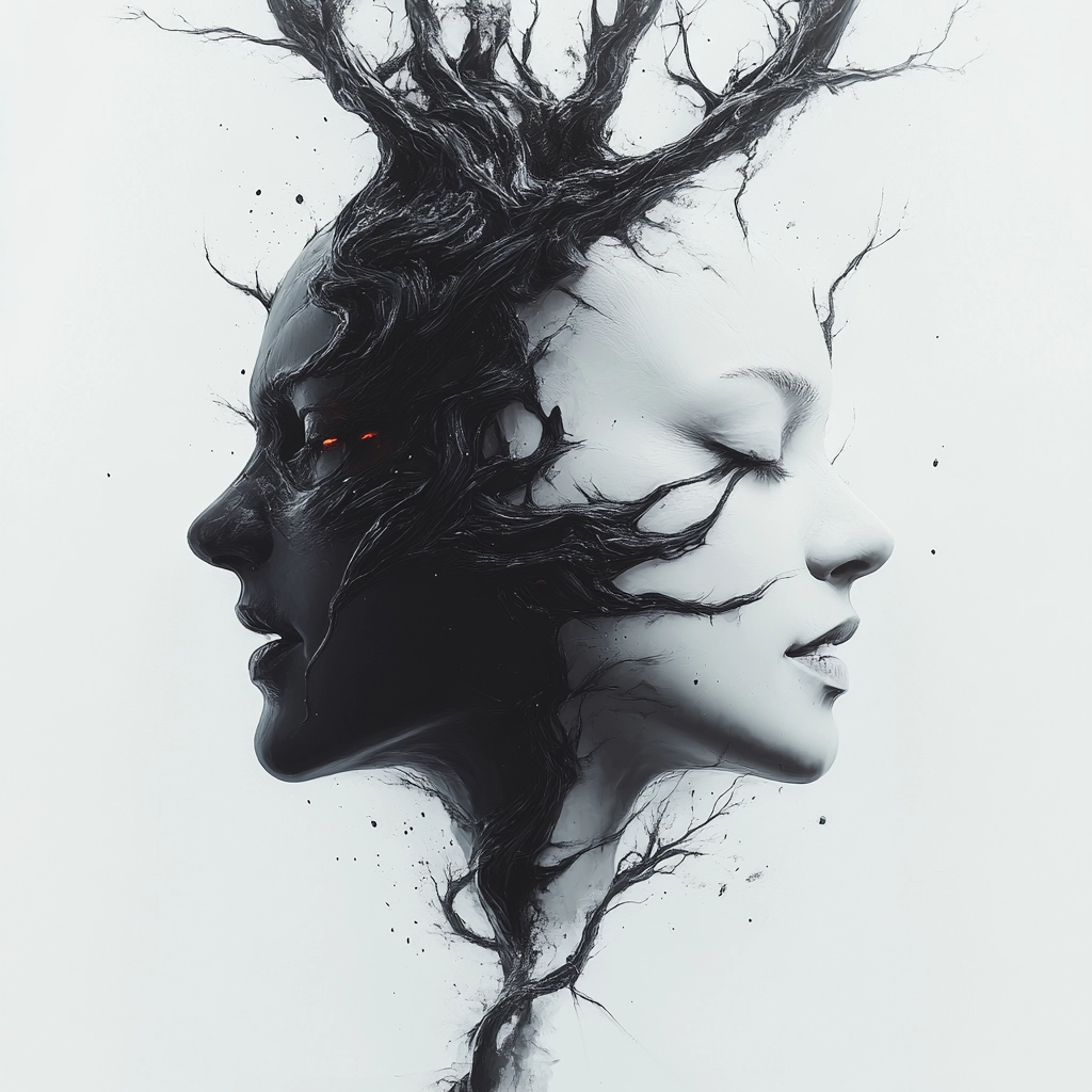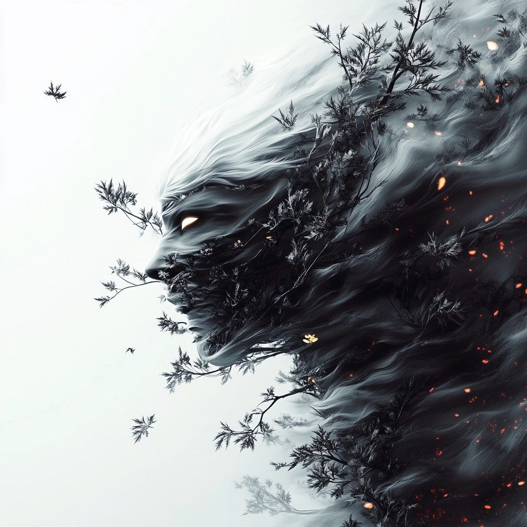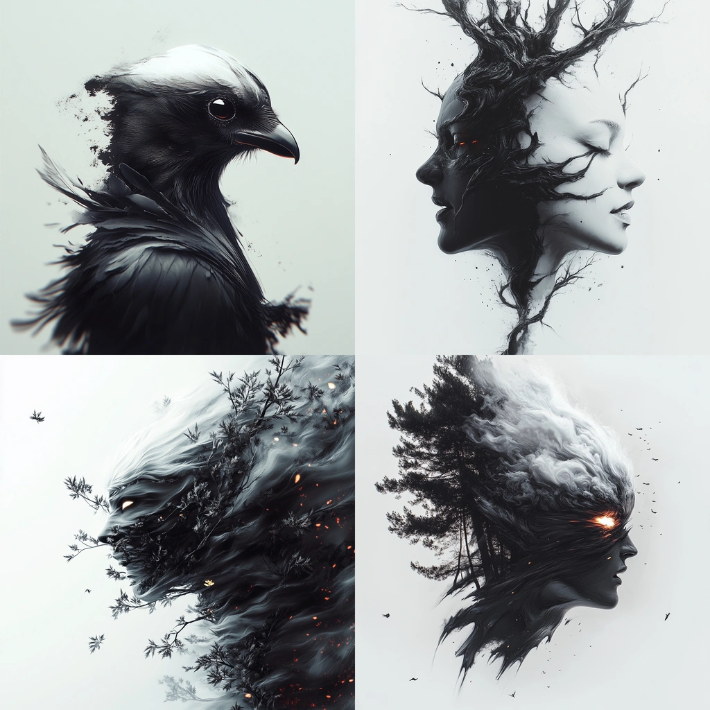 The use of black, white, and gray creates high contrast, highlighting intricate textures. The lighting emphasizes depth and motion, giving the elements a fluid, surreal quality.