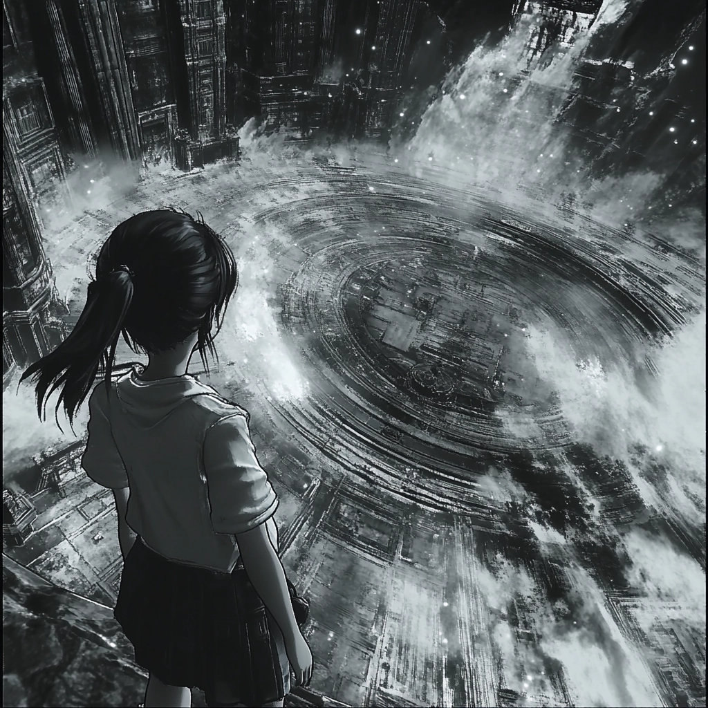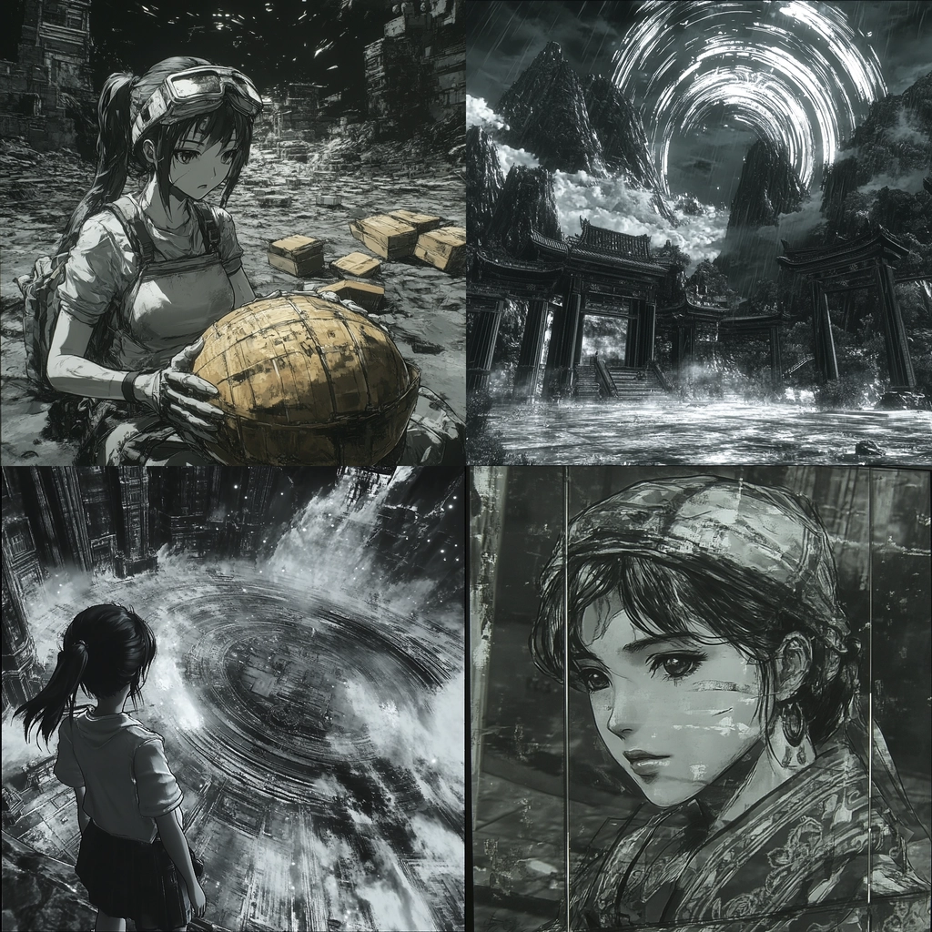 The lighting emphasizes depth and dimension through stark contrasts of black, gray, and white. Textural elements are prominent, capturing intricate details and rugged surfaces. A sense of expansive space is achieved through layered compositions, reinforcing a dynamic interplay of light and texture.