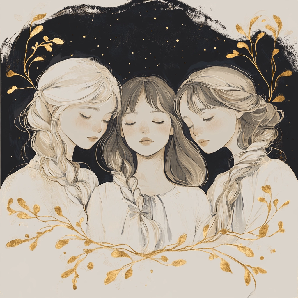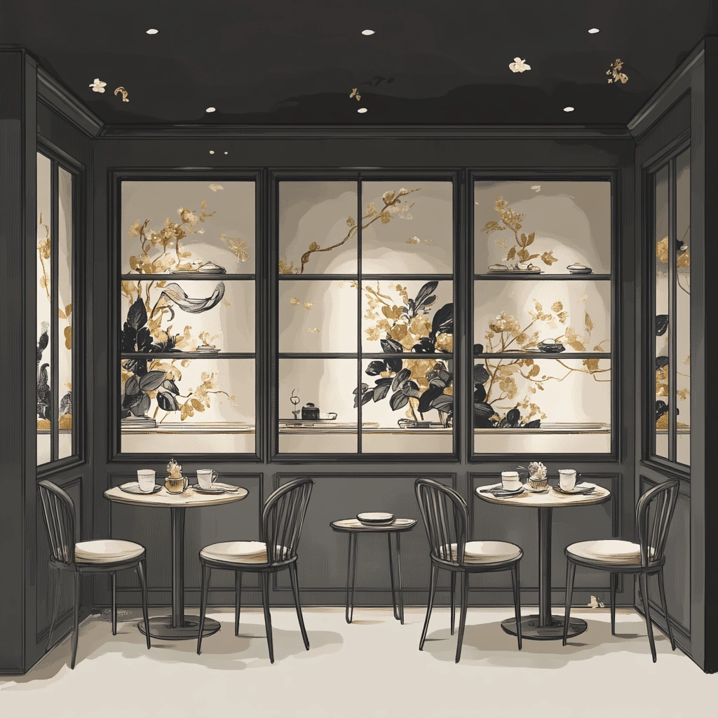Structured compositions with nuanced monochrome elements and decorative flourishes.