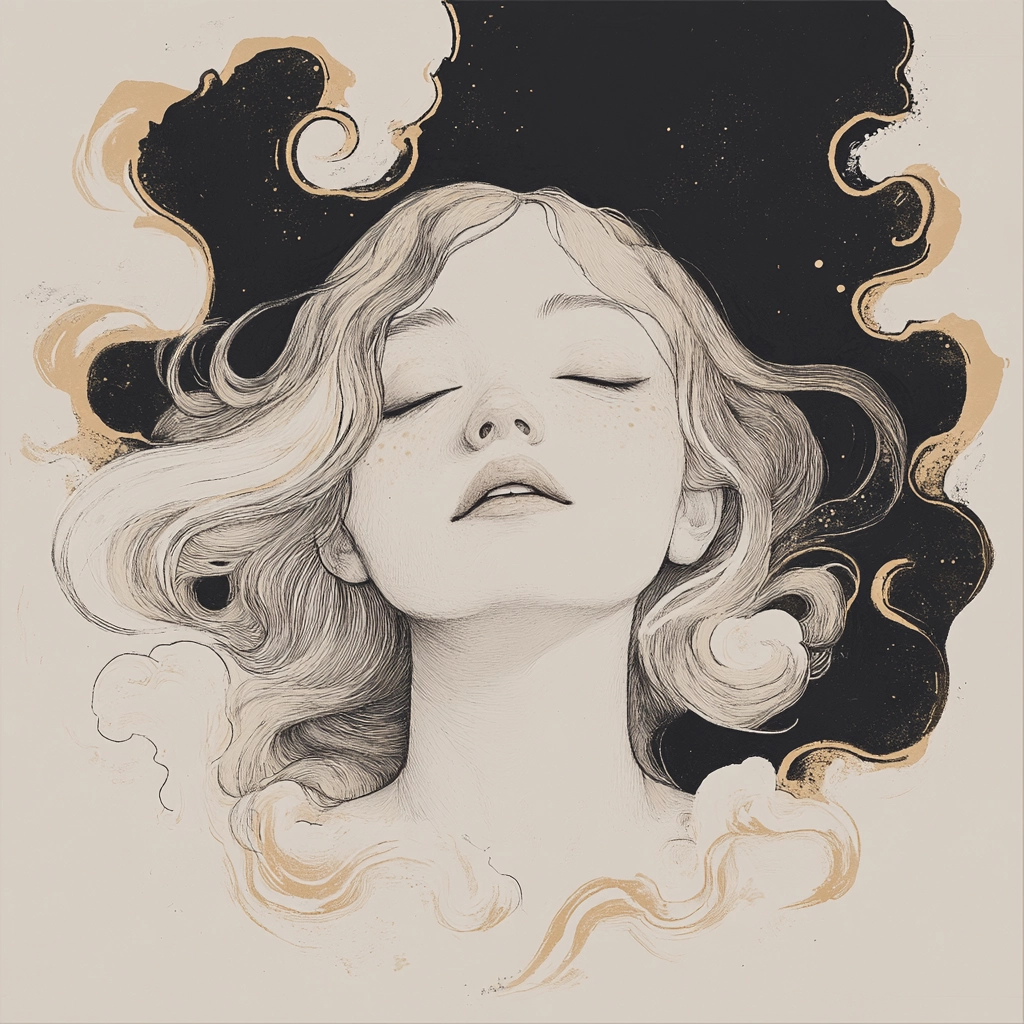 Intricate lighting highlights the subtle transitions between black and beige, creating a sophisticated spatial depth. Gold accents add luxury through delicate shading. Texture is smooth yet detailed, providing a refined visual quality.