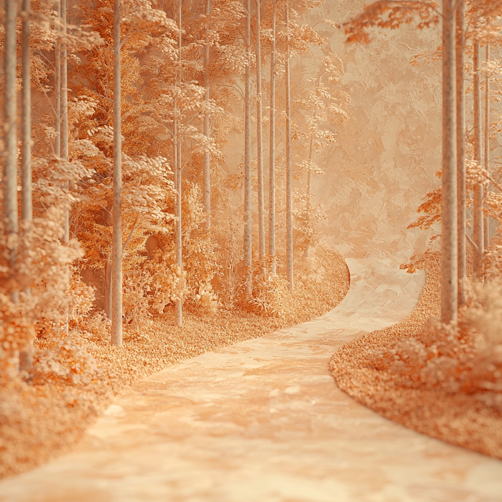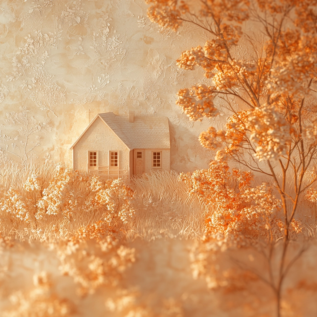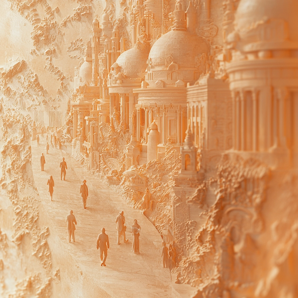 The lighting in this composition creates depth through subtle gradations, enhancing the rich texture expression and intricate detailing. A smooth spatial sense is achieved by the use of warm orange and beige hues, providing a uniform color characteristic that ties the visual elements together.