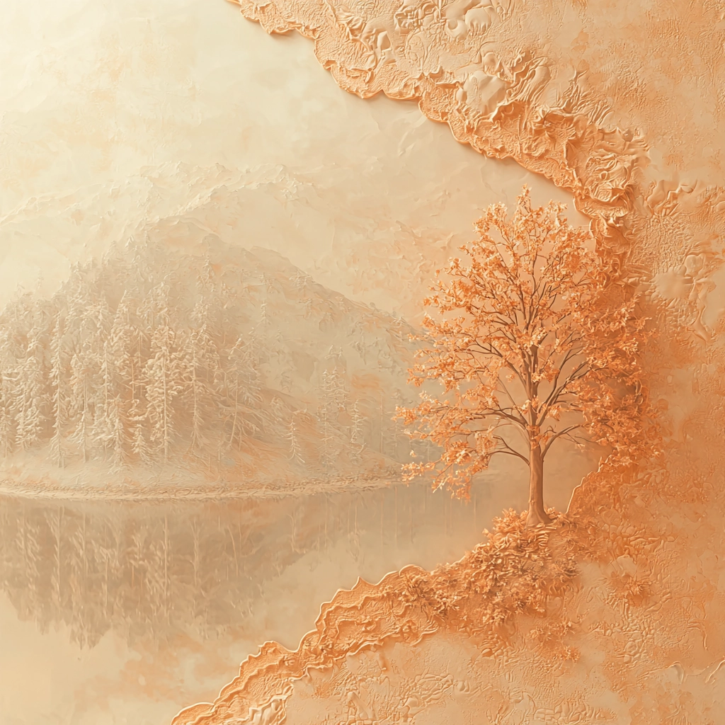 The composition utilizes warm tones and detailed textures throughout, focusing on intricate layering and a soft color palette.