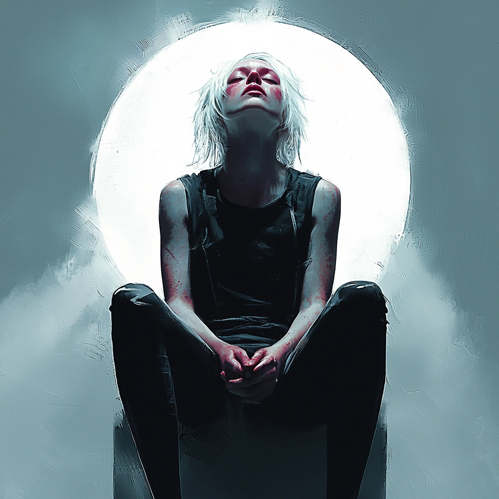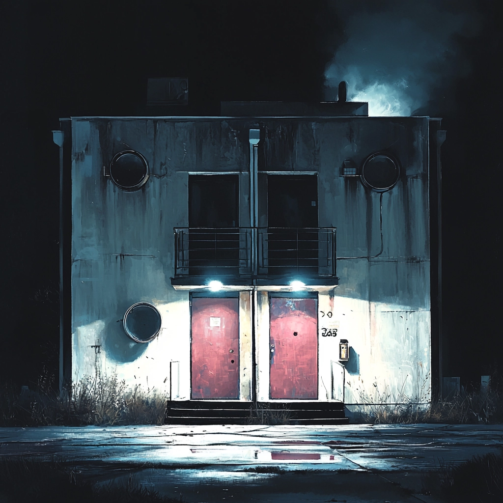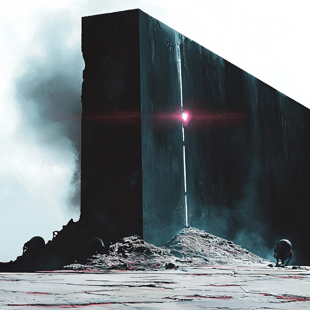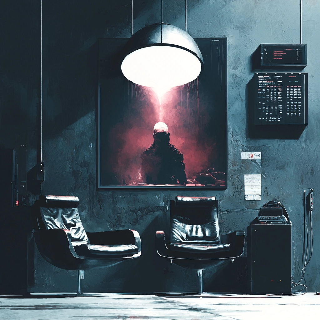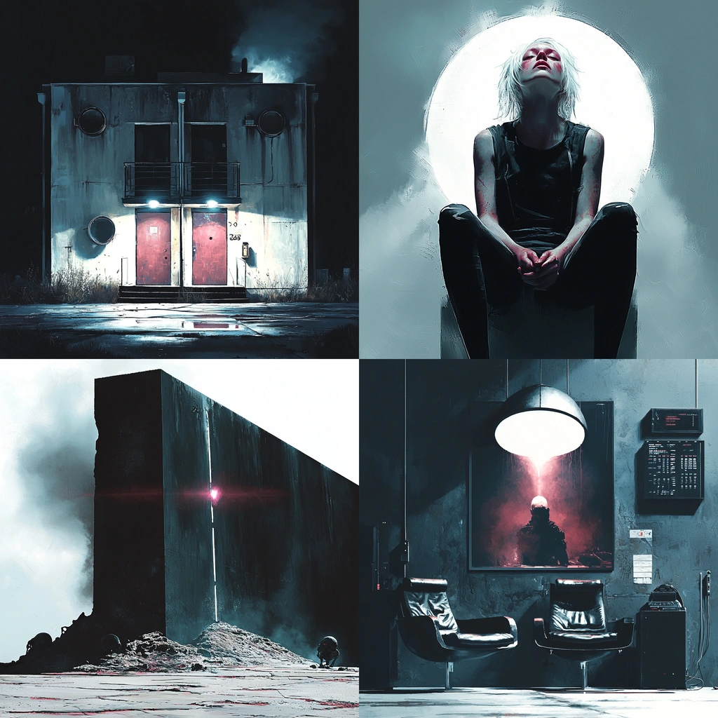 Dark, moody lighting creates strong contrasts between light and shadow, enhancing the sense of depth. The use of black and white is punctuated by strategic flashes of red, creating an intense focal point within an otherwise subdued palette.