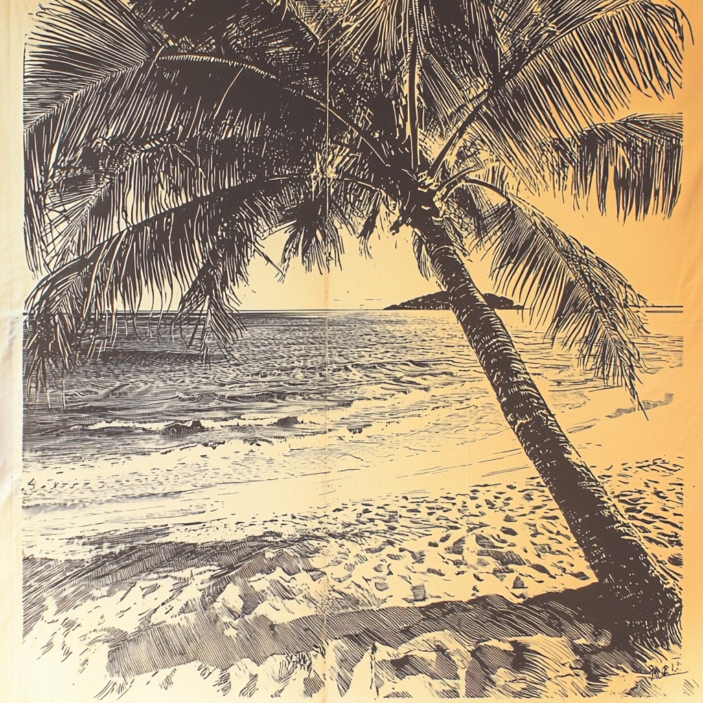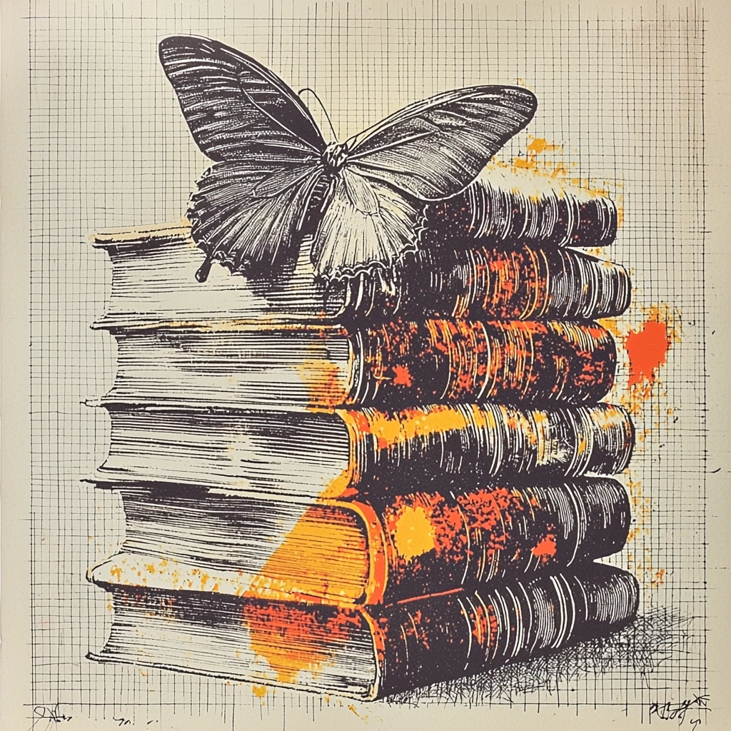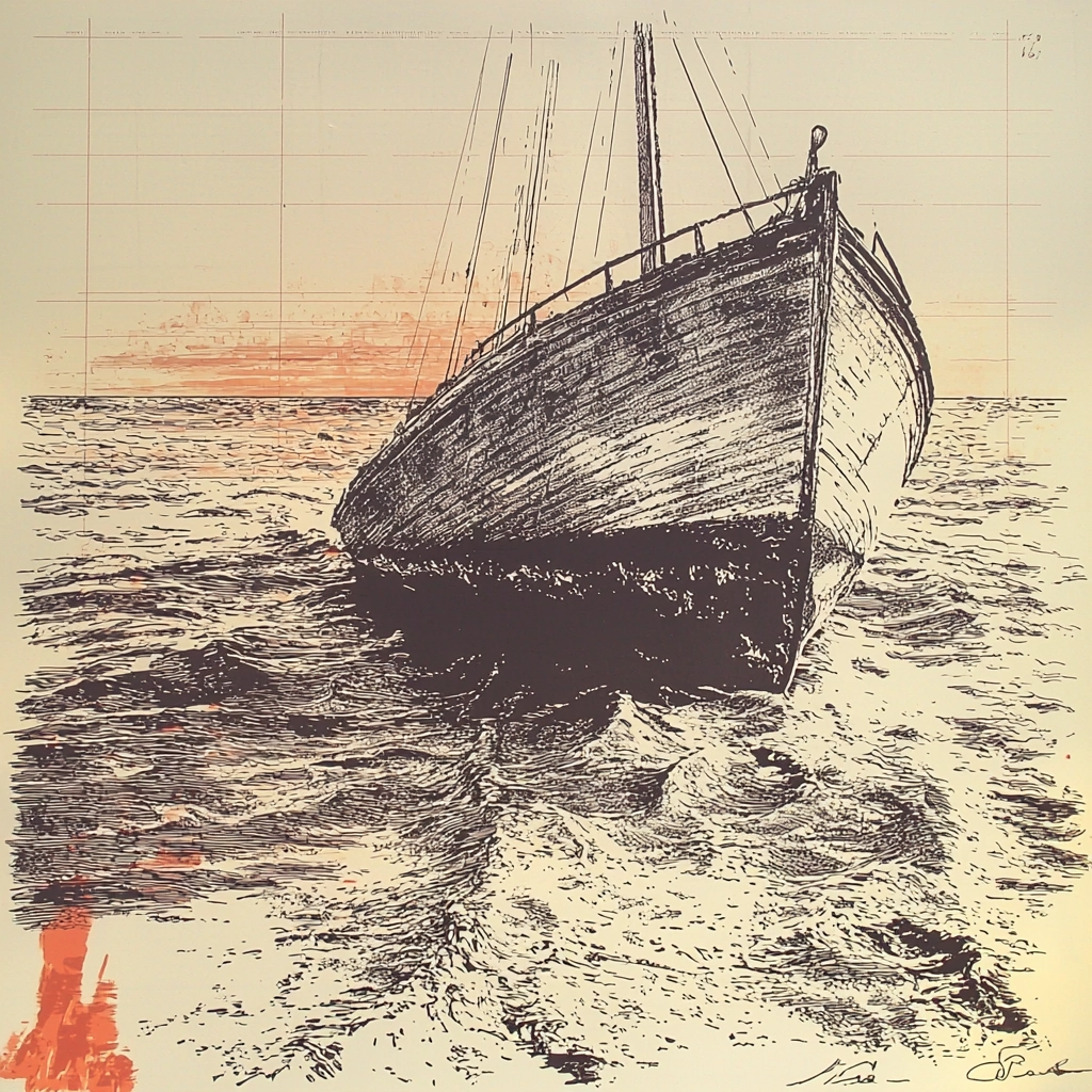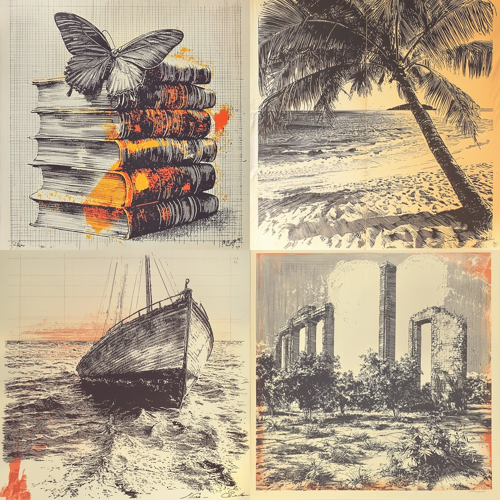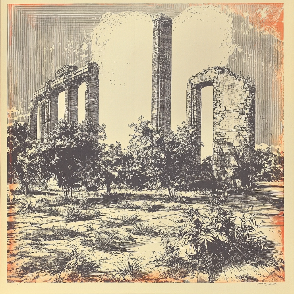 Strong contrast through precise, intricate linework combined with selectively applied vibrant orange highlights to focus attention. Spaces rendered with linear detail create depth and texture, merging natural elements seamlessly with man-made structures.