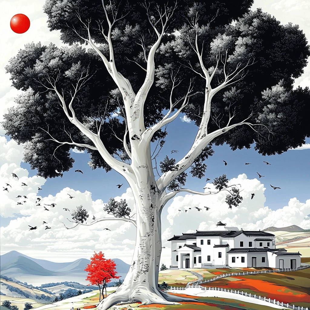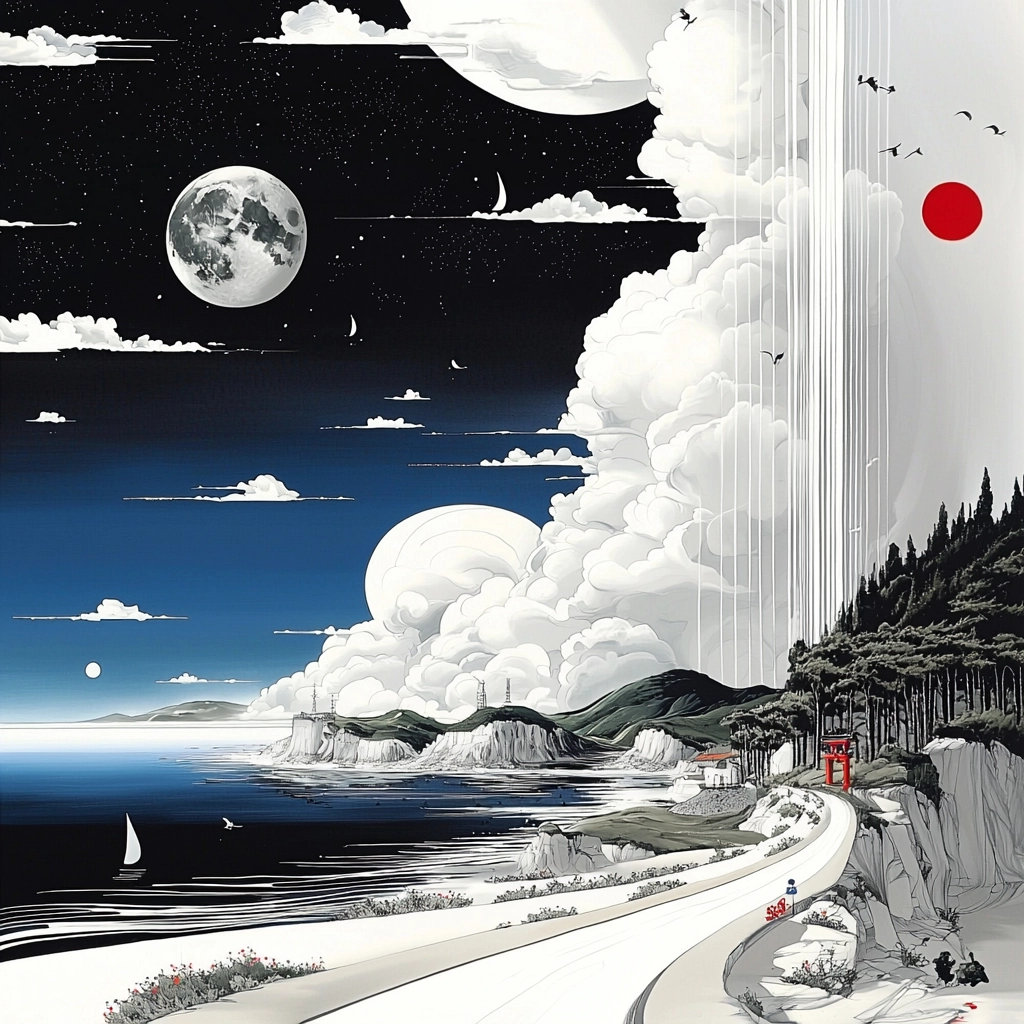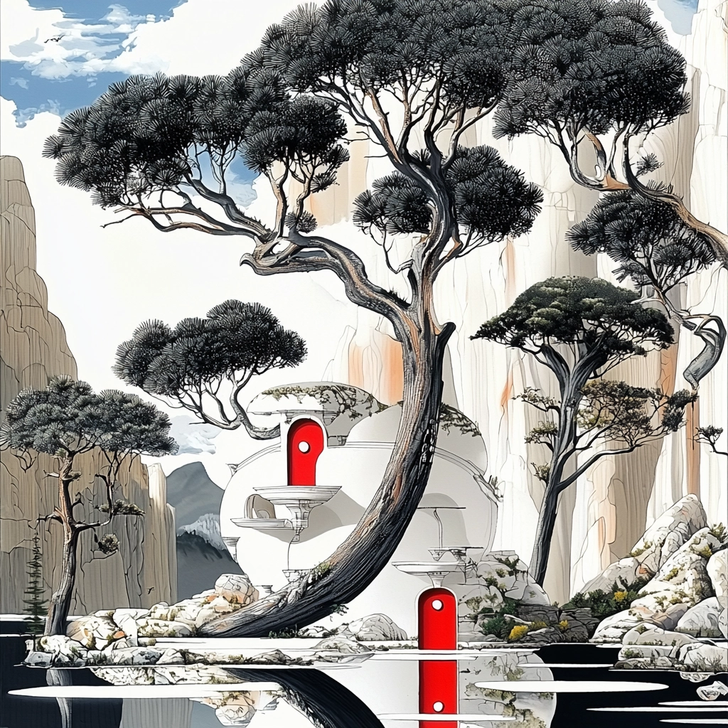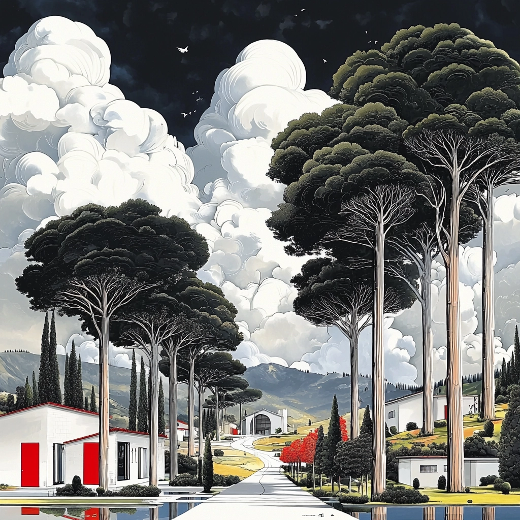 The lighting is dynamic, creating distinct contrasts between dark and light areas. The use of white and black defines spatial depth, while red elements catch the eye, adding focal points. The textures appear smooth, emphasizing the bold outlines.