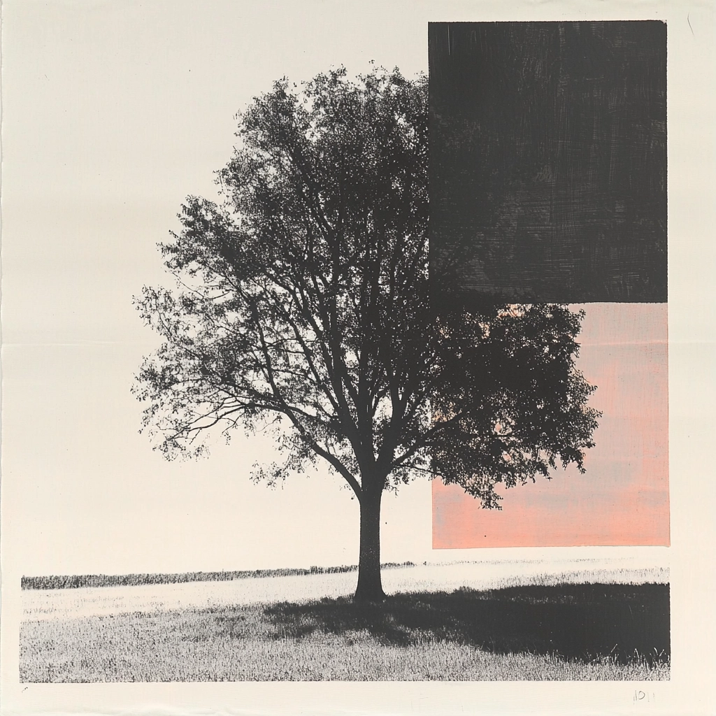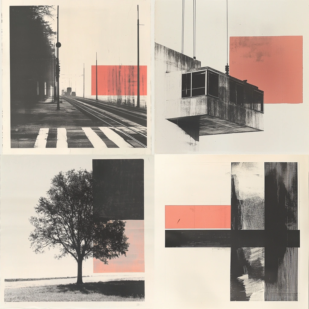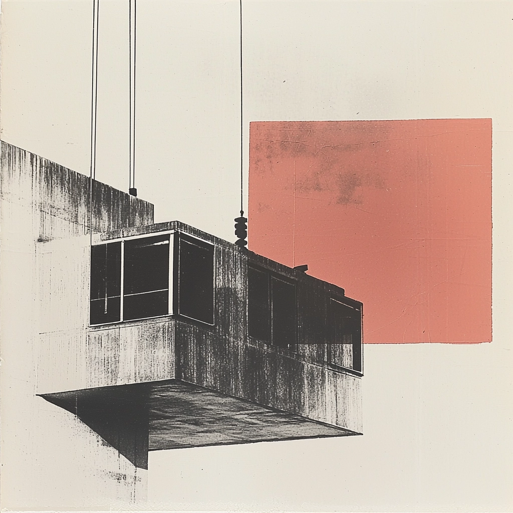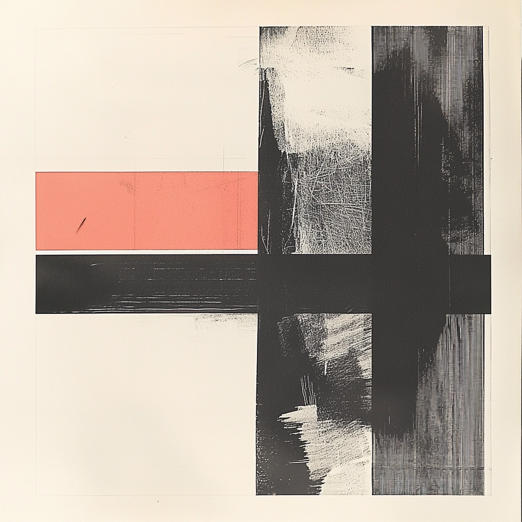 The lighting is soft, enhancing the contrast between crisp edges and smooth gradients. Red is boldy applied, creating impactful focal points, while a sense of depth emerges from the interplay of textures and layered space.