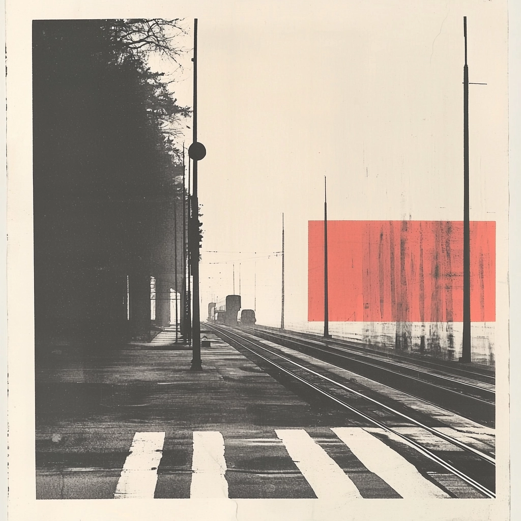 This composition utilizes stark black and white contrasts with bold red geometric accents.