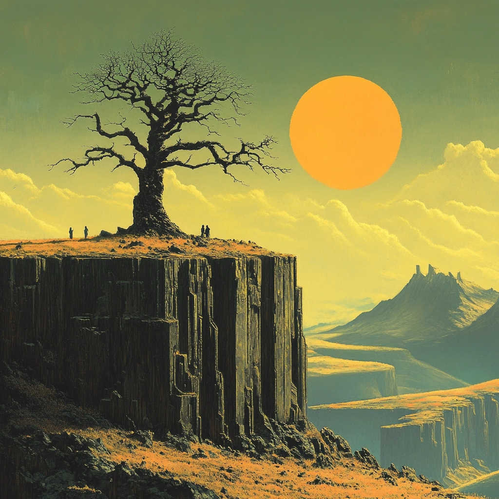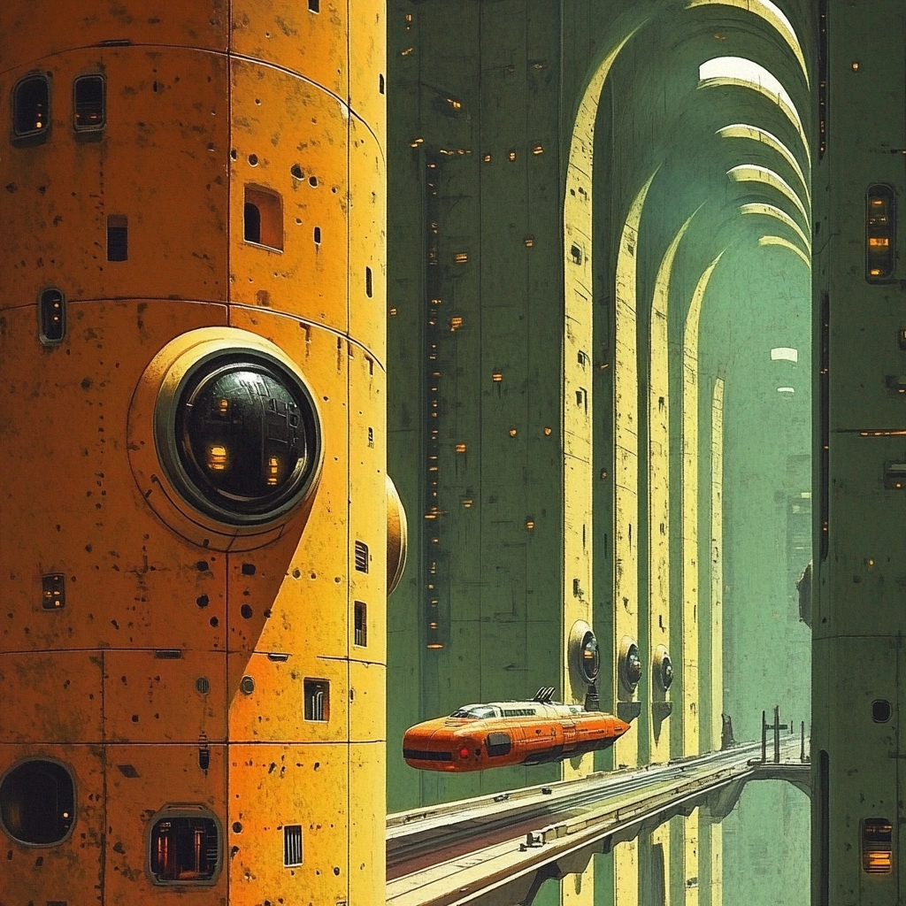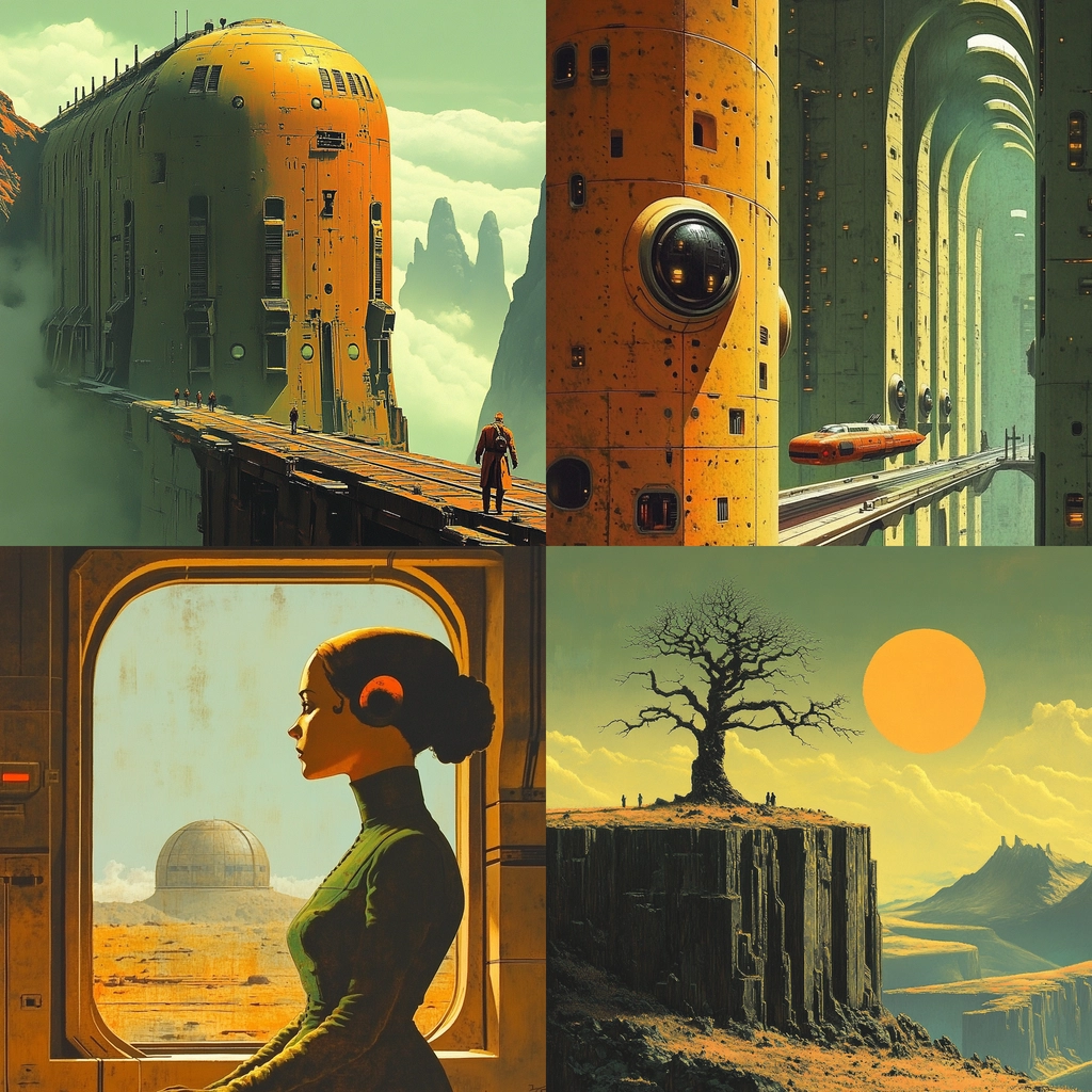 The illustrations utilize diffused lighting highlighting large architectural elements, with each scene composed to enhance depth through softly blended hues. Textural details are subtly executed, allowing the solidity of structures to manifest clearly against open, expansive spaces.