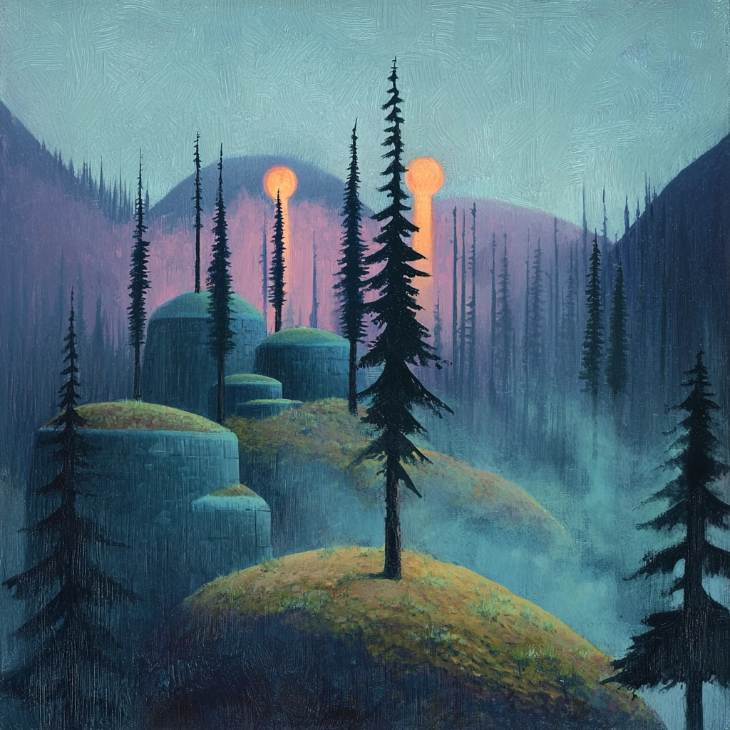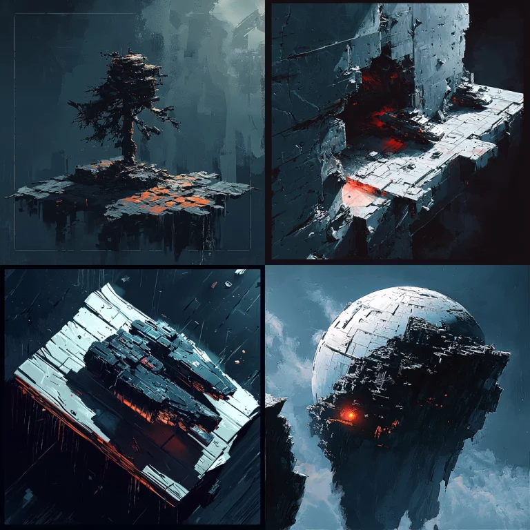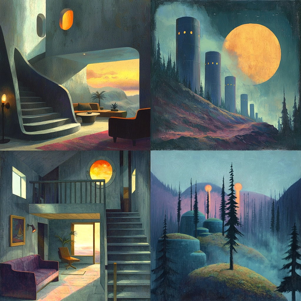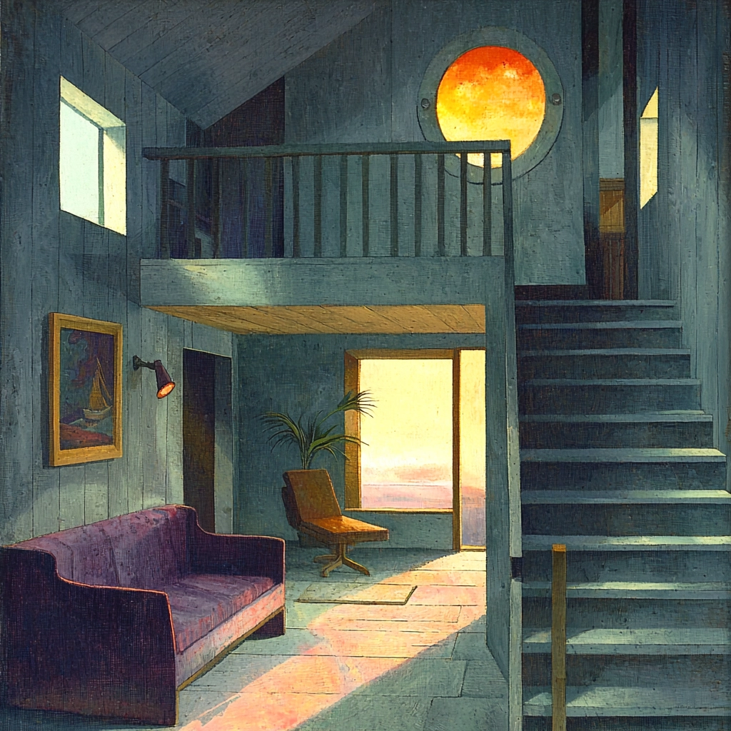 The play between shadow and light highlights a moody atmosphere, where muted blue shades are contrasted by vibrant orange elements. Spatial depth is achieved through layered compositions, while textures vary from smooth surfaces to intricate foliage.