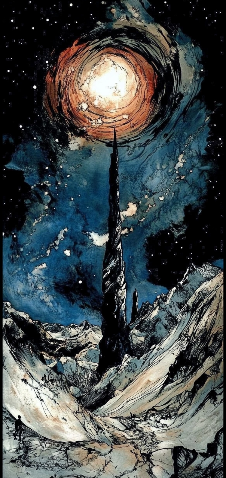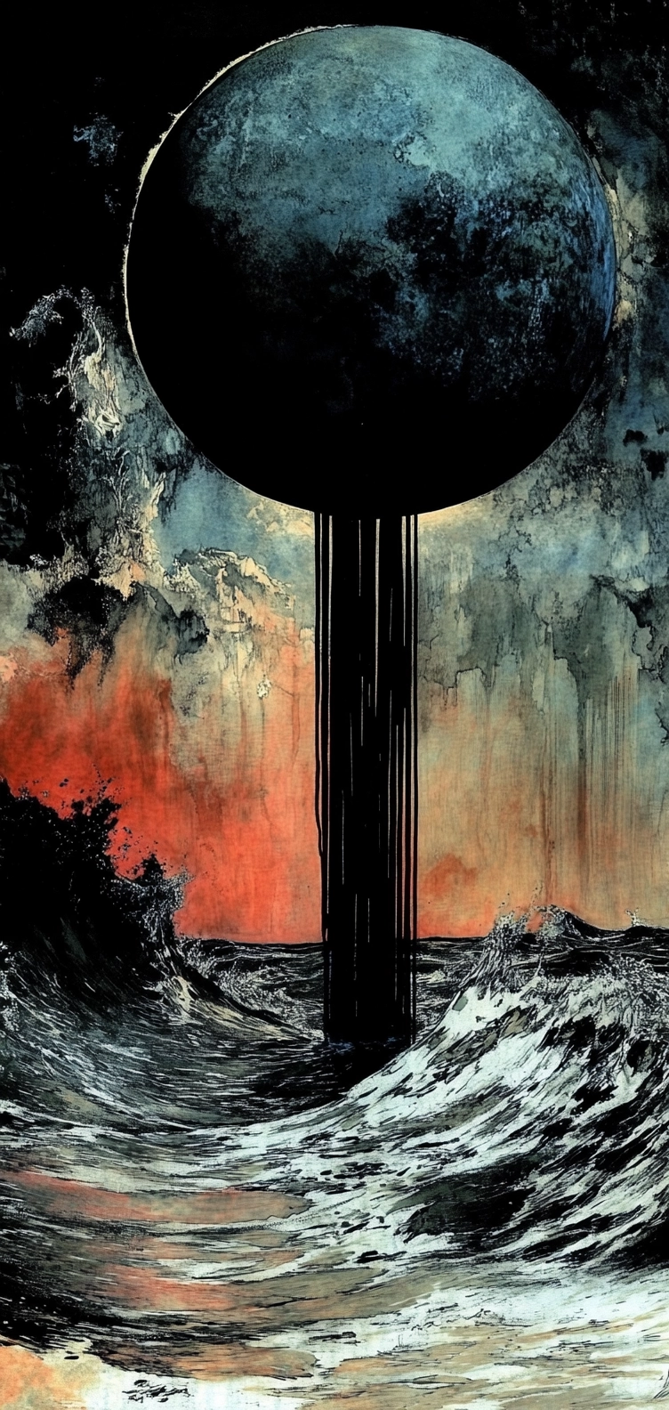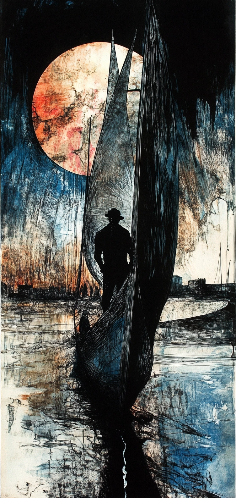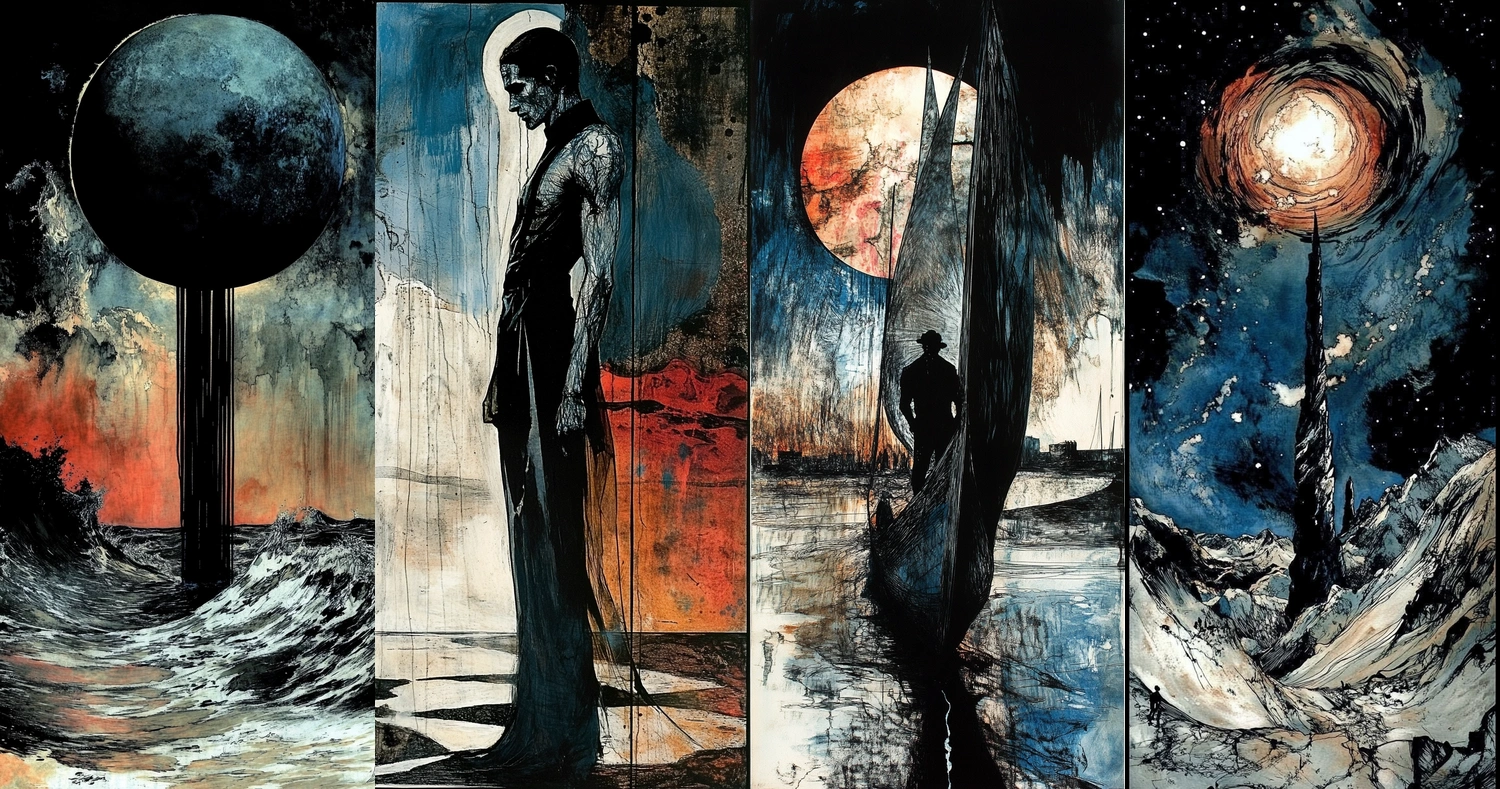 The artwork employs bold lighting effects that create a dramatic play of light and shadow. The colors are deep and intense, with strong contrasts between dark black, vivid red, and rich blue. The spatial sense is emphasized through sharp outlines and the detailed textures that bring the scenes to life.