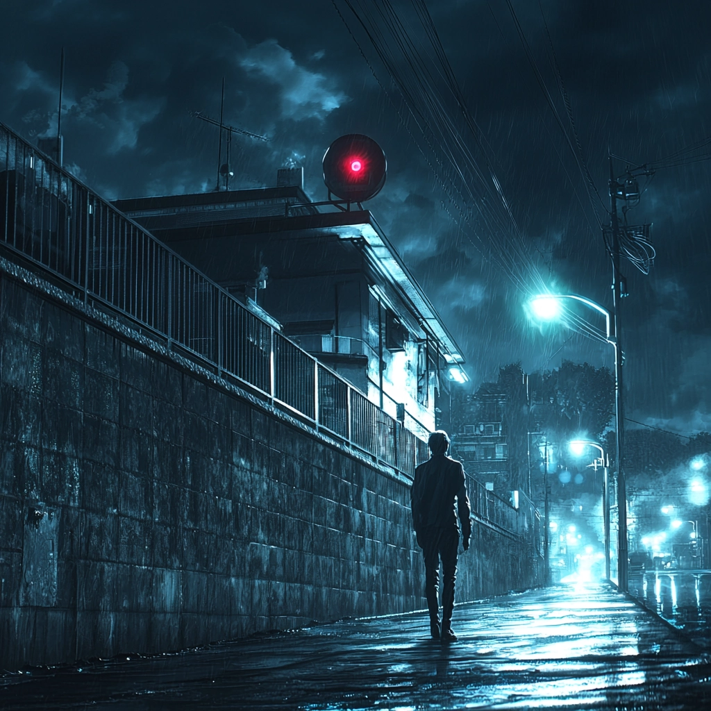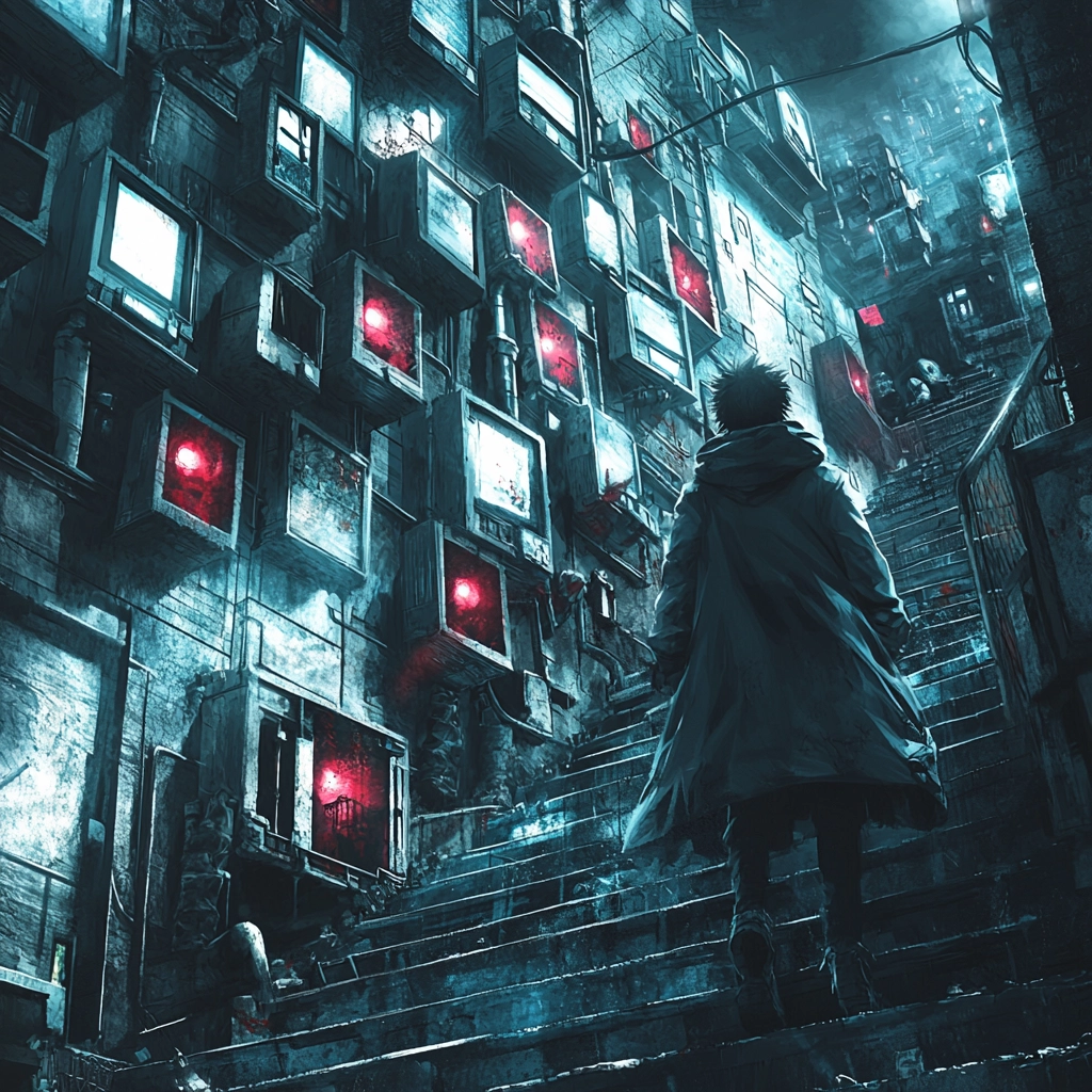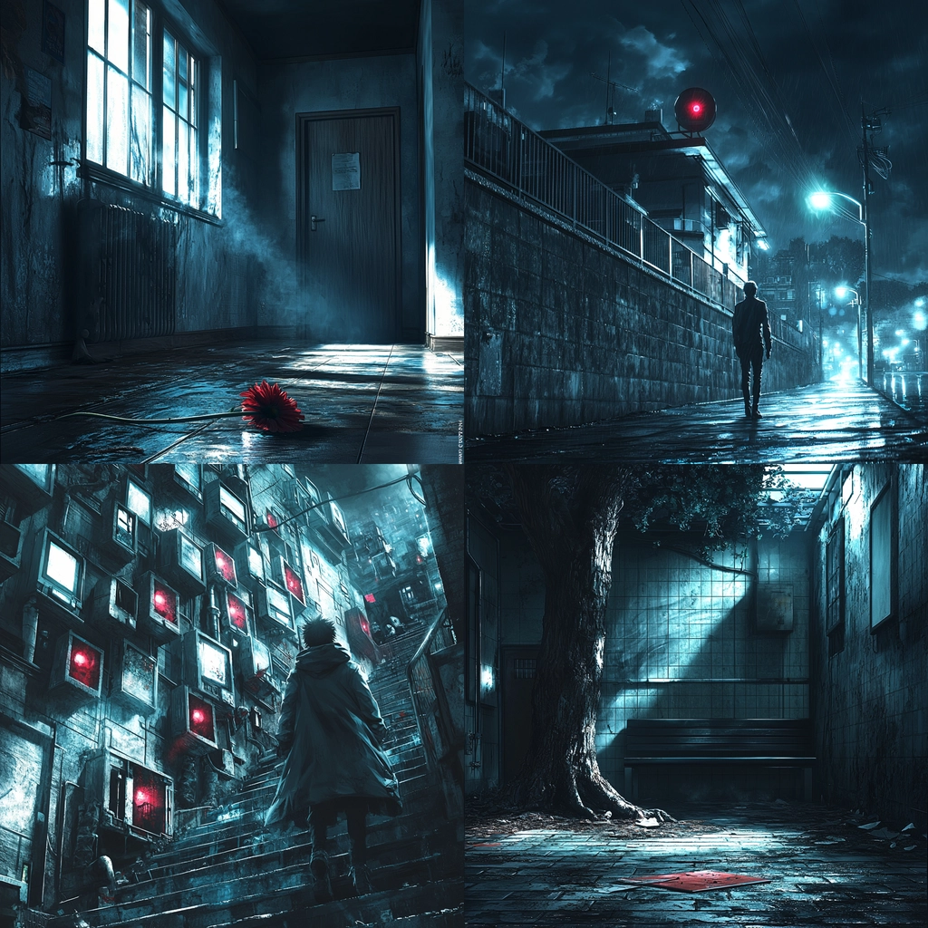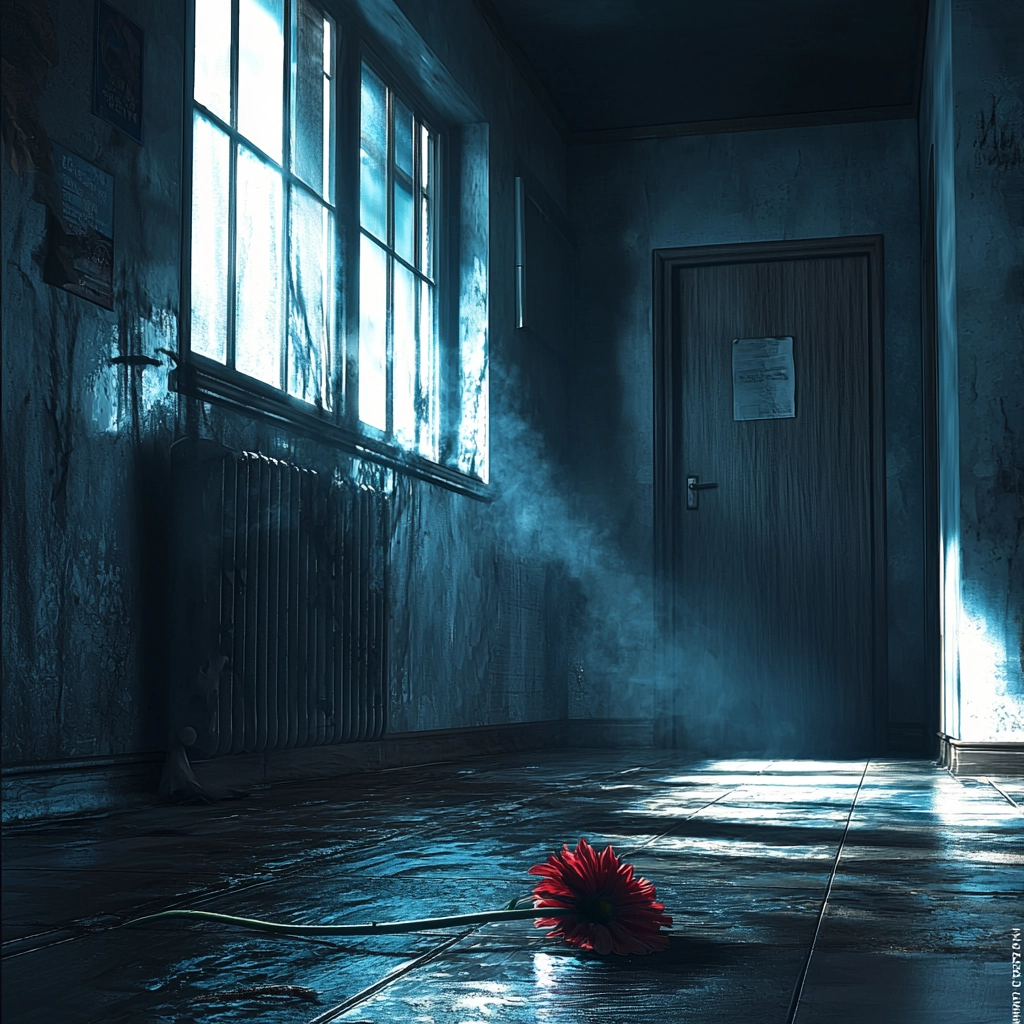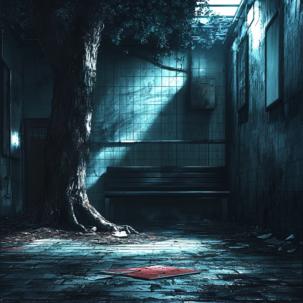 A moody scene combining dramatic lighting with stark cyan and red, emphasizing contrast and depth.