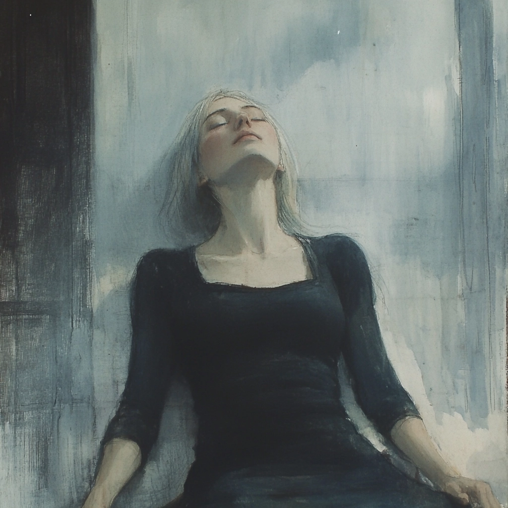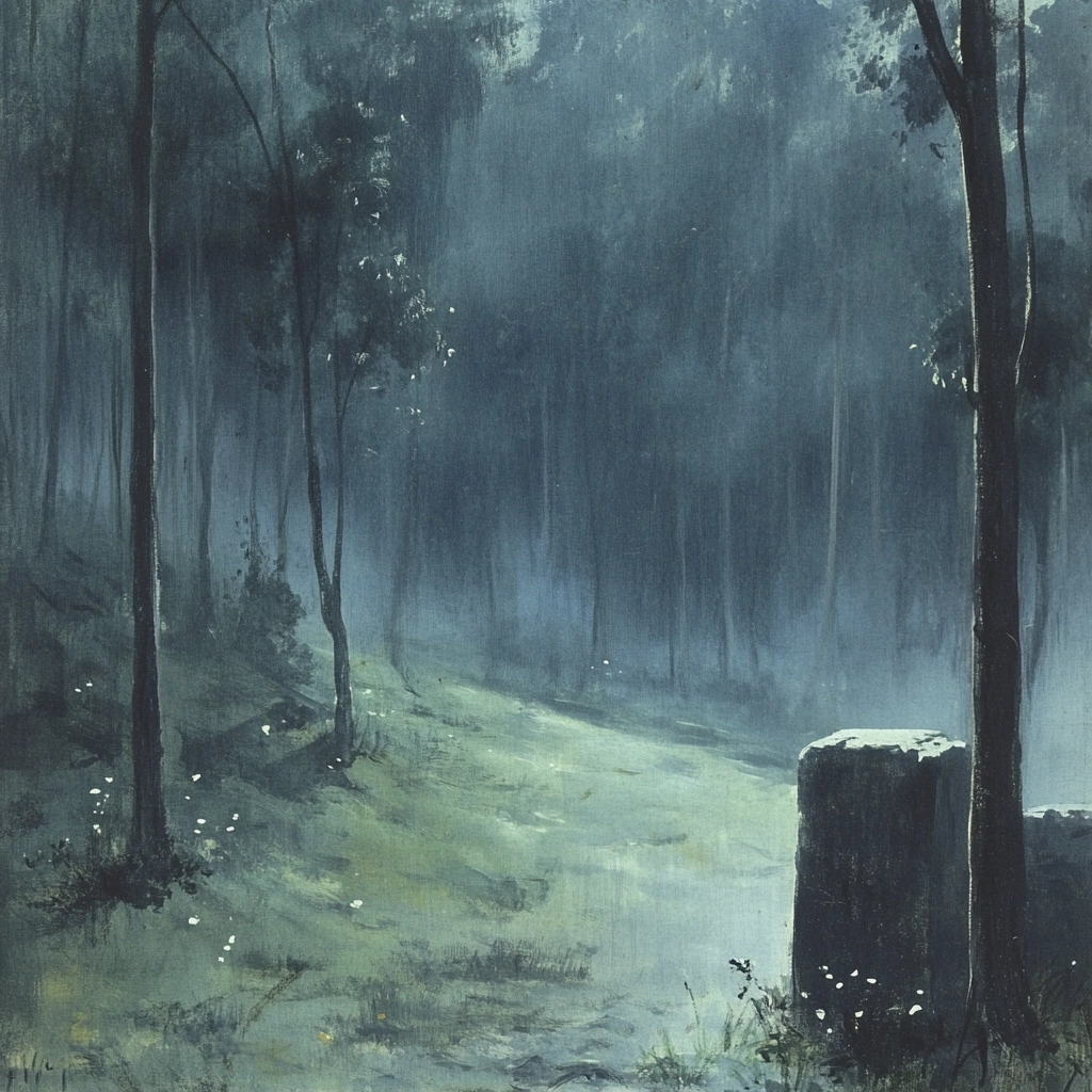 Soft lighting contrasts with deep shadows, enhancing broad brushstrokes and muted dark tones. Rich textures evoke a sense of distant space with overlapping elements creating layered perspectives.