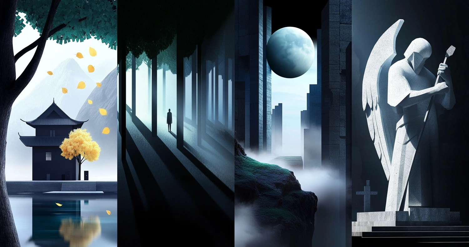 Dramatic lighting emphasizes shadowy silhouettes and high contrast. The monochromatic palette is dominated by blues and blacks, enhancing the depth and scale within a confined spatial perspective with crisp physical textures.