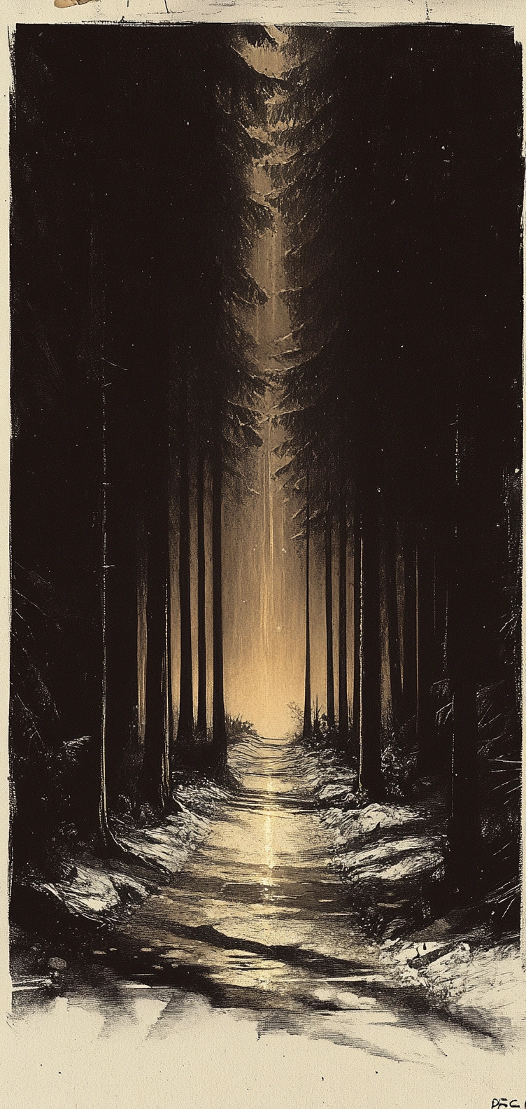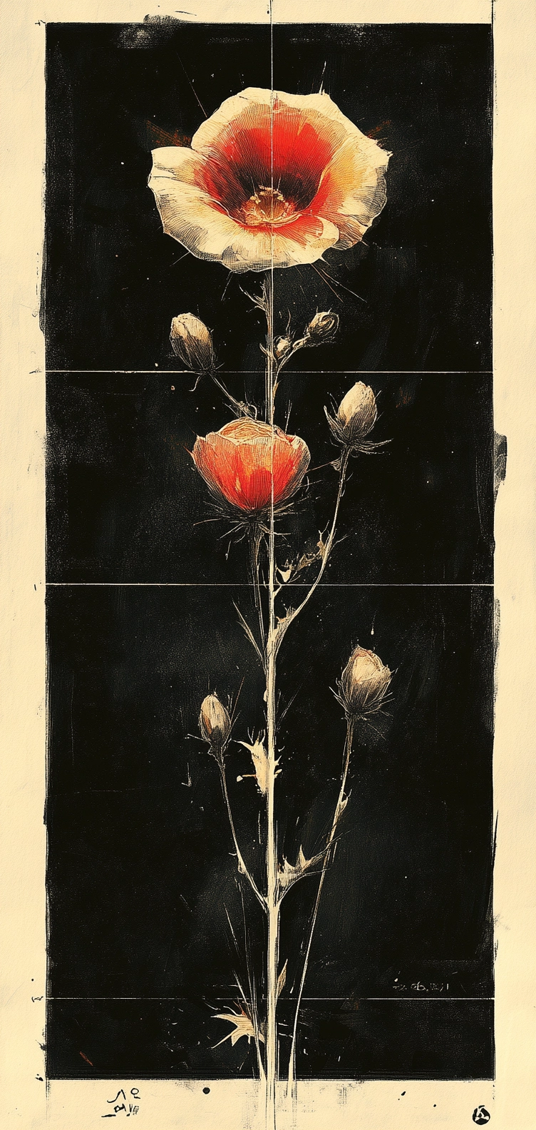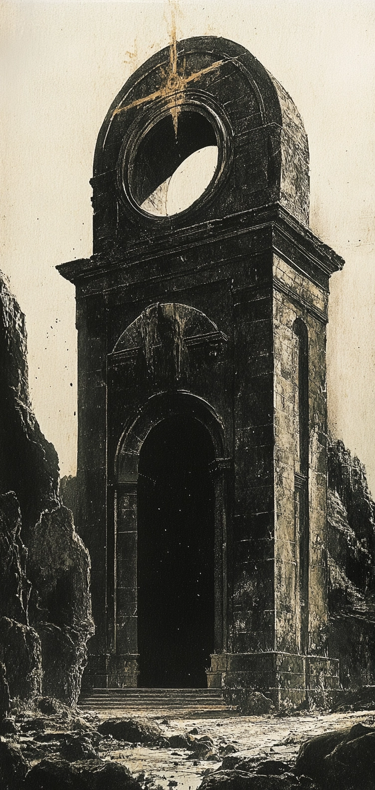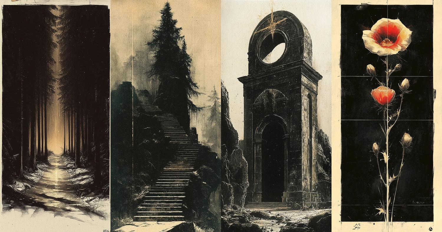 Dark, contrasting elements with a central focus and monochromatic base.