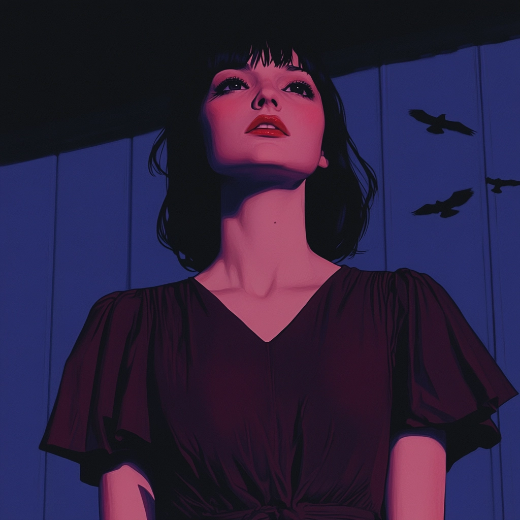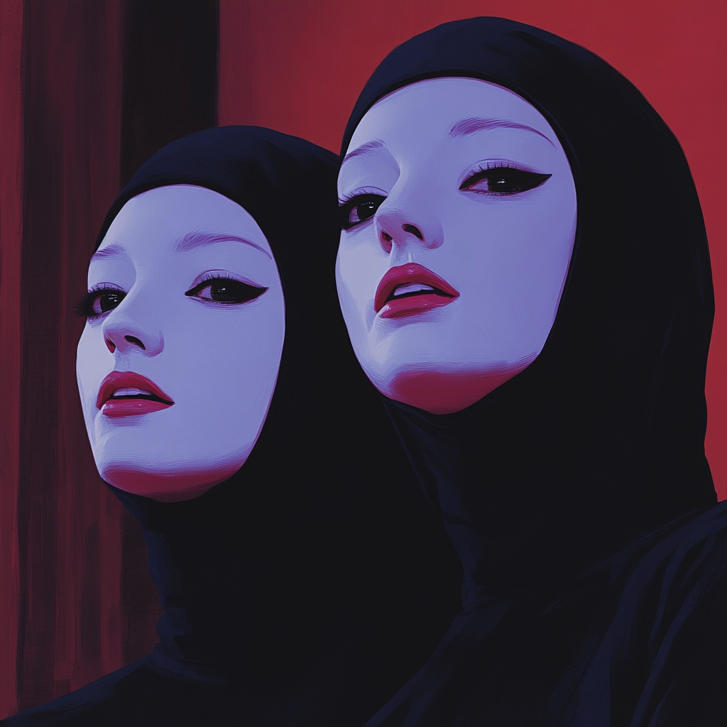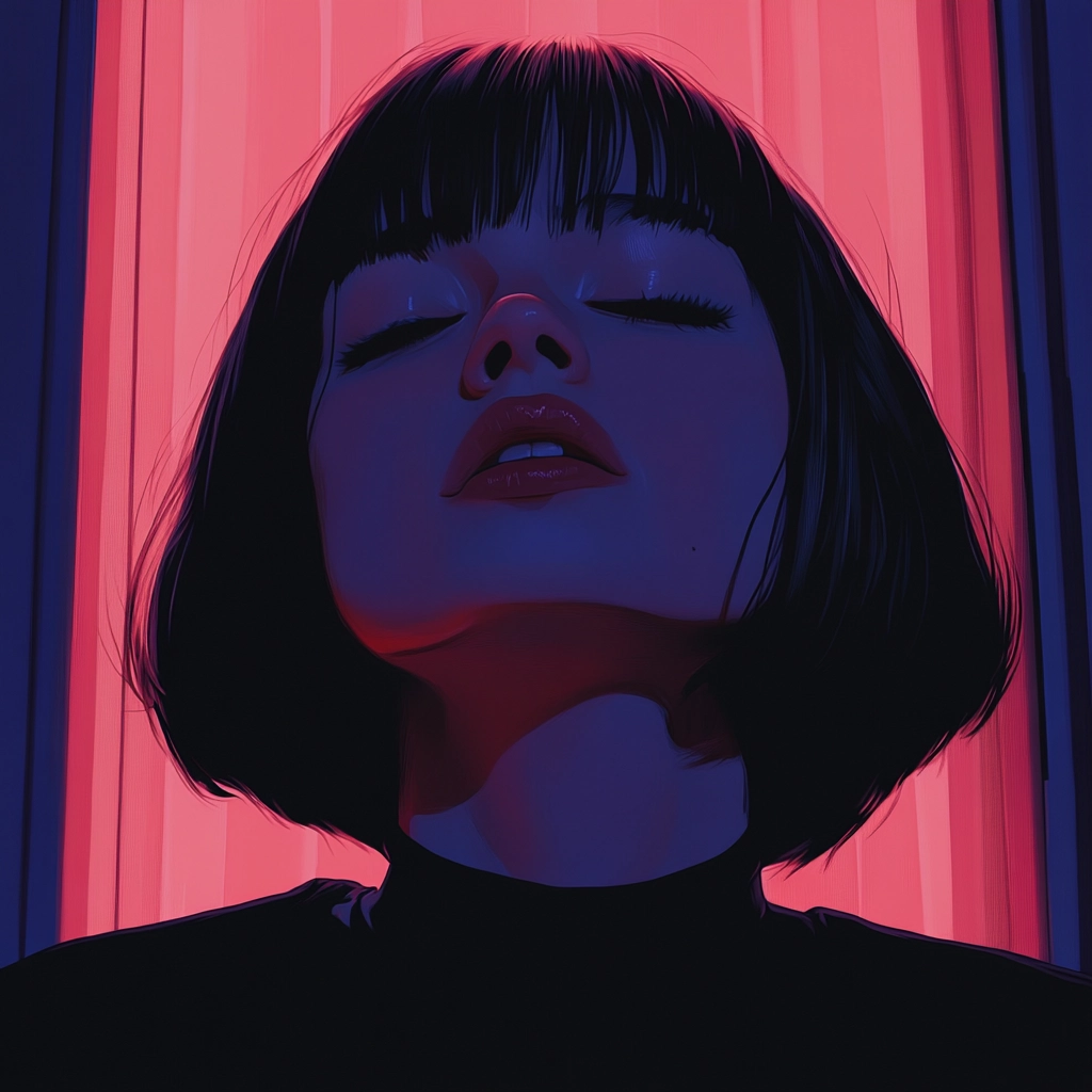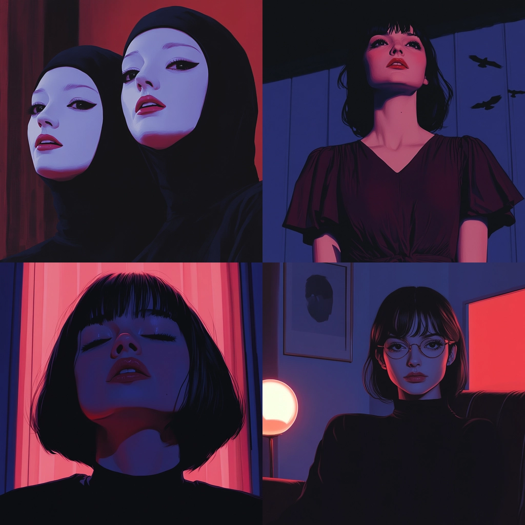 Strong red and blue lighting dominate the scenes, casting dramatic shadows. The spatial arrangement is intimate with close-up perspectives enhancing the mood. Textures are smooth, with a clear focus on contrasting colors and lighting dynamics to define forms.