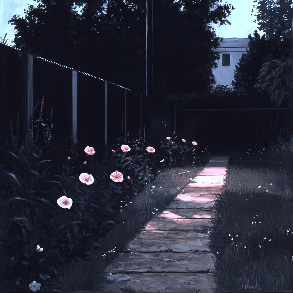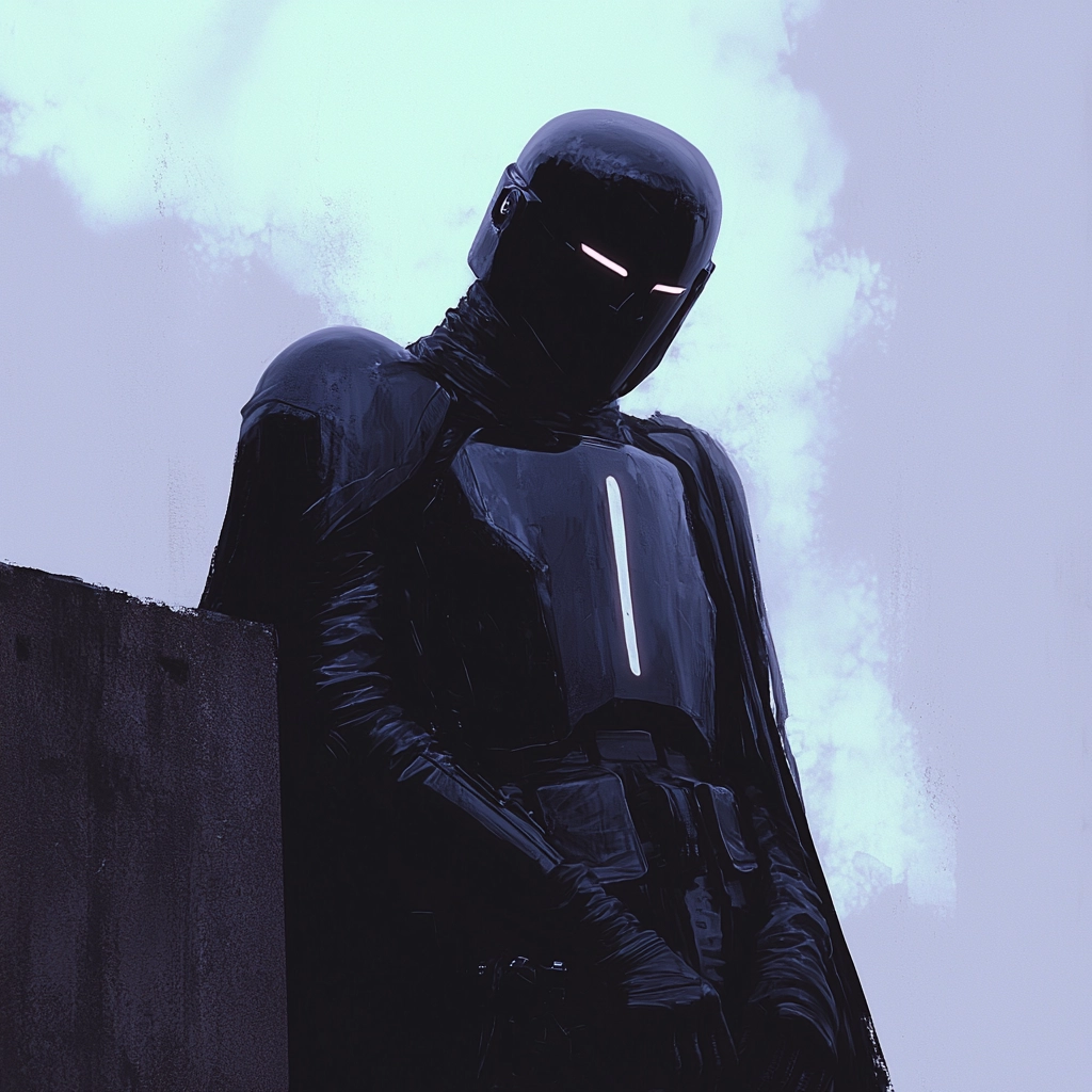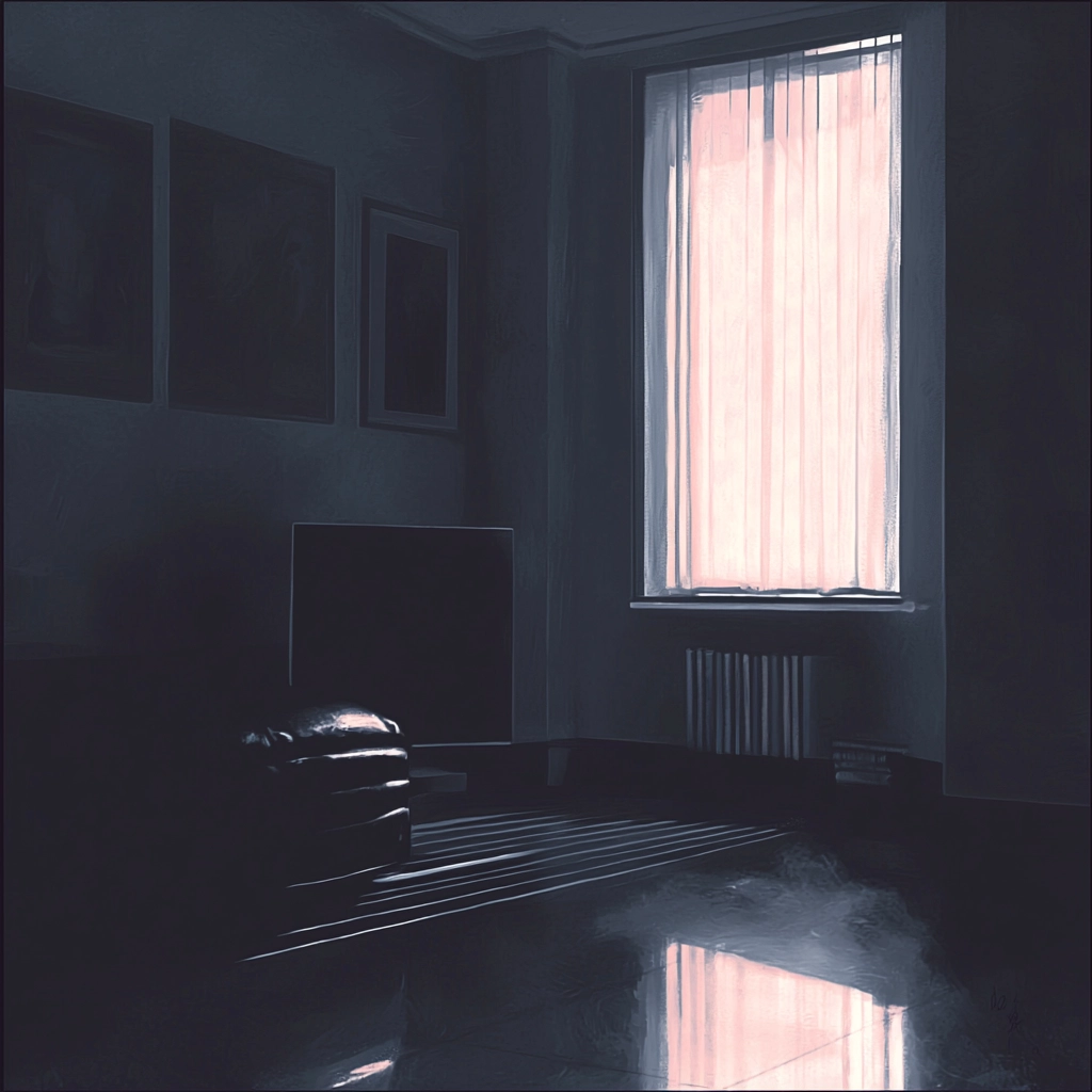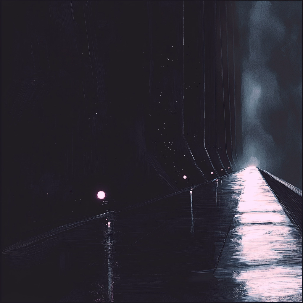The art utilizes strong chiaroscuro lighting, creating deep shadows and dramatic contrasts. Dark blue and black dominate the color palette, evoking a sense of depth and space. Textures are highlighted with subtle reflections and defined edges, intensifying the overall moody atmosphere.