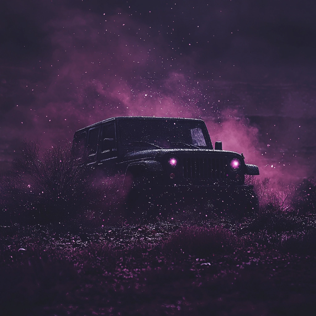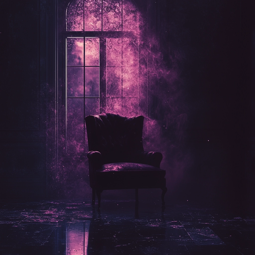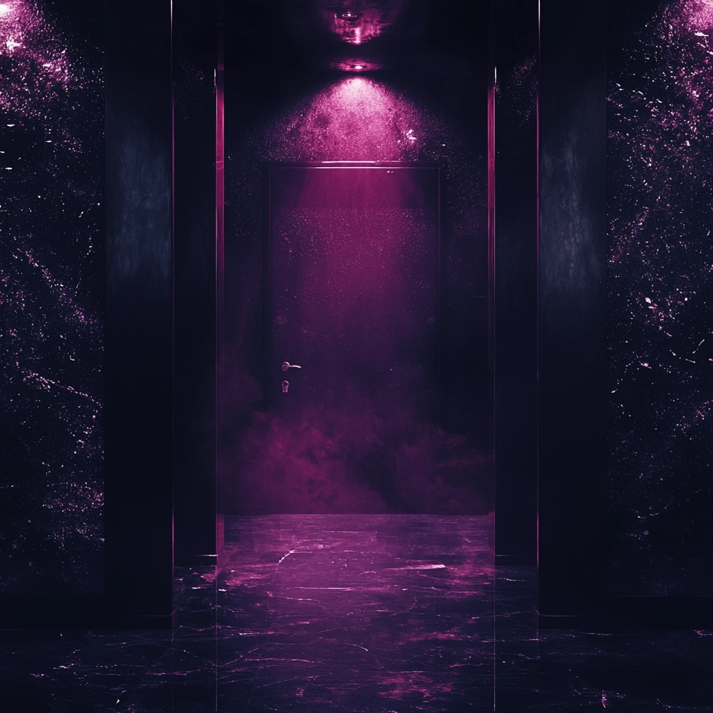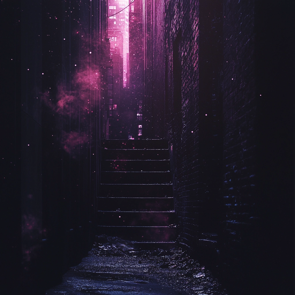 Dim, directional lighting highlights select areas, creating stark contrasts amidst shadowy spaces. Color gradients transition smoothly between purple and pink hues, while textures range from smooth reflective surfaces to gritty, uneven details.