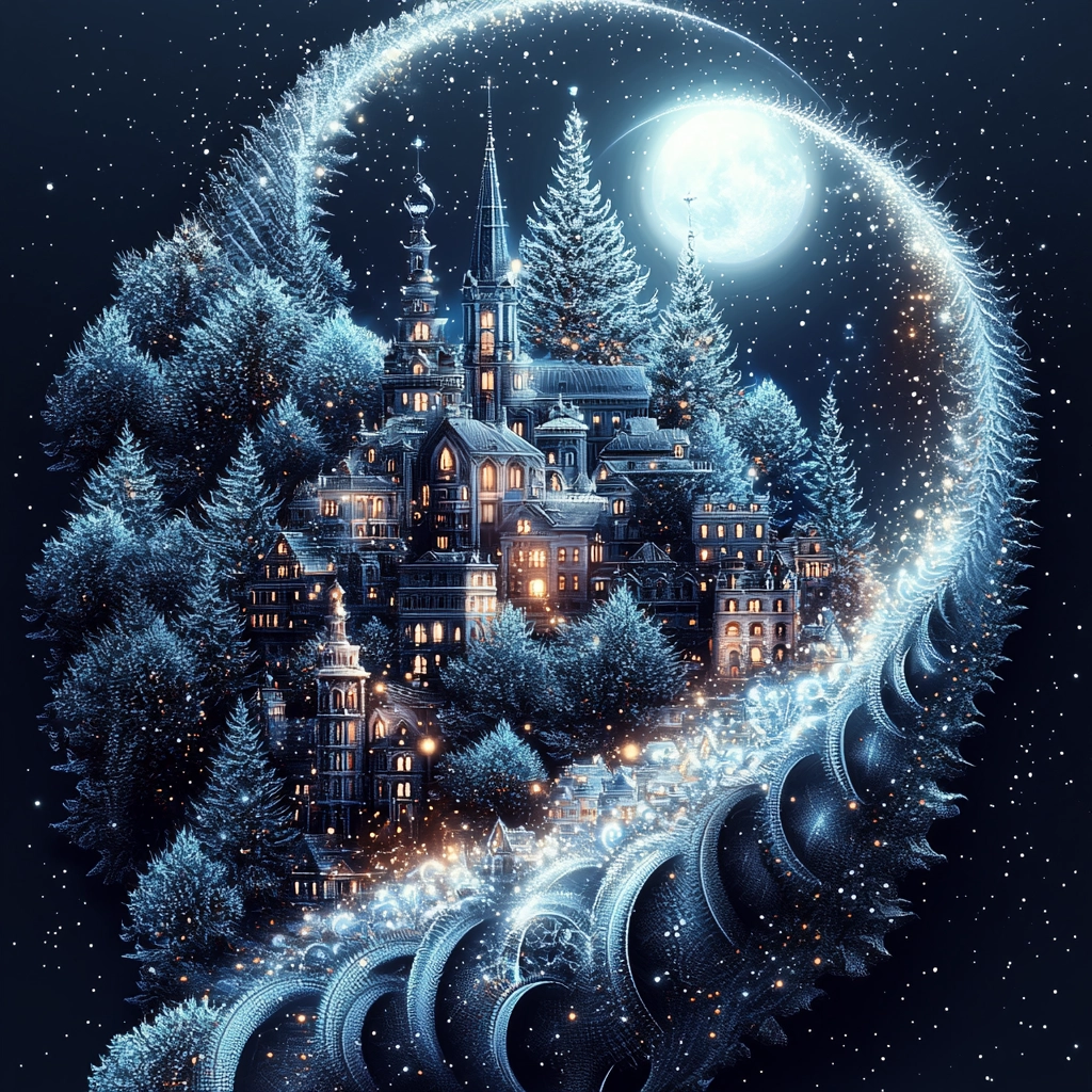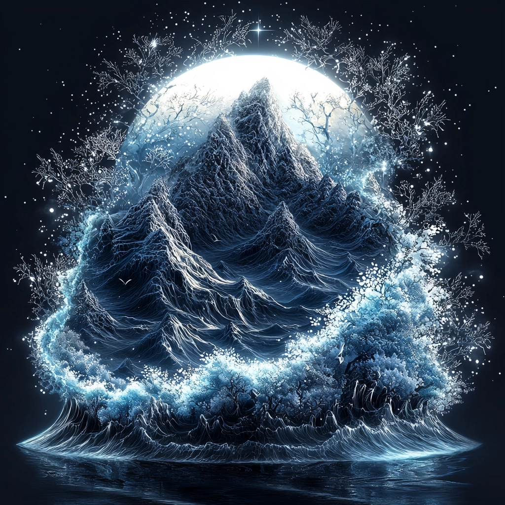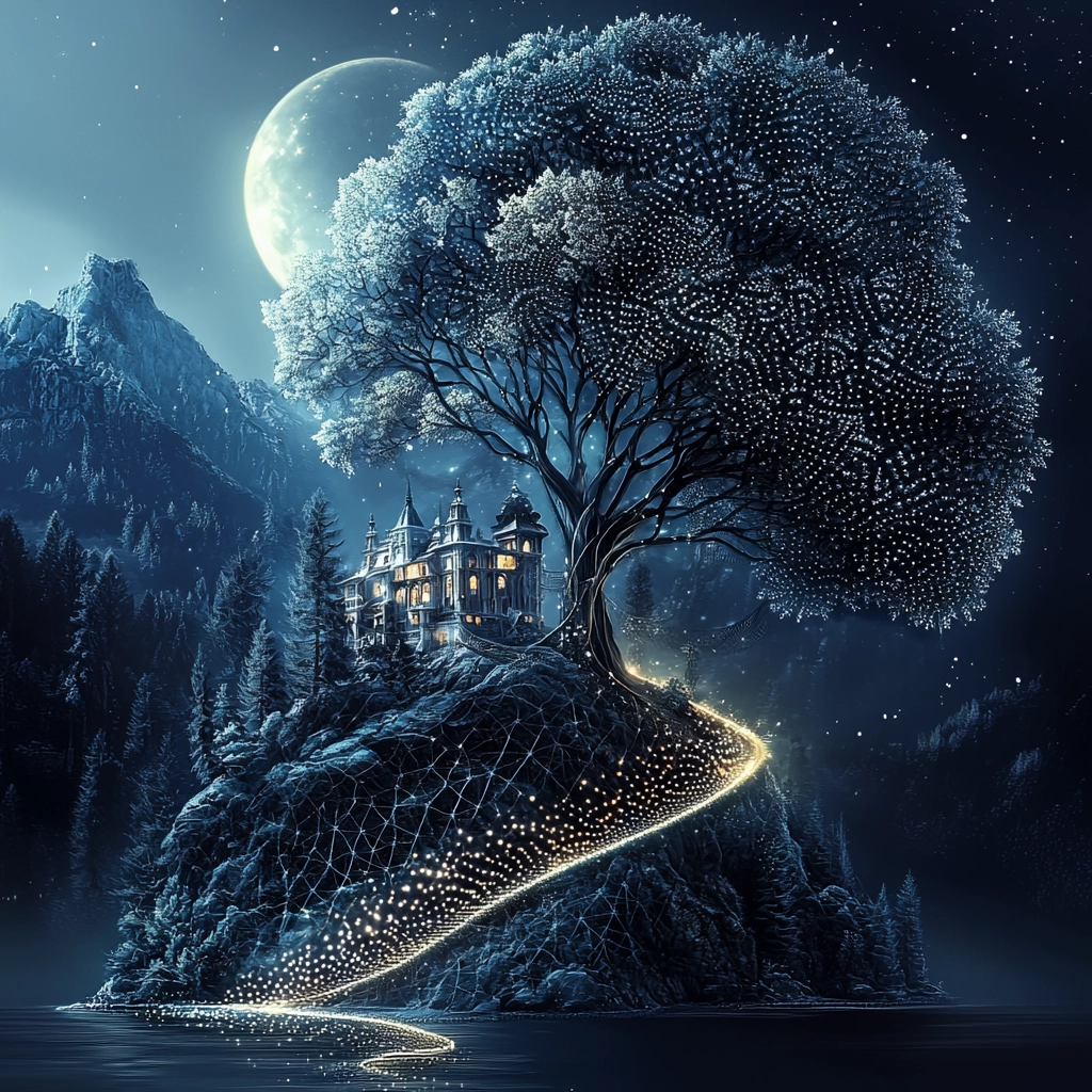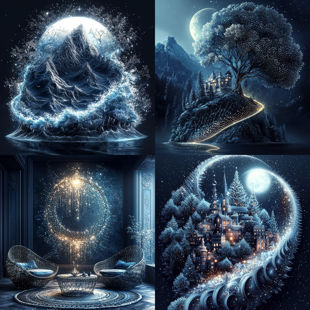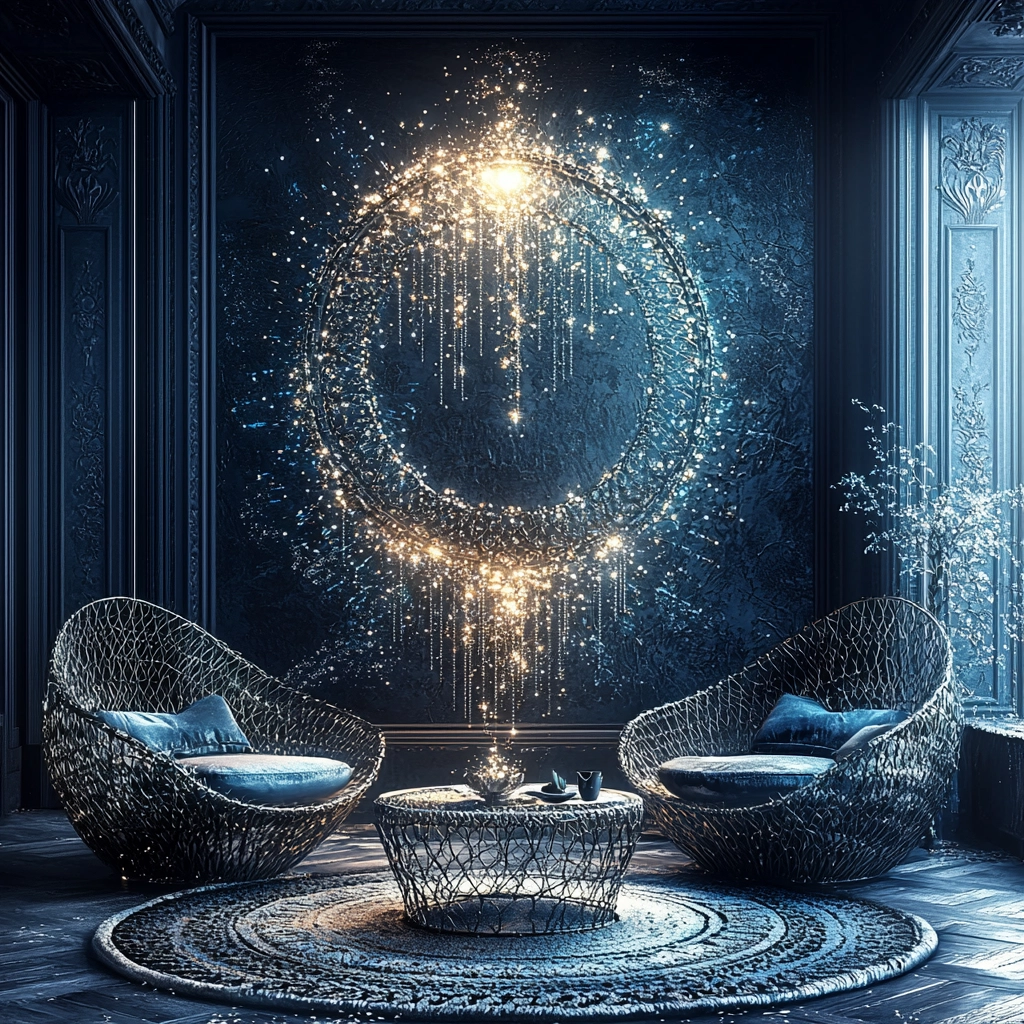 The lighting highlights create shimmering effects against a dark backdrop, emphasizing texture and depth. The spatial composition suggests a serene, encompassing atmosphere with delicate detailing accentuated by contrasting bright flecks.