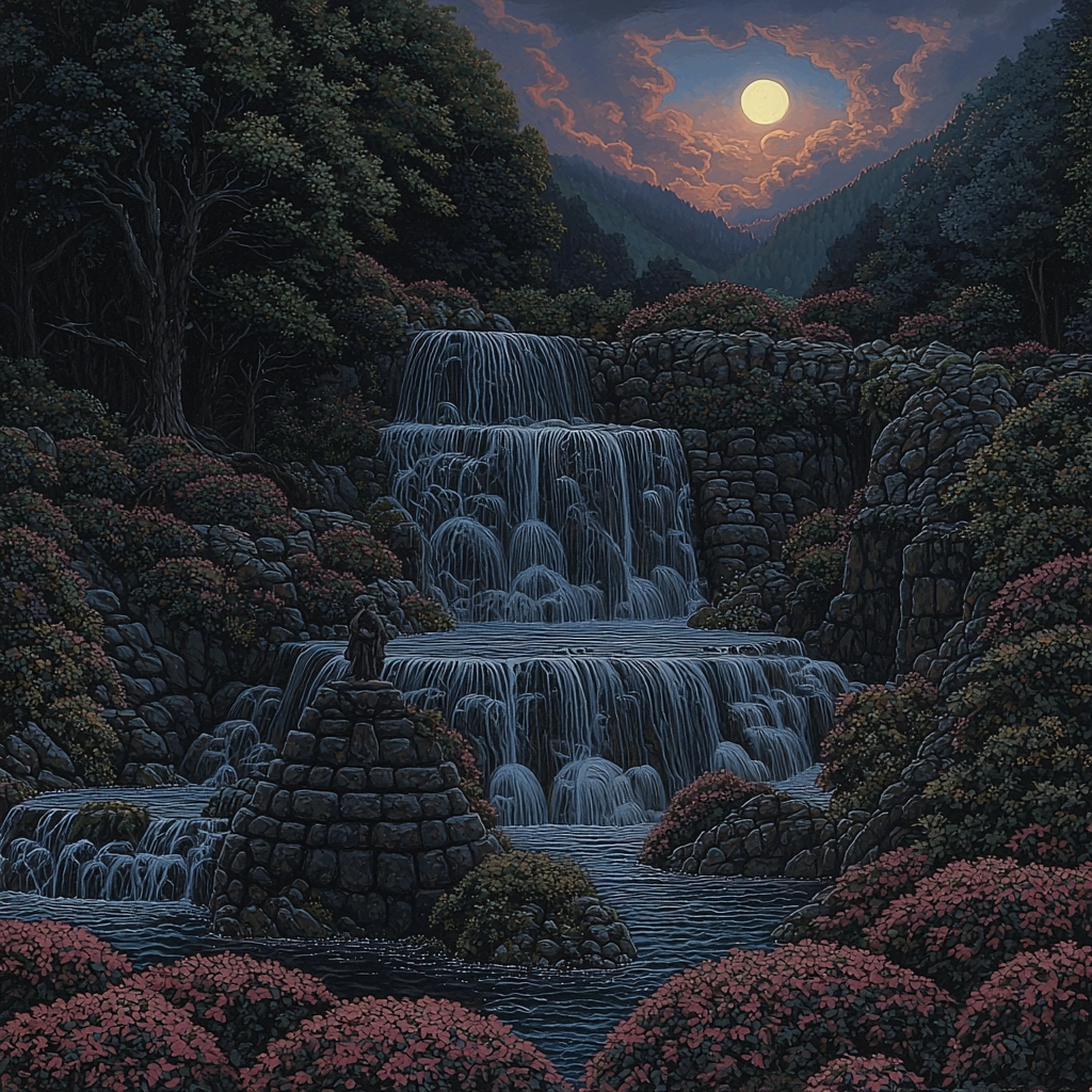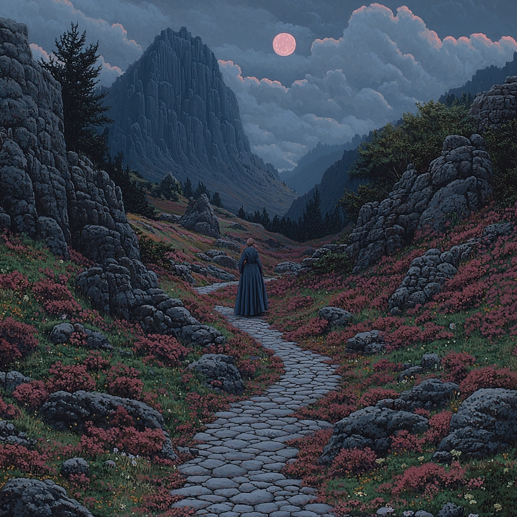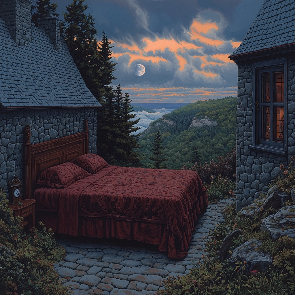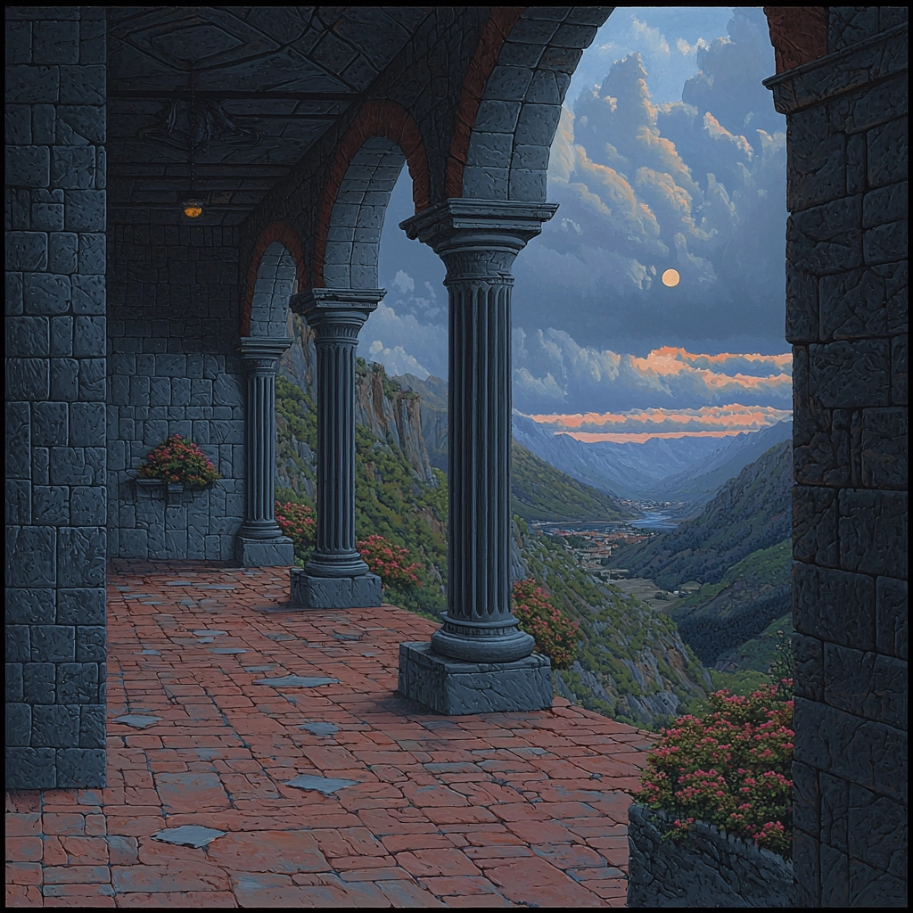 Subtle yet vivid lighting highlights architectural and natural surfaces, using cool dark blues and grays for realistic textures while wine red adds depth. Spatial elements create a dynamic dialogue of foreground and background contrast.