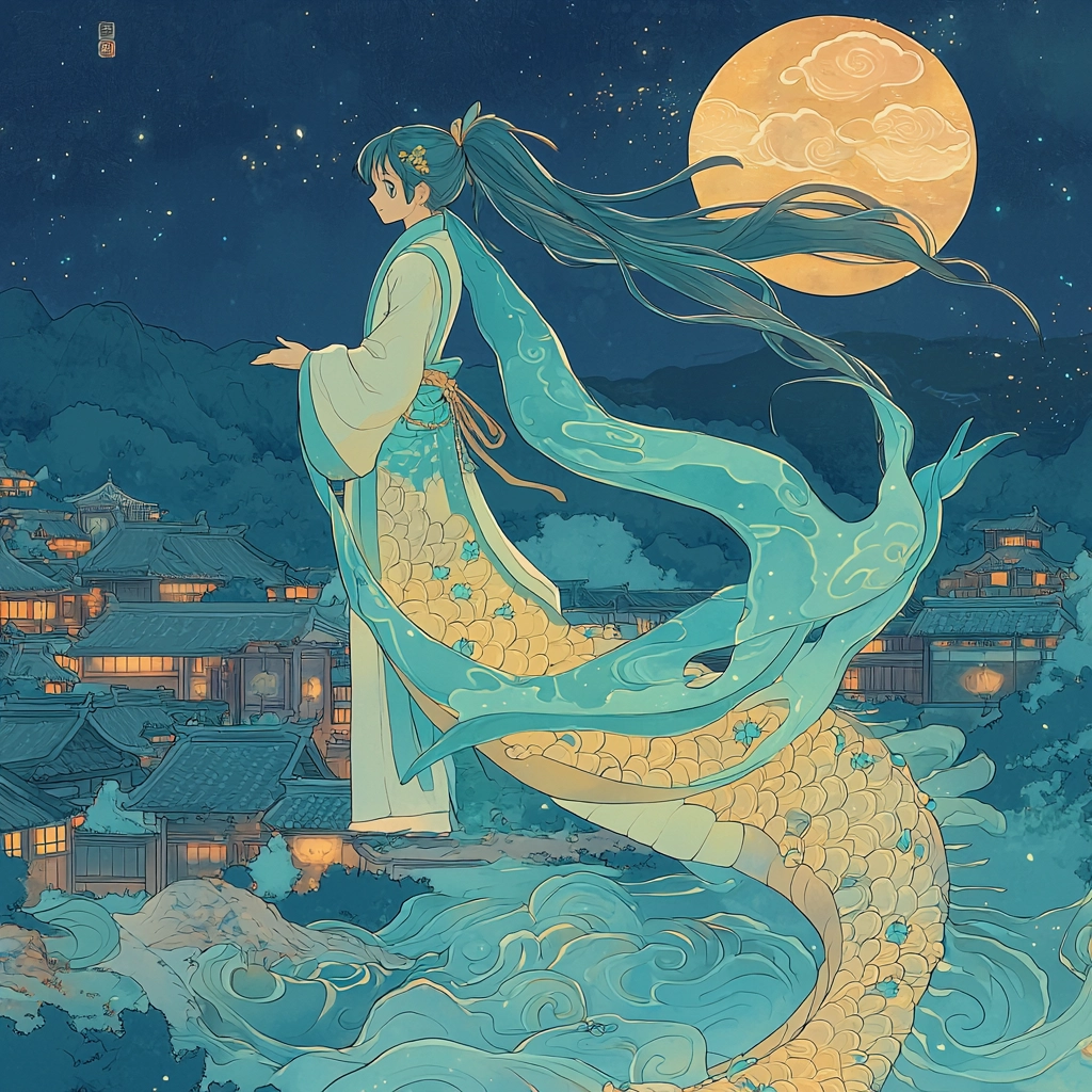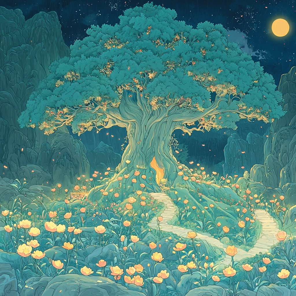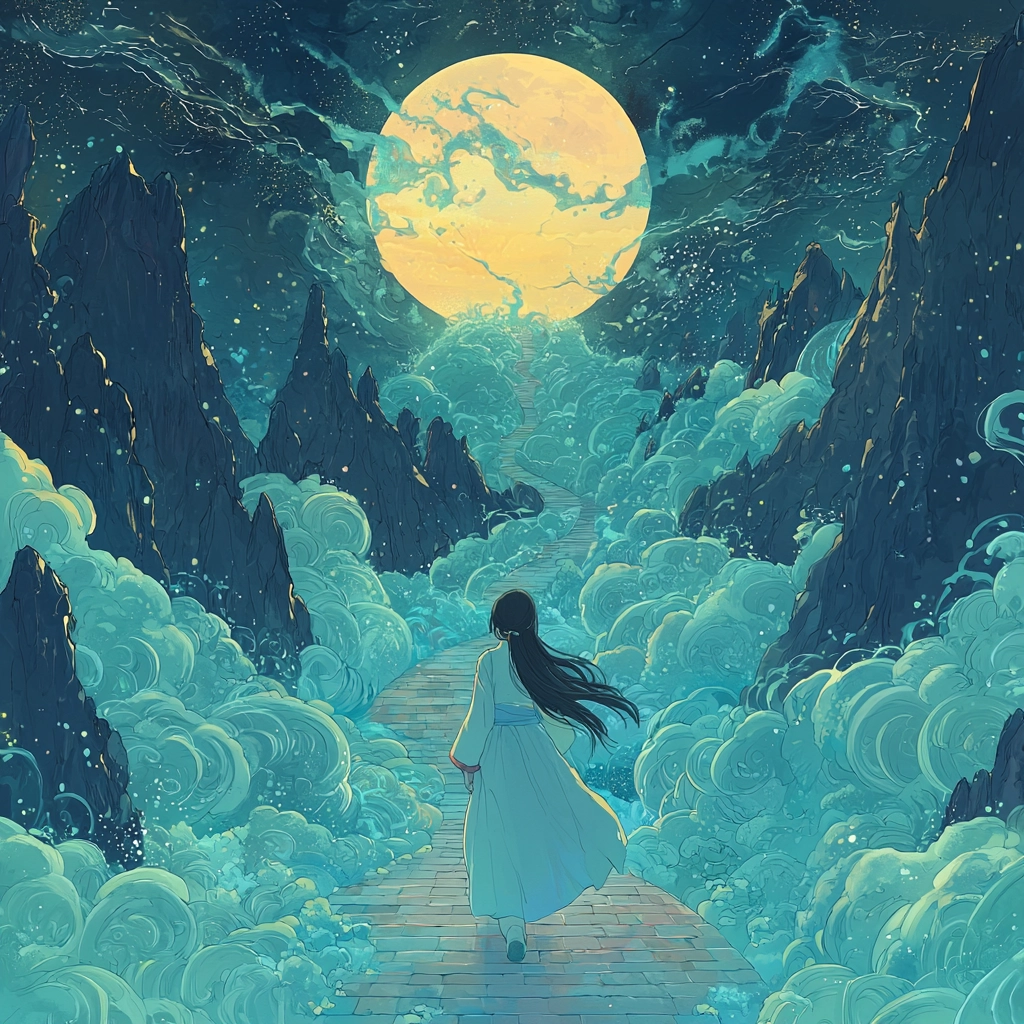 Lighting effects draw attention with strong moonlight casting deep shadows and illuminating details. The dominant cyan hues merge with complementary dark blue creating a serene visual harmony. The texture is smooth and refined, enhancing the soft and gentle atmosphere. Spatial composition is meticulously crafted to guide the viewer's eye naturally across the scene.