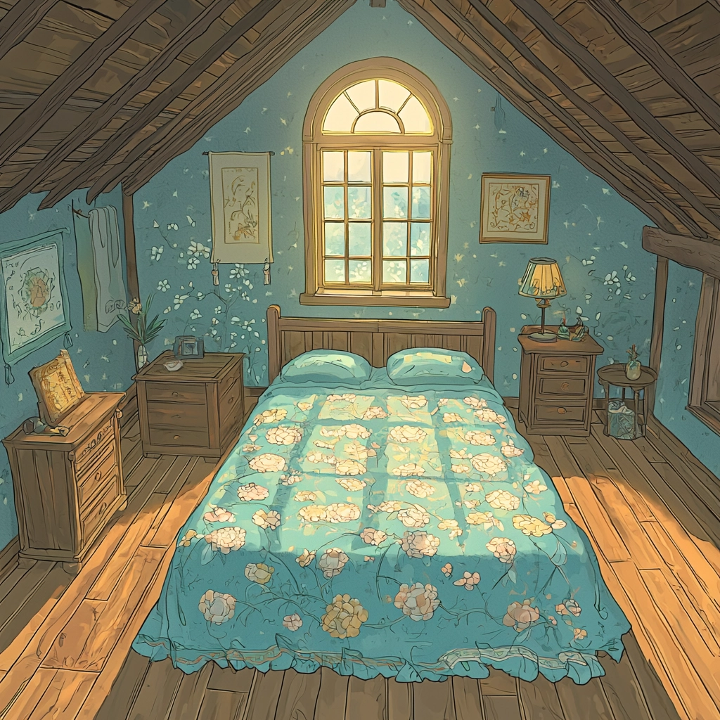 This work utilizes cyan hues and moonlight, creating a balanced and cohesive visual experience.