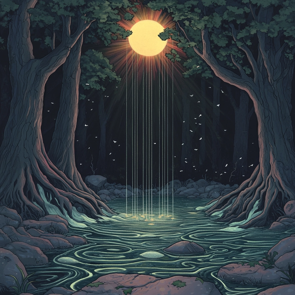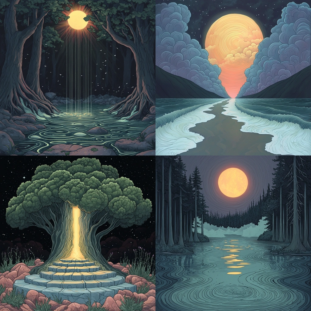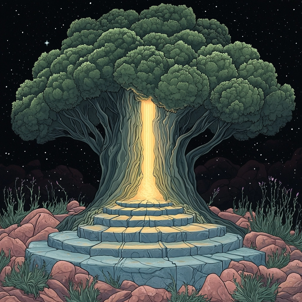 Illuminated contrast, with high saturation greens and oranges juxtaposed against dark blues. Smooth gradations define light, fostering depth. Textures are created through intricate line work, simulating natural elements.