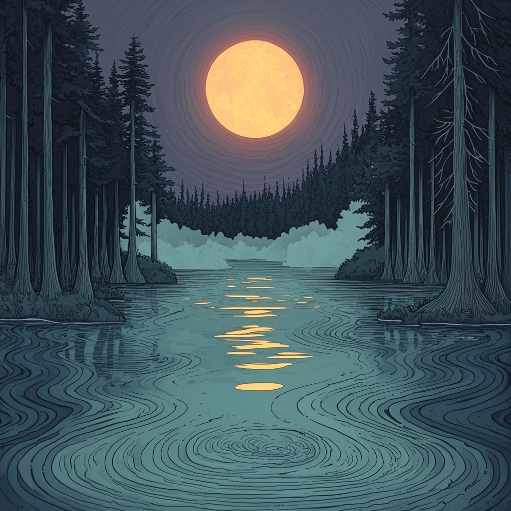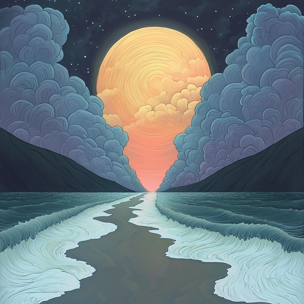 Contrasting vivid colors with midnight hues and soft gradients evoke a tranquil nocturnal landscape.