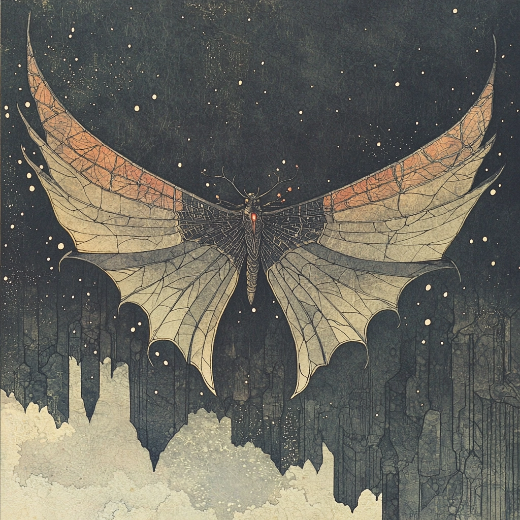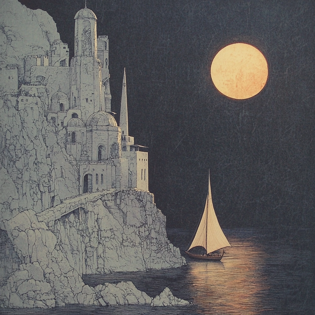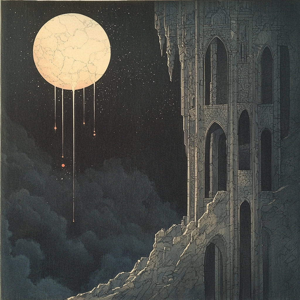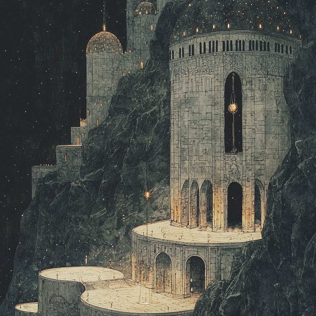 The artwork features a compelling use of muted dark blue as the night backdrop, juxtaposed with textured gray architectural elements. Beige tones gently highlight the light sources, creating depth with a calm, yet detailed texture. The spatial arrangement of the structures provides a sense of architectural scale amidst the vastness of the sky's dark blue wash.