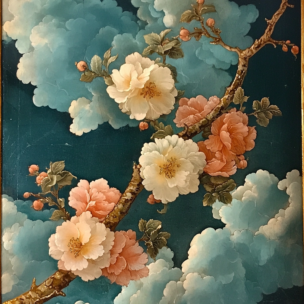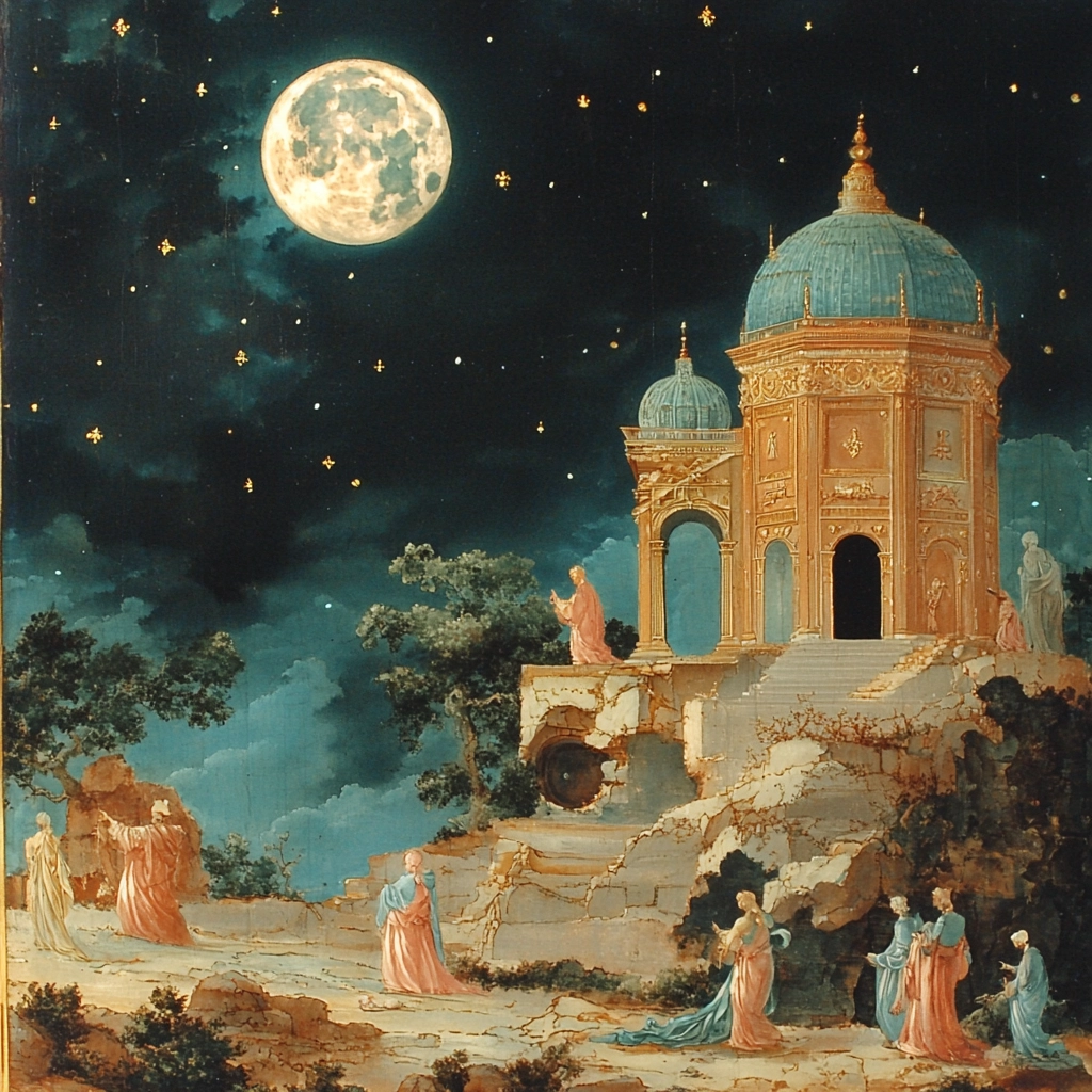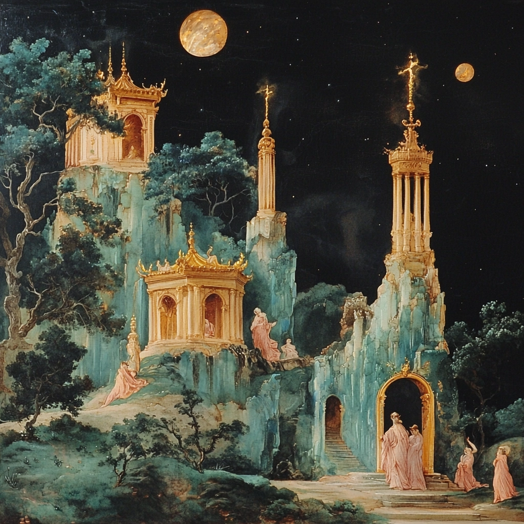The artwork emphasizes radiant night lighting with bold interplay between shadow and light. Colors appear deep and saturated, creating a vivid contrast against the luminous sky. Textures are intricately detailed, offering a sense of depth and dimension.