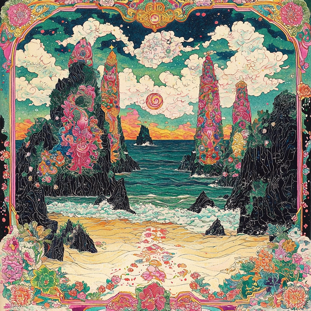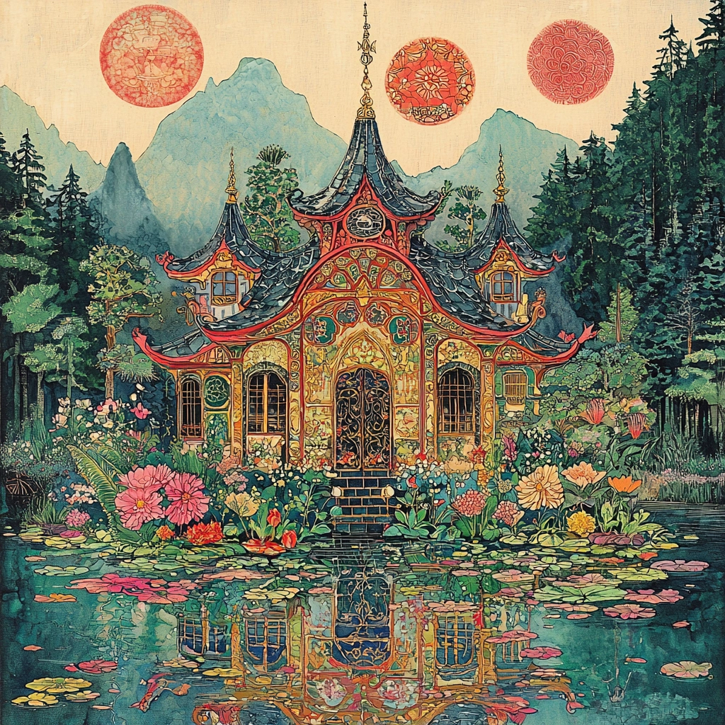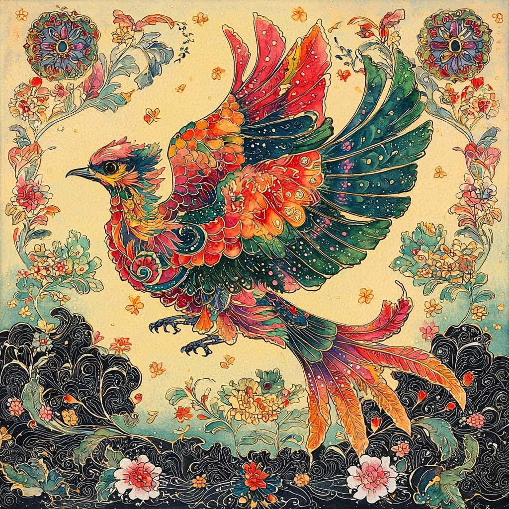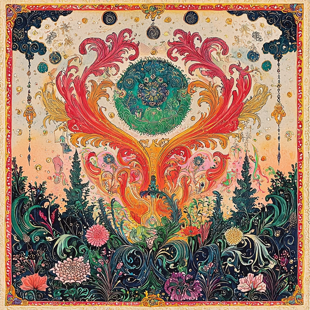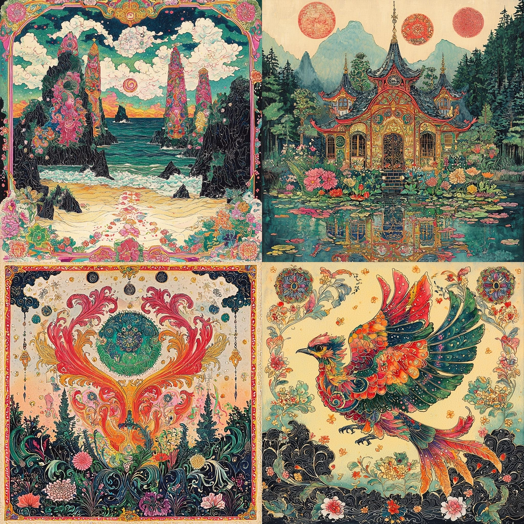 Complex ornamental compositions with vibrant color use and detailed patterning against varied backdrops.
