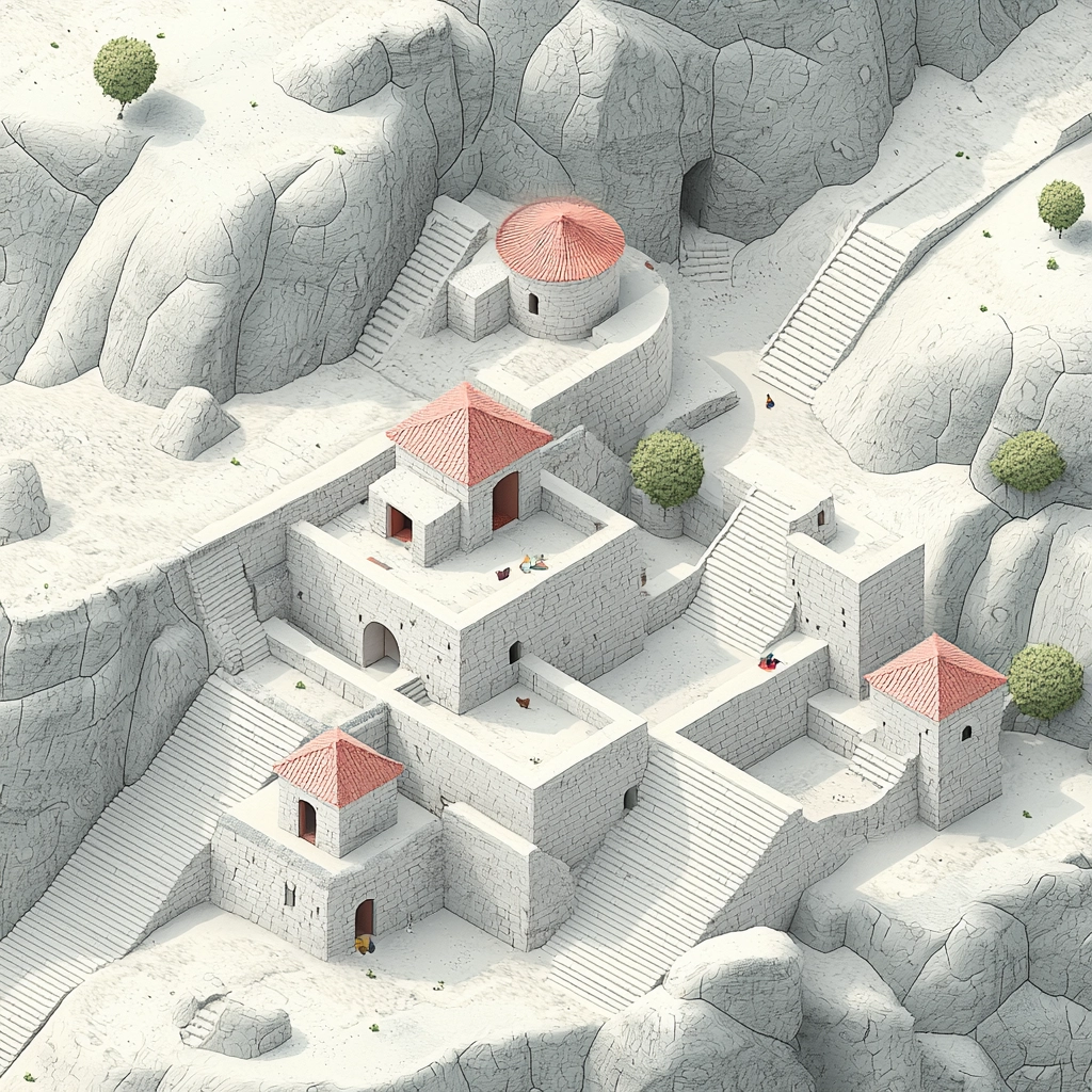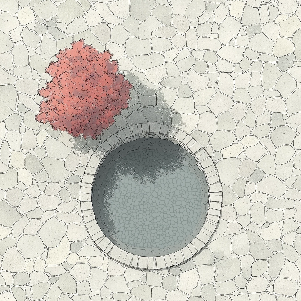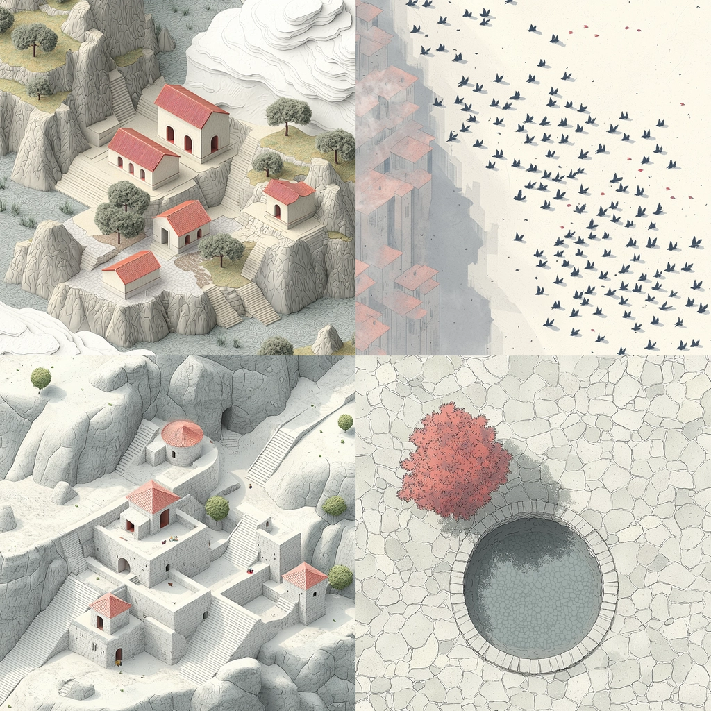 Soft lighting and muted colors blend seamlessly with the detailed architectural lines, creating a harmonious and balanced spatial arrangement. Gray provides a foundational tone, while red accents highlight specific areas, and beige nuances add warmth without overpowering the composition.