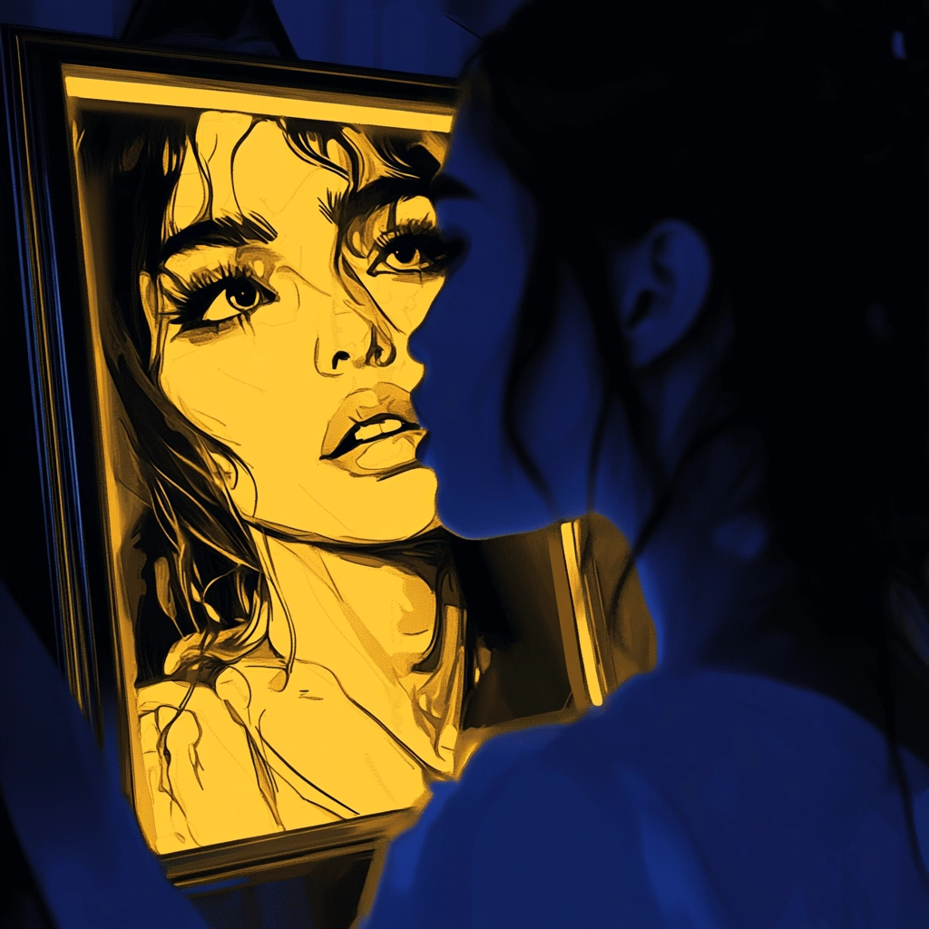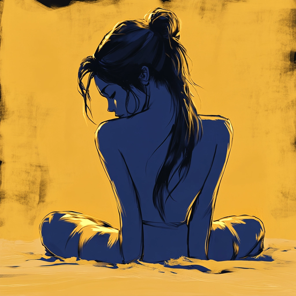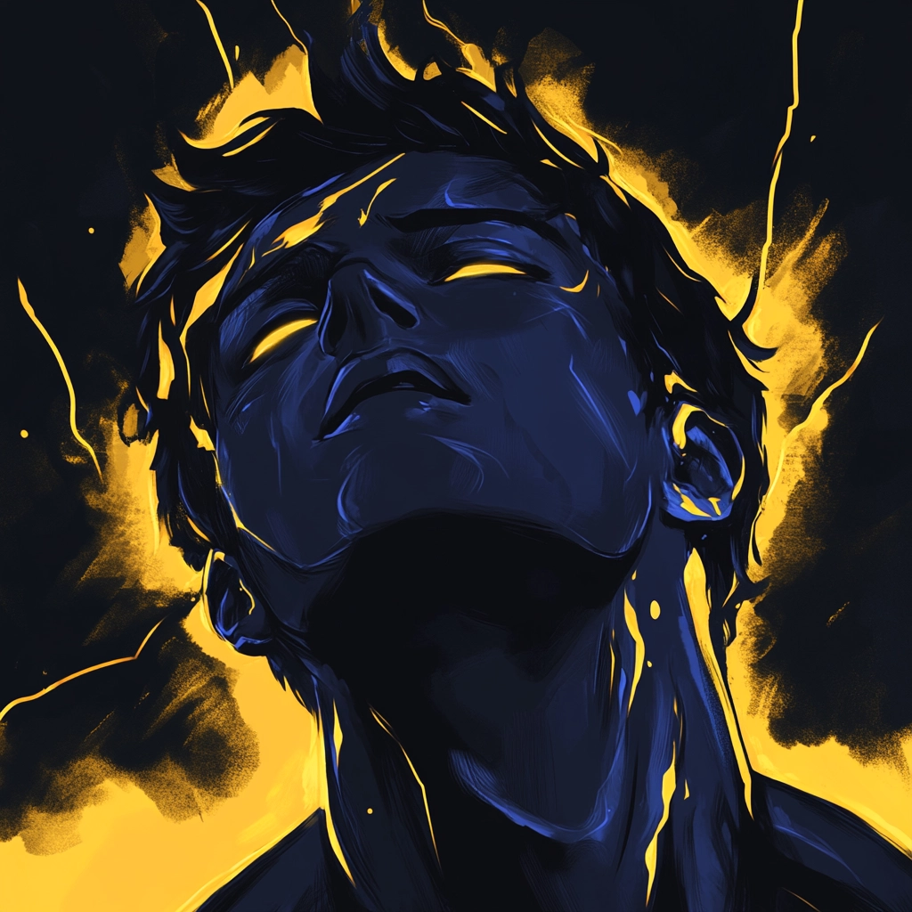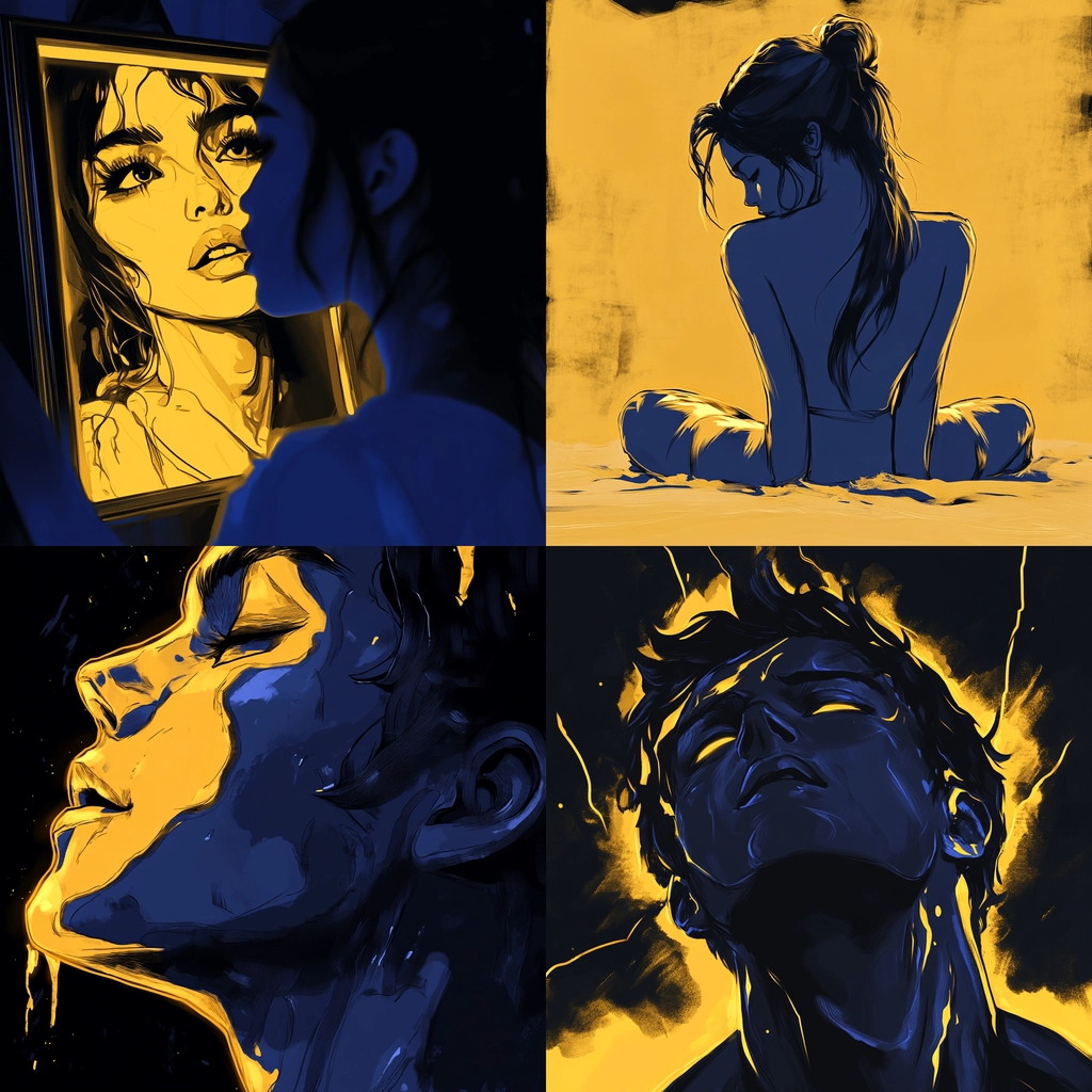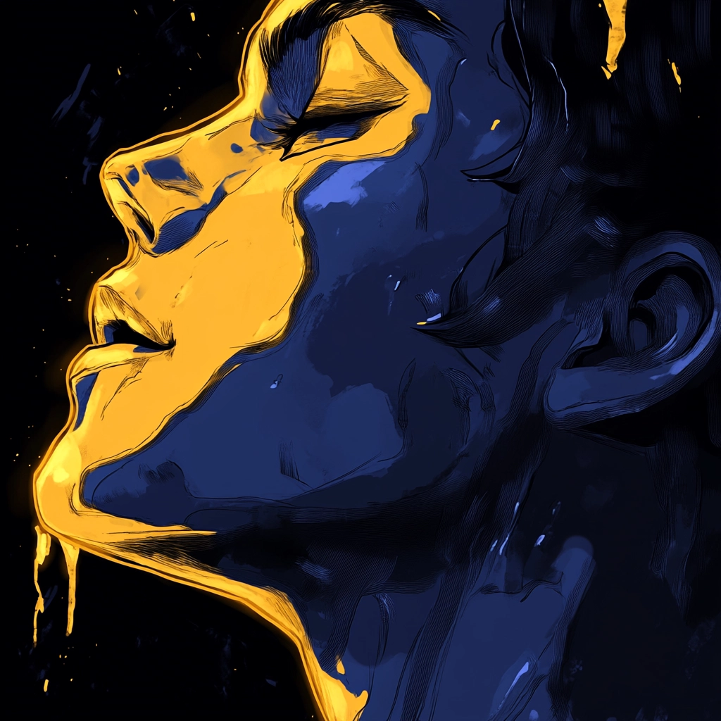 Strong interplay of dark and light areas, where blue shadows meet warm yellow highlights, introducing depth and form. The textures merge smoothly, suggesting a deliberate brushwork style that enhances definition and provides clear spatial separation.
