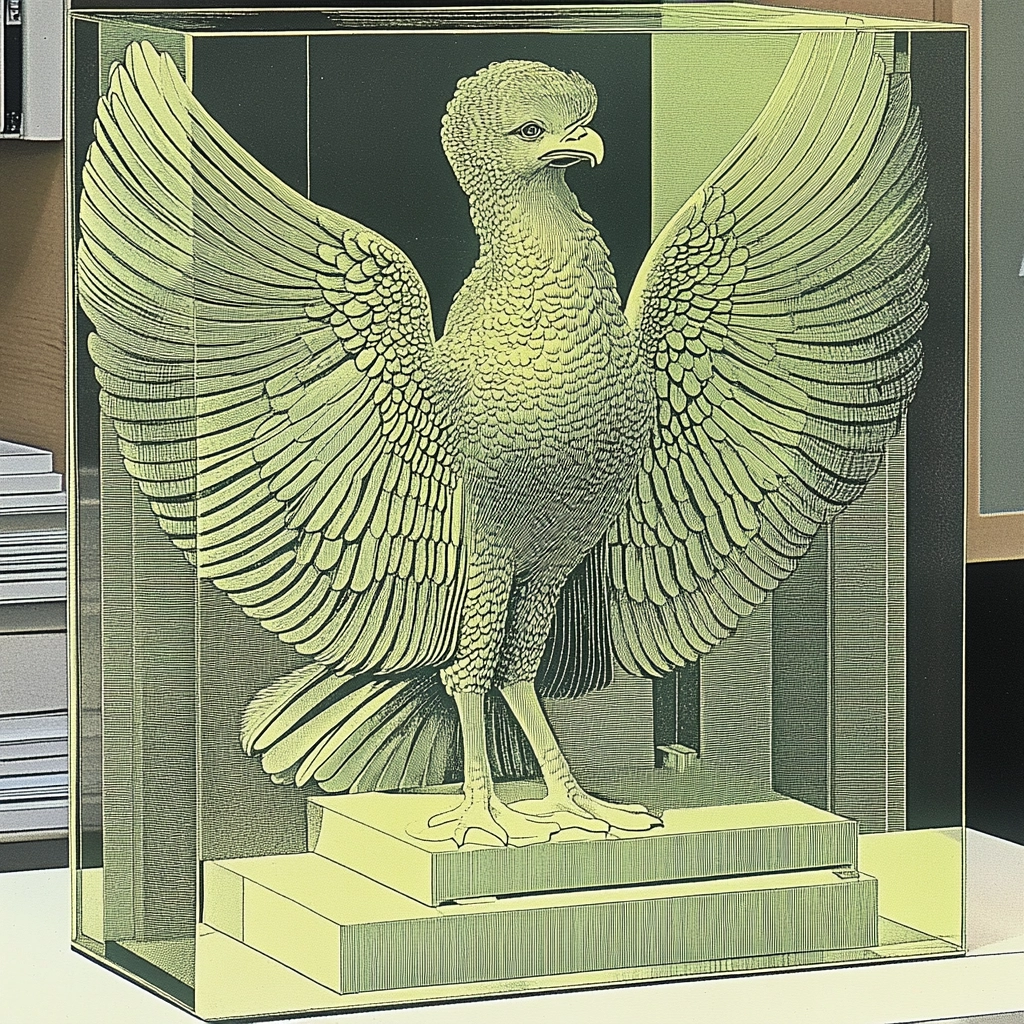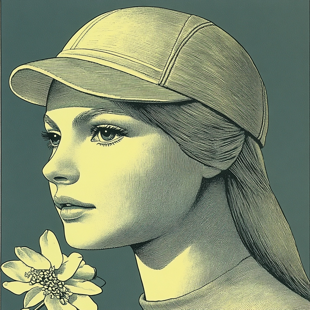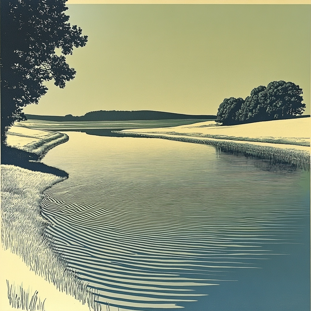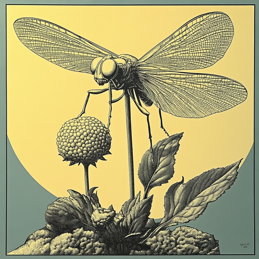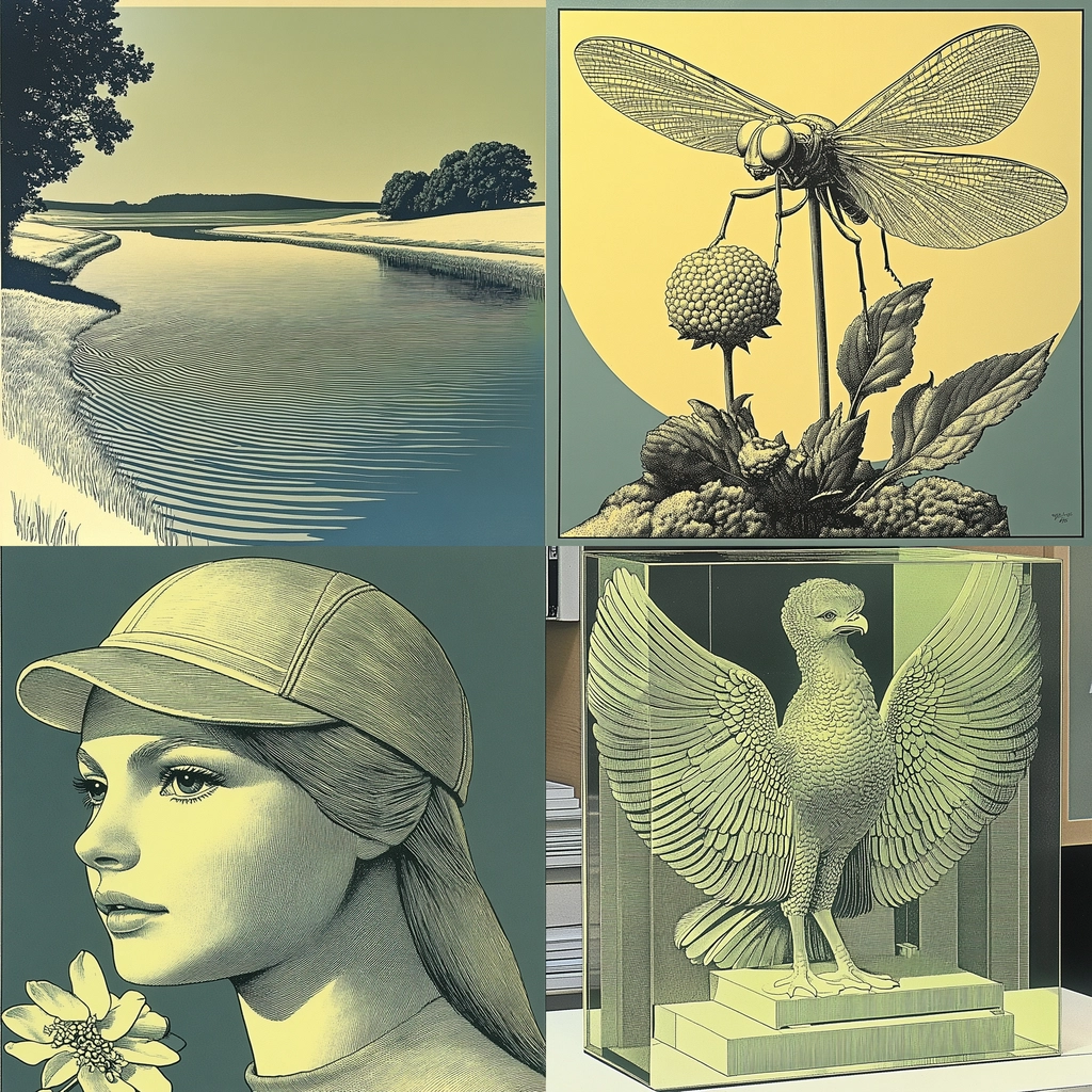 Balanced composition with muted greens and yellows accentuated by precise lines.