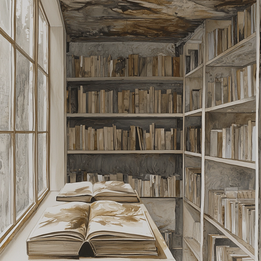This composition uses a subtle palette of beige, brown, and gray, creating gentle contrasts and a unified look. The lighting incorporates reflections and natural ambiance, enhancing depth and organic textures, with elements blending into the spatial flow.