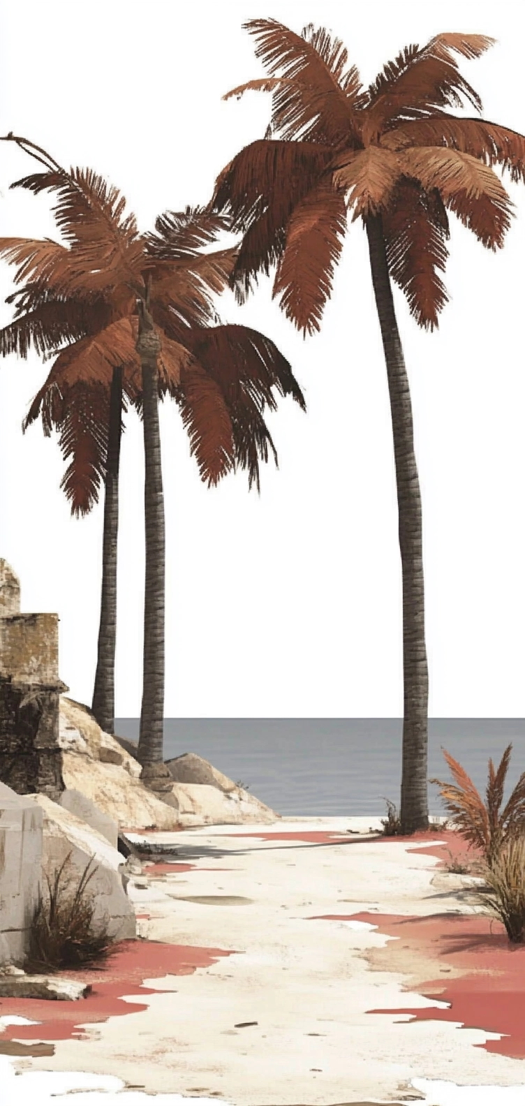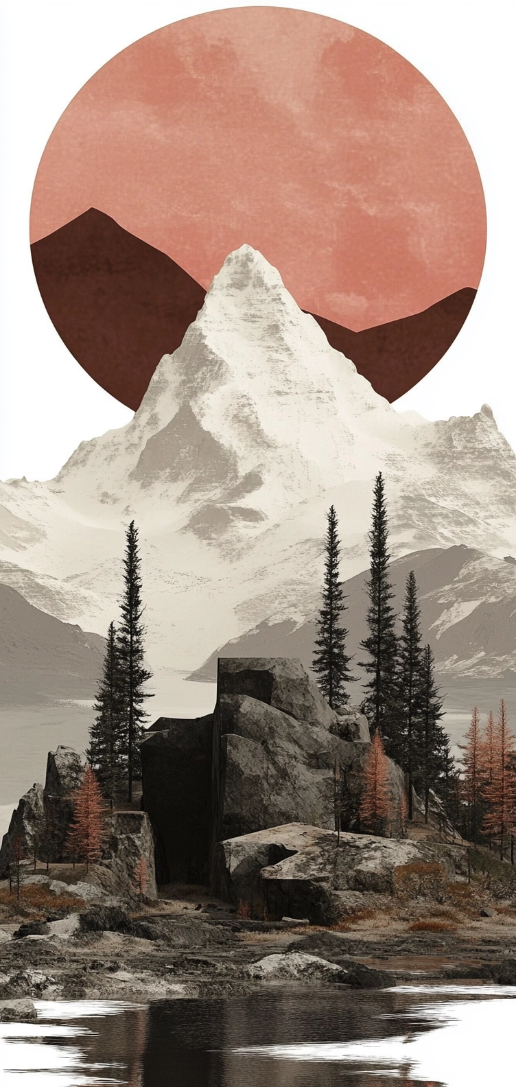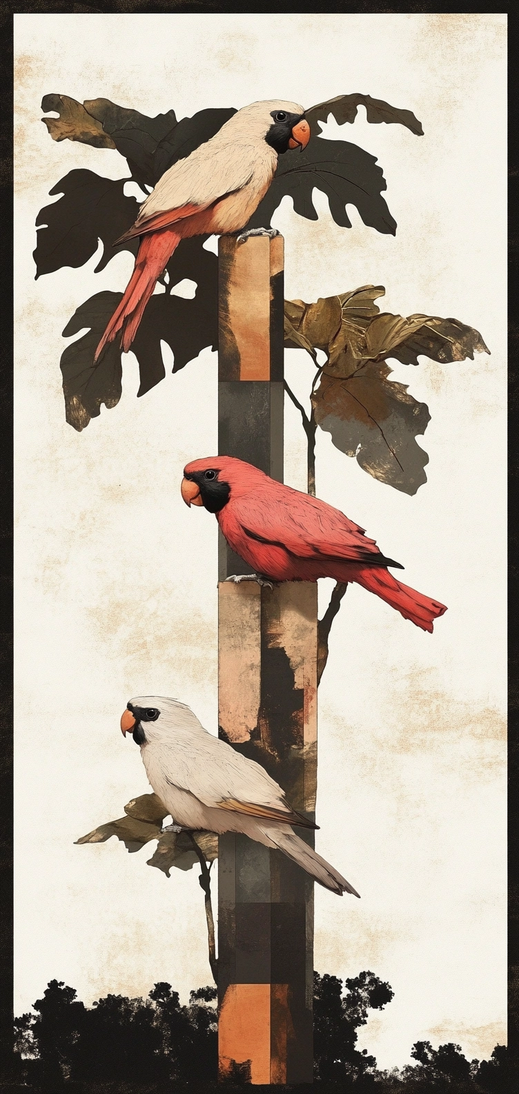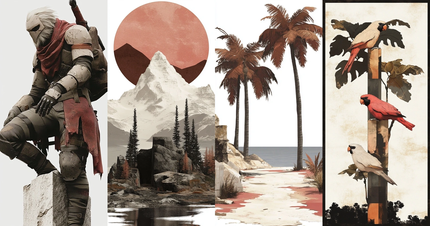 Soft lighting creates gentle shadowing; muted reds and browns with stark white offer a cohesive yet contrasting look; the texture is smooth with a matte finish; spatial arrangement provides depth and layered perspectives.