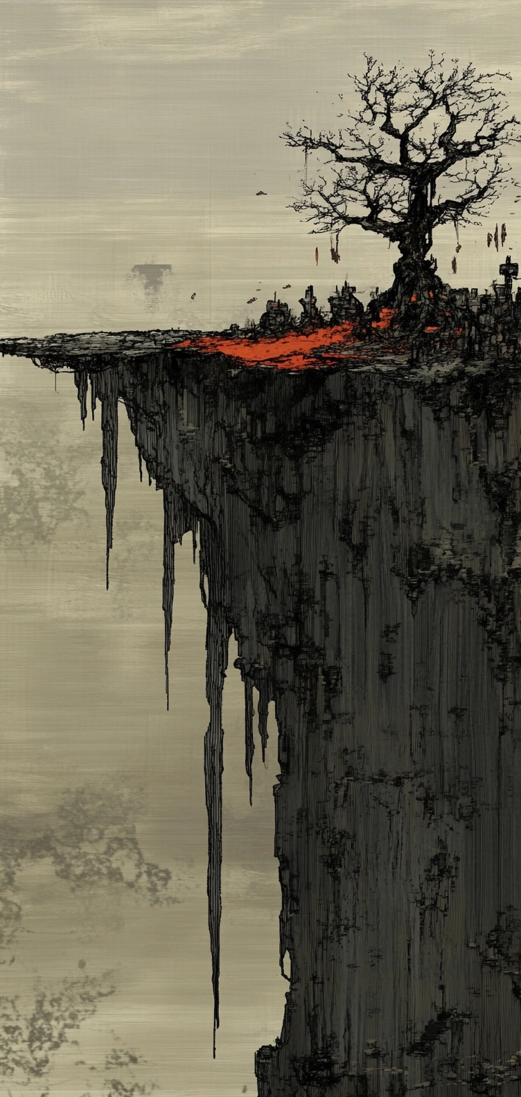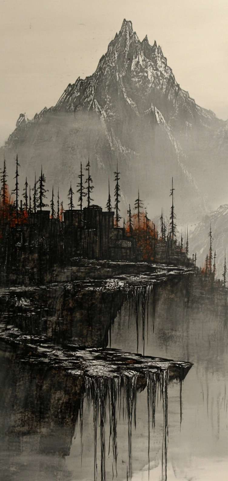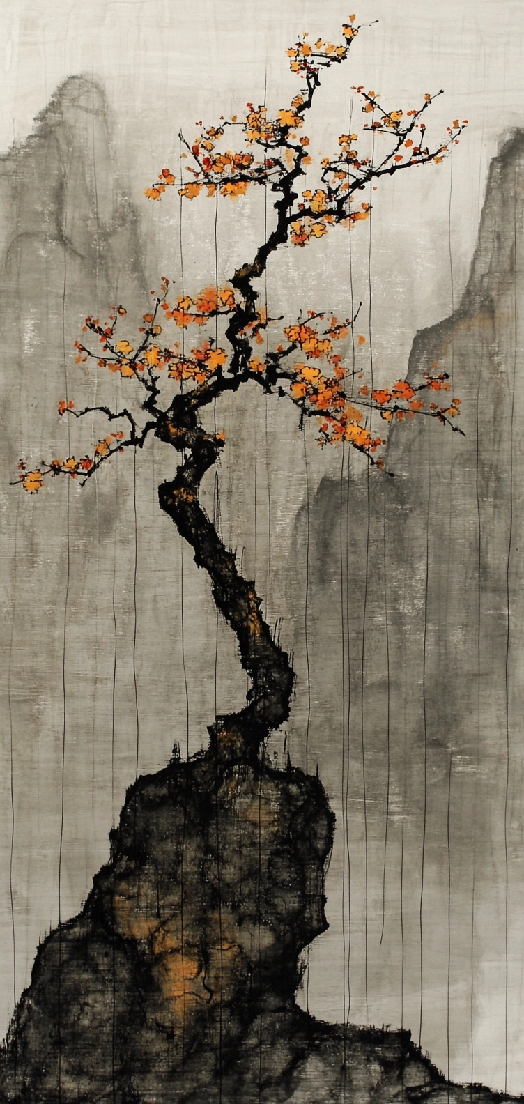 Soft, diffused lighting creates depth and mood. Predominantly muted grays and blacks are punctuated by vibrant oranges. The spatial sense is dramatic with high vertical elements and steep perspectives. Textures range from rocky surfaces to delicate branches.