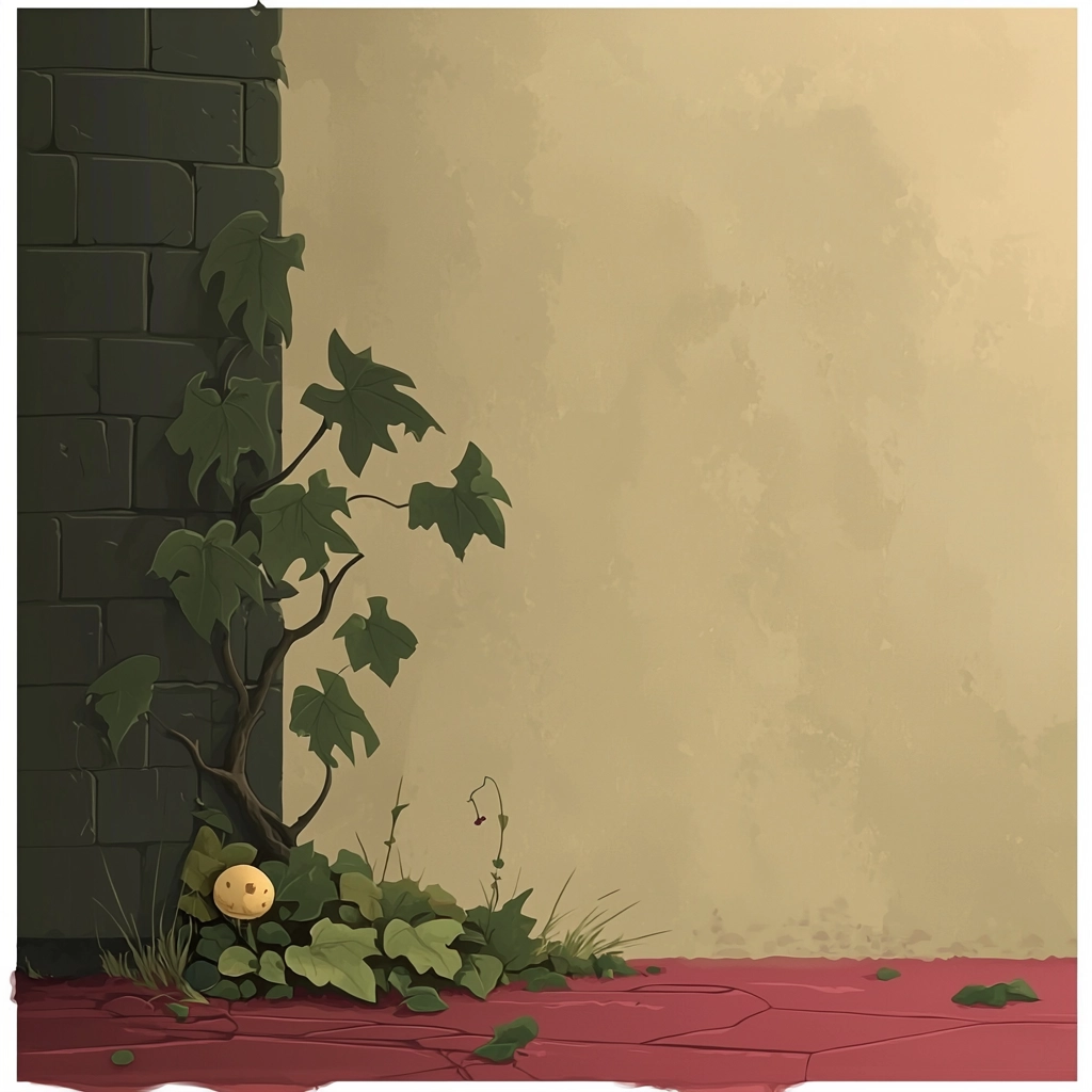 Soft lighting contrasts with textures of foliage and structure, emphasizing a mysterious yet inviting setting. The colors are earthy with subdued greens and warm beiges, while reds add subtle depth. Spatial arrangement suggests an expansive yet enclosed environment.
