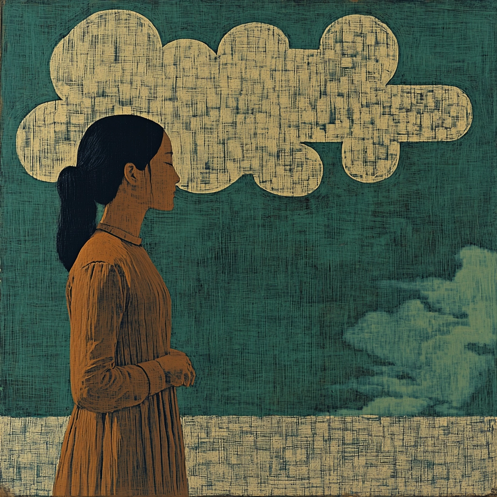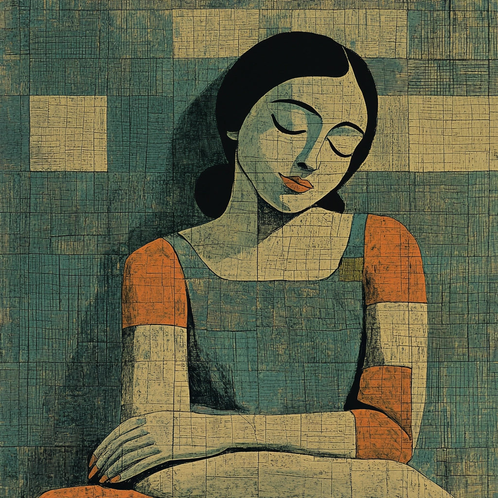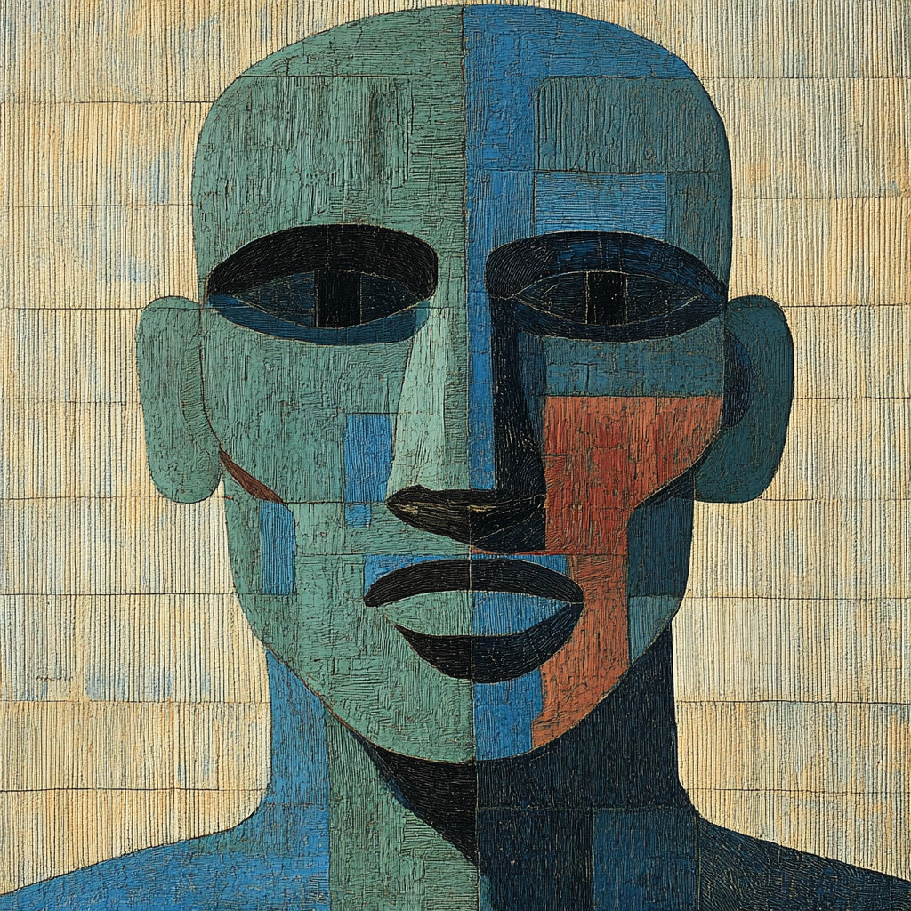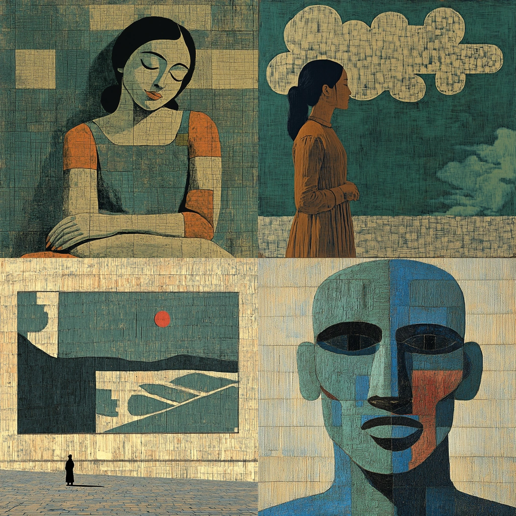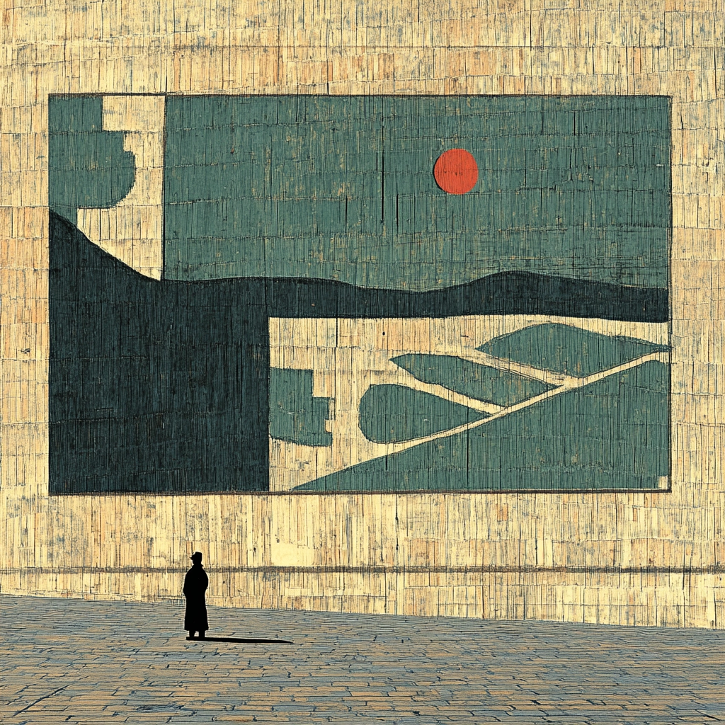 Muted earthy tones with geometric abstraction.