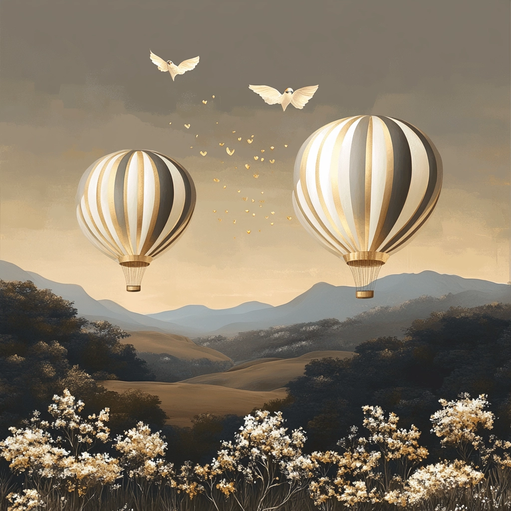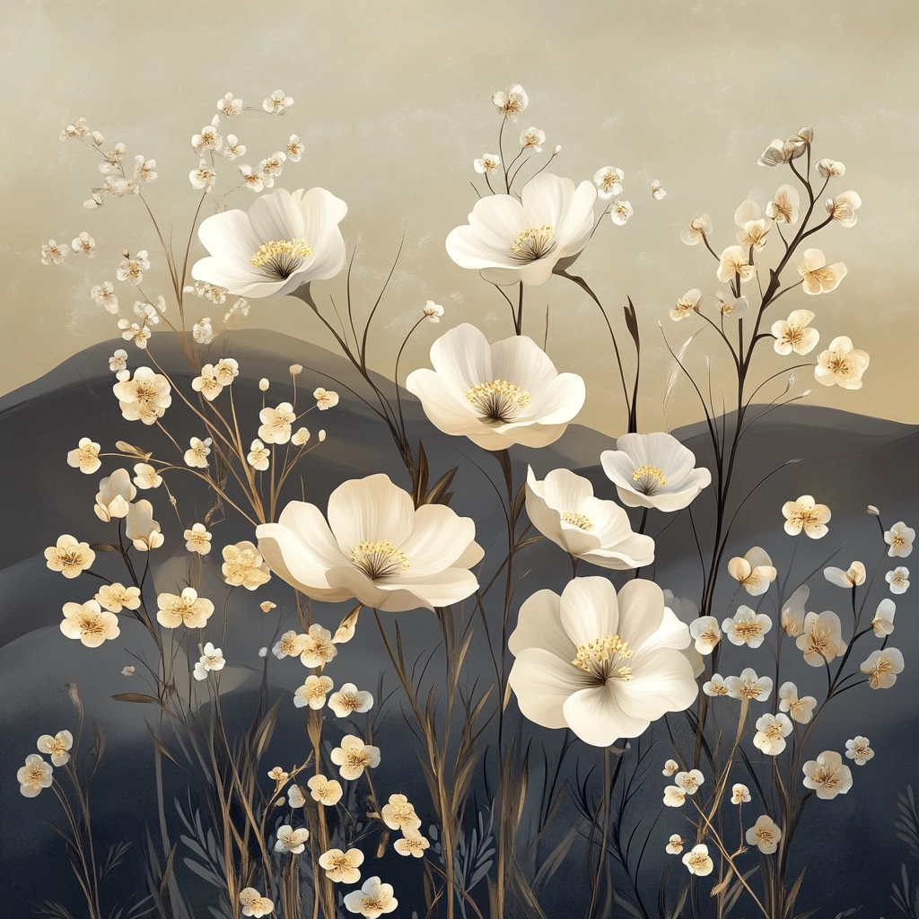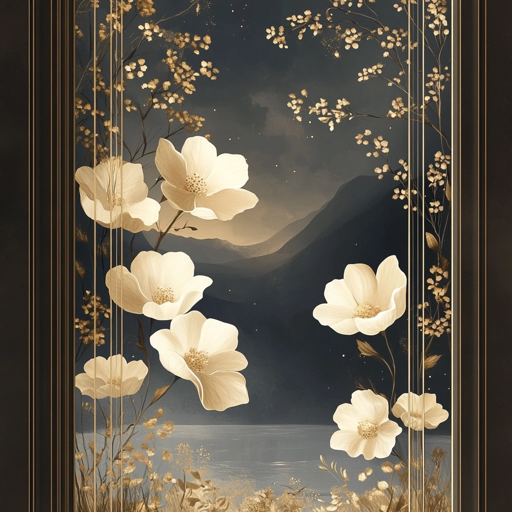 A delicate composition showcasing beige and white blooms against dark blue landscapes.