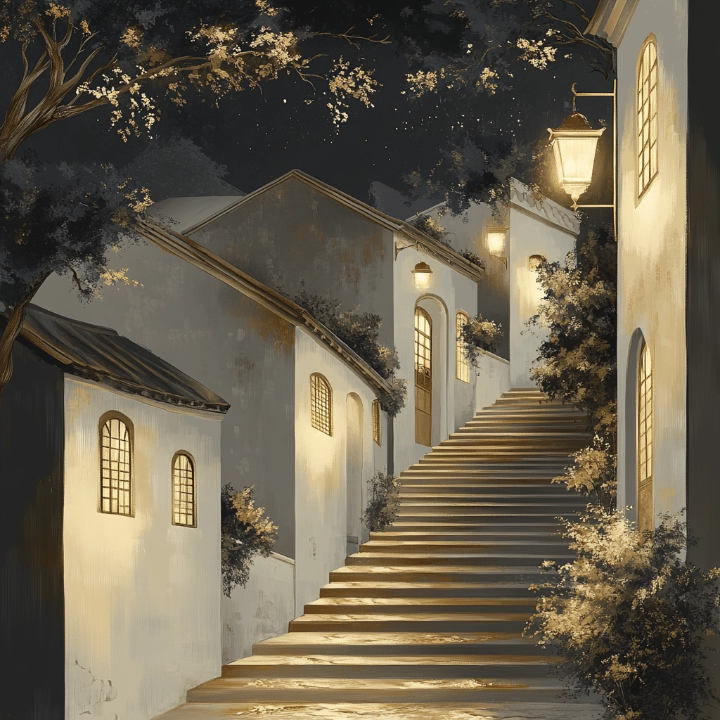 The lighting gently highlights the central floral elements, contributing to a serene spatial depth through soft contrasts between bright blossoms and shadowy backgrounds. A refined texture captures the delicate nature of each element.