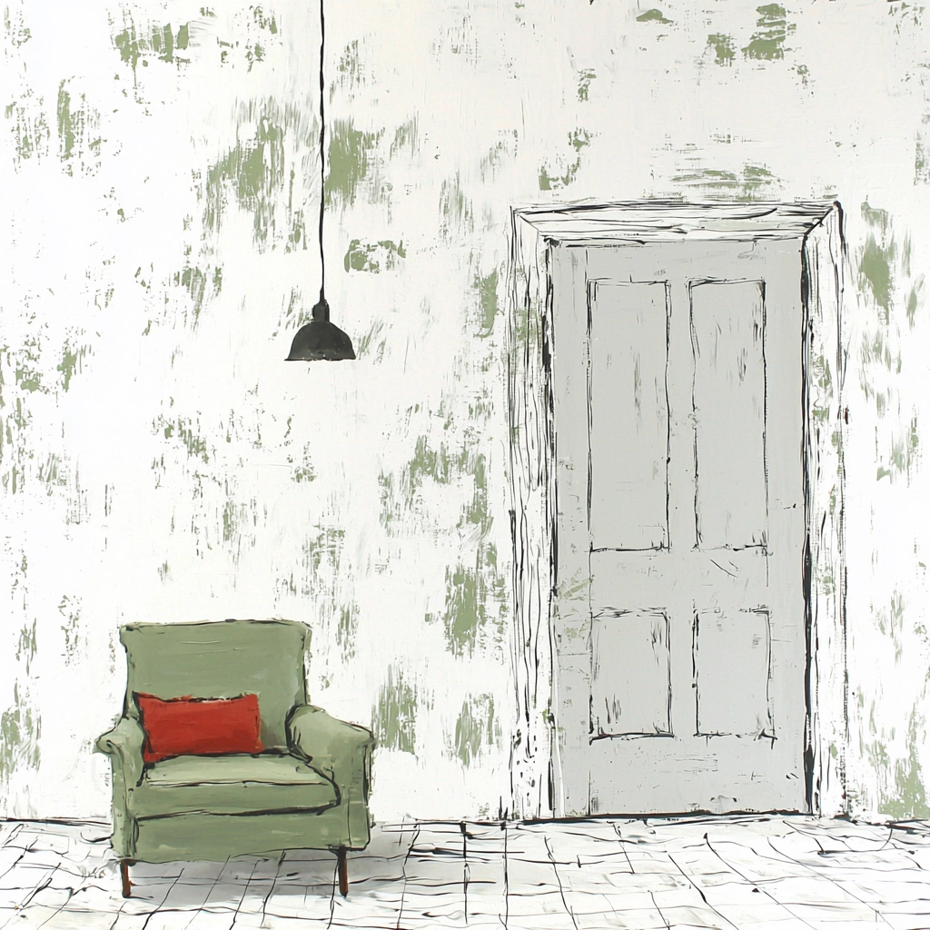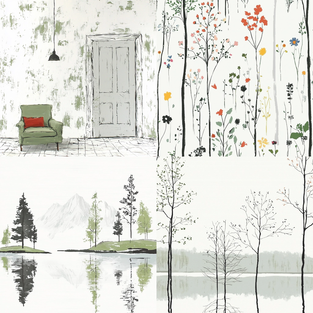 Subdued colors blend seamlessly with sketched outlines, emphasizing simplicity and clarity. Lighting varies subtly, enhancing spatial depth and offering gentle transitions in texture. Fine lines add a delicate precision to the overall composition.